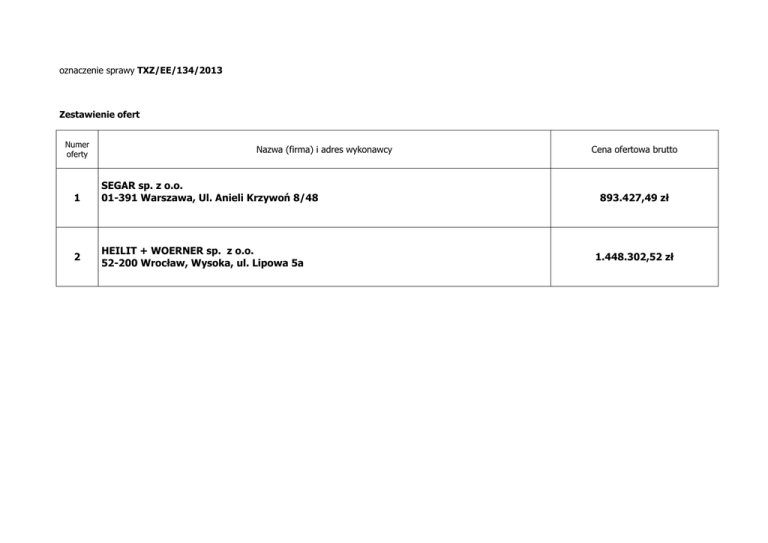 oznaczenie sprawy TXZ/EE/134/2013 Zestawienie ofert Numer oferty 1 2 Nazwa (firma) i adres wykonawcy SEGAR sp. z o.o. 01-391 Warszawa, Ul. Anieli Krzywoń 8/48 HEILIT + WOERNER sp. z o.o. 52-200 Wrocław, Wysoka, ul. Lipowa 5a Cena ofertowa brutto 893.427,49 zł 1.448.302,52 zł