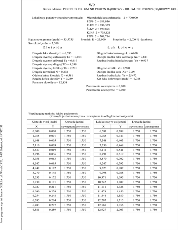 W9 Nazwa odcinka: PRZEBUD. DR. GM. NR 199017N DĄBROWY - DR. GM. NR 199020N (DĄBROWY KOL.) Lokalizacja punktów charakterystycznych: Kąt zwrotu gamma (grady) = 33,5755 Szerokość jezdni = 3,500 Wierzchołek kąta załamania 2 + 700,000 PKP9 2 + 689,936 PŁK9 2 + 696,529 ŚŁK9 2 + 699,825 KŁK9 2 + 703,121 PKP9 2 + 709,714 Promień R = 25,000 Przechyłka = 2,000 % daszkowa Klotoida Łuk kołowy Długość łuku klotoidy L = 6,593 Długość stycznej całkowitej To = 10,064 Długość stycznej głównej Tg = 6,619 Długość stycznej długiej TD = 4,399 Długość stycznej krótkiej Tk = 2,201 Długość normalnej N = 0,292 Odcięta końca klotoidy X = 6,581 Rzędna końca klotoidy Y = 0,289 Parametr klotoidy a = 12,838 Długość łuku kołowego Ł = 6,600 Odcięta środka łuku kołowego Xo = 9,811 Rzędna środka łuku kołowego Yo = 0,937 Długość strzałki Z = 0,970 Odcięta środka koła Xs = 3,294 Rzędna środka koła Ys = 25,072 Kąt łuku kołowego (grady) = 16,788 Poszerzenie wewnętrzne = 0,000 Poszerzenie zewnętrzne = 0,000 Współrzędne punktów łuków poziomych: (Krawędź jezdni wewnętrzna i zewnętrzna to odległości od osi jezdni) Autor programu: mgr inż. Jarosław GIERBA , ul. Wesoła 23/20, 15-307 Białystok, tel. 85 7427233 Klotoida w osi jezdni Krawędź jezdni X Y wewnętrzna zewnętrzna 0,000 0,000 1,750 1,055 0,001 1,648 Łuk kołowy w osi jezdni Krawędź jezdni X Y wewnętrzna zewnętrzna 1,750 6,581 0,289 1,750 1,750 1,750 1,750 6,965 0,343 1,750 1,750 0,005 1,750 1,750 7,348 0,403 1,750 1,750 2,110 0,009 1,750 1,750 7,730 0,469 1,750 1,750 2,637 0,019 1,750 1,750 8,111 0,541 1,750 1,750 3,296 0,036 1,750 1,750 8,491 0,619 1,750 1,750 3,955 0,063 1,750 1,750 8,870 0,702 1,750 1,750 4,547 0,095 1,750 1,750 9,247 0,792 1,750 1,750 4,942 0,122 1,750 1,750 9,623 0,887 1,750 1,750 5,270 0,148 1,750 1,750 9,998 0,988 1,750 1,750 5,533 0,172 1,750 1,750 10,371 1,095 1,750 1,750 5,730 0,191 1,750 1,750 10,742 1,207 1,750 1,750 5,927 0,211 1,750 1,750 11,111 1,326 1,750 1,750 6,090 0,229 1,750 1,750 11,478 1,450 1,750 1,750 6,254 0,248 1,750 1,750 11,844 1,580 1,750 1,750 6,385 0,264 1,750 1,750 12,207 1,715 1,750 1,750 6,483 0,277 1,750 1,750 12,568 1,856 1,750 1,750 6,581 0,289 1,750 1,750 12,927 2,003 1,750 1,750