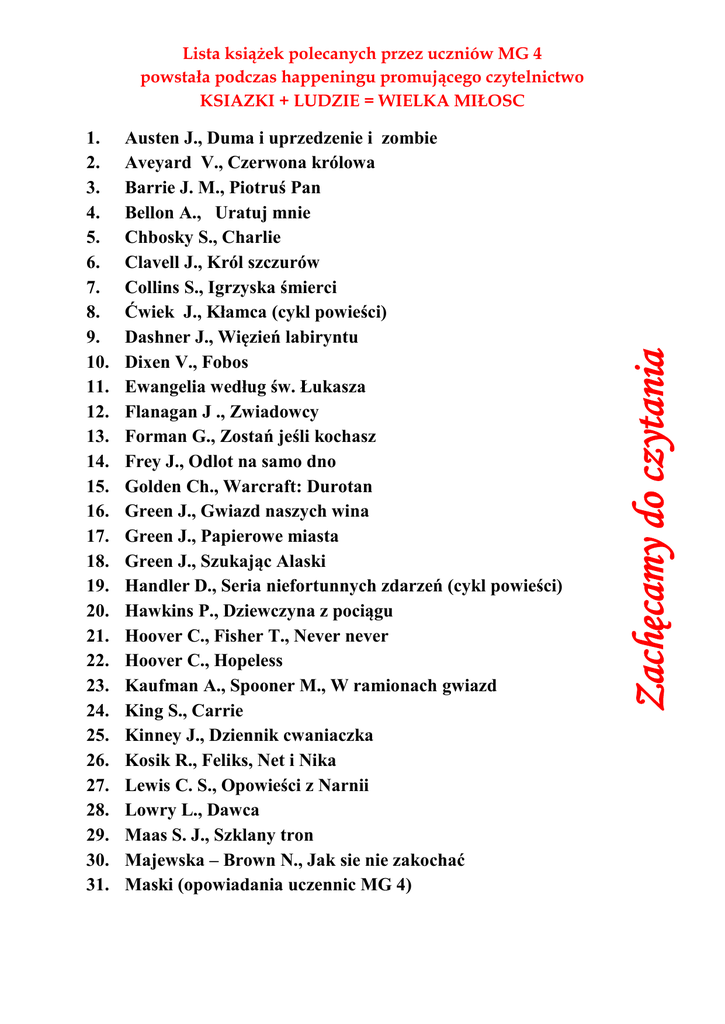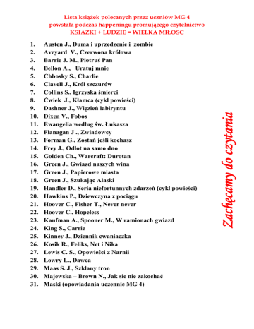 1. 2. 3. 4. 5. 6. 7. 8. 9. 10. 11. 12. 13. 14. 15. 16. 17. 18. 19. 20. 21. 22. 23. 24. 25. 26. 27. 28. 29. 30. 31. Austen J., Duma i uprzedzenie i zombie Aveyard V., Czerwona królowa Barrie J. M., Piotruś Pan Bellon A., Uratuj mnie Chbosky S., Charlie Clavell J., Król szczurów Collins S., Igrzyska śmierci Ćwiek J., Kłamca (cykl powieści) Dashner J., Więzień labiryntu Dixen V., Fobos Ewangelia według św. Łukasza Flanagan J ., Zwiadowcy Forman G., Zostań jeśli kochasz Frey J., Odlot na samo dno Golden Ch., Warcraft: Durotan Green J., Gwiazd naszych wina Green J., Papierowe miasta Green J., Szukając Alaski Handler D., Seria niefortunnych zdarzeń (cykl powieści) Hawkins P., Dziewczyna z pociągu Hoover C., Fisher T., Never never Hoover C., Hopeless Kaufman A., Spooner M., W ramionach gwiazd King S., Carrie Kinney J., Dziennik cwaniaczka Kosik R., Feliks, Net i Nika Lewis C. S., Opowieści z Narnii Lowry L., Dawca Maas S. J., Szklany tron Majewska – Brown N., Jak sie nie zakochać Maski (opowiadania uczennic MG 4) Zachęcamy do czytania Lista książek polecanych przez uczniów MG 4 powstała podczas happeningu promującego czytelnictwo KSIAZKI + LUDZIE = WIELKA MIŁOSC 32. 33. 34. 35. 36. 37. 38. 39. 40. 41. 42. 43. 44. 45. 46. 47. 48. 49. 50. 51. 52. 53. 54. 55. 56. 57. 58. 59. 60. 61. 62. 63. Meyer S., Zmierzch (cykl powieści) Montella de Ch., Gral . Bezimienny rycerz Morgenstern E., Cyrk nocny Moyes J., Zanim sie pojawiłeś Niven J., Wszystkie jasne miejsca Nowak Sz., Dziewczyny wyklęte Price L., Starter Riggs R., Miasto cieni Riggs R., Osobliwy dom pani Peregrine Riordan R., Percy Jacson i bogowie olimpijscy Roth V., Naznaczeni śmiercią Roth V., Niezgodna (cykl powieści) Rowling J. K., Harry Potter Rowling J.K., Fantastyczne zwierzęta i jak je znaleźć Saint - Exupery de A., Mały książę Sapkowski A., Wiedźmin Shepard S., Słodkie kłamstewka Showalter G., Alicja w krainie zombie Shukri L., Jestem zona szejka Smith L. J., Pamiętniki wampirów Sparks N., I wciąż ją kocham Sparks N., Jesienna miłość Sparks N., Najdłuższa podróż Sparks N., Ostatnia piosenka Sparks N., Pamiętnik Sparks N., Szczęściarz Sparks N., Dla ciebie wszystko Szczygielski M., Za niebieskimi drzwiami Tolkien J. R. R., Władca pierścieni Tolkien J.R.R., Hobbit Yovanoff, B., Wyśnione miejsca Zoe S., Girl Online Zachęcamy do czytania Lista książek polecanych przez uczniów MG 4 powstała podczas happeningu promującego czytelnictwo KSIAZKI + LUDZIE = WIELKA MIŁOSC