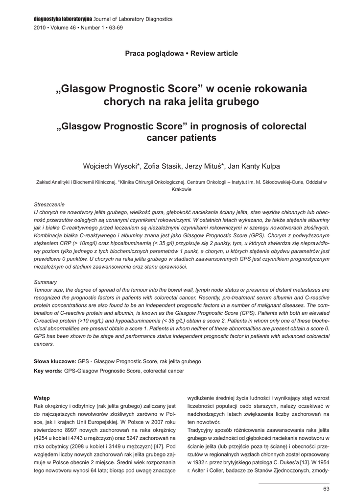 diagnostyka laboratoryjna Journal of Laboratory Diagnostics 2010 • Volume 46 • Number 1 • 63-69 Praca poglądowa • Review article „Glasgow Prognostic Score” w ocenie rokowania chorych na raka jelita grubego „Glasgow Prognostic Score” in prognosis of colorectal cancer patients Wojciech Wysoki*, Zofia Stasik, Jerzy Mituś*, Jan Kanty Kulpa Zakład Analityki i Biochemii Klinicznej, *Klinika Chirurgii Onkologicznej, Centrum Onkologii – Instytut im. M. Skłodowskiej-Curie, Oddział w Krakowie Streszczenie U chorych na nowotwory jelita grubego, wielkość guza, głębokość naciekania ściany jelita, stan węzłów chłonnych lub obecność przerzutów odległych są uznanymi czynnikami rokowniczymi. W ostatnich latach wykazano, że także stężenia albuminy jak i białka C-reaktywnego przed leczeniem są niezależnymi czynnikami rokowniczymi w szeregu nowotworach złośliwych. Kombinacja białka C-reaktywnego i albuminy znana jest jako Glasgow Prognostic Score (GPS). Chorym z podwyższonym stężeniem CRP (> 10mg/l) oraz hipoalbuminemią (< 35 g/l) przypisuje się 2 punkty, tym, u których stwierdza się nieprawidłowy poziom tylko jednego z tych biochemicznych parametrów 1 punkt, a chorym, u których stężenie obydwu parametrów jest prawidłowe 0 punktów. U chorych na raka jelita grubego w stadiach zaawansowanych GPS jest czynnikiem prognostycznym niezależnym od stadium zaawansowania oraz stanu sprawności. Summary Tumour size, the degree of spread of the tumour into the bowel wall, lymph node status or presence of distant metastases are recognized the prognostic factors in patients with colorectal cancer. Recently, pre-treatment serum albumin and C-reactive protein concentrations are also found to be an independent prognostic factors in a number of malignant diseases. The combination of C-reactive protein and albumin, is known as the Glasgow Prognostic Score (GPS). Patients with both an elevated C-reactive protein (>10 mg/L) and hypoalbuminaemia (< 35 g/L) obtain a score 2. Patients in whom only one of these biochemical abnormalities are present obtain a score 1. Patients in whom neither of these abnormalities are present obtain a score 0. GPS has been shown to be stage and performance status independent prognostic factor in patients with advanced colorectal cancers. Słowa kluczowe:GPS - Glasgow Prognostic Score, rak jelita grubego Key words:GPS-Glasgow Prognostic Score, colorectal cancer Wstęp Rak okrężnicy i odbytnicy (rak jelita grubego) zaliczany jest do najczęstszych nowotworów złośliwych zarówno w Polsce, jak i krajach Unii Europejskiej. W Polsce w 2007 roku stwierdzono 8997 nowych zachorowań na raka okrężnicy (4254 u kobiet i 4743 u mężczyzn) oraz 5247 zachorowań na raka odbytnicy (2098 u kobiet i 3149 u mężczyzn) [47]. Pod względem liczby nowych zachorowań rak jelita grubego zajmuje w Polsce obecnie 2 miejsce. Średni wiek rozpoznania tego nowotworu wynosi 64 lata; biorąc pod uwagę znaczące wydłużenie średniej życia ludności i wynikający stąd wzrost liczebności populacji osób starszych, należy oczekiwać w nadchodzących latach zwiększenia liczby zachorowań na ten nowotwór. Tradycyjny sposób różnicowania zaawansowania raka jelita grubego w zależności od głębokości naciekania nowotworu w ścianie jelita (lub przejście poza tę ścianę) i obecności przerzutów w regionalnych węzłach chłonnych został opracowany w 1932 r. przez brytyjskiego patologa C. Dukes’a [13]. W 1954 r. Aslter i Coller, badacze ze Stanów Zjednoczonych, zmody63 Glasgow Prognostic Score w ocenie rokowania chorych na raka jelita grubego Tabela I. Klasyfikacja Dukes’a i jej modyfikacja wg Astler i Coller. stopień wg Dukes’a stopień wg Astler i Coller A Invasion into but not through the bowel wall A Limited to mucosa B Invasion through the bowel wall but not involving lymph nodes B1 Extending into muscularis propria but not penetrating through it; nodes not involved B2 Penetrating through muscularis propria; nodes not involved C Involvement of lymph nodes C1 Extending into muscularis propria but not penetrating through it. Nodes involved C2 Penetrating through muscularis propria. Nodes involved D Widespread metastases D Distant metastatic spread fikowali i rozszerzyli tę klasyfikację (tab. I) [3]. Niezależnie od pierwotnej klasyfikacji Dukes’a i jej późniejszych modyfikacji, w ramach systemu klasyfikacji zaawansowania nowotworów złośliwych opracowanego przez UICC i AJCC, systematycznie rozwijano klasyfikację TNM opartą na ocenie głębokości naciekania raka w głąb ściany jelita (cecha T), obecności przerzutów w regionalnych węzłach chłonnych (cecha N) i obecności przerzutów odległych (cecha M). W 2010 roku ukazała się, znacznie zmieniona w stosunku do poprzednich wersji, 7. rewizja tej klasyfikacji [1]. Ocena rokowania chorych U chorych na nowotwory złośliwe znajomość szeregu parametrów klinicznych, a m.in. histologicznego typu nowotworu, stadium zaawansowania procesu chorobowego, stopnia histologicznej złośliwości, ploidii DNA ma istotne znaczenie dla doboru właściwej metody terapii, zapewnienia optymalnej jej efektywności jak i przewidywania rokowania. Akceptowane od dawna czynniki rokownicze takie jak wielkość guza, głębokość naciekania ściany jelita, liczba węzłów chłonnych z przerzutami, czy obecność przerzutów odległych służą jako podstawa klasyfikacji TNM oraz klasyfikacji Dukes’a, Aslter’a i Coller’a. Informacje dotyczące zaawansowania i przewidywanego ryzyka nawrotu raka stanowią m.in. podstawę przy podejmowaniu decyzji o wdrożeniu leczenia uzupełniającego i rodzaju tej terapii. Jednak, jak wskazuje na to wiele danych klinicznych, tradycyjne klasyfikacje rokownicze nie pozwalają na precyzyjną identyfikację chorych, którzy z powodu dużego zagrożenia nawrotem i zgonem wymagają uzupełniającej chemioterapii. Z tych względów znaczny nacisk kładziony jest 