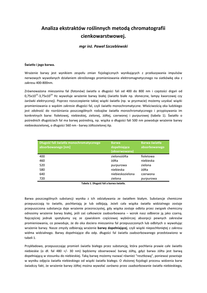 Analiza ekstraktów roślinnych metodą chromatografii cienkowarstwowej. mgr inż. Paweł Szczeblewski Światło i jego barwa. Wrażenie barwy jest wynikiem zespołu zmian fizjologicznych wynikających z przekazywania impulsów nerwowych wywołanych działaniem określonego promieniowania elektromagnetycznego na siatkówkę oka z zakresu 400-800nm. Zrównoważona mieszanina fal (fotonów) światła o długości fali od 400 do 800 nm i częstości drgao od 15 14 0,75x10 -3,75x10 Hz wywołuje wrażenie barwy białej (światło białe np. słoneczne, lampy kwarcowej czy żarówki elektrycznej). Poprzez rozszczepienie takiej wiązki światła (np. w pryzmacie) możemy uzyskad wiązki promieniowania o wąskim zakresie długości fal, czyli światło monochromatyczne. Właściwością oka ludzkiego jest zdolnośd do rozróżniania poszczególnych rodzajów światła monochromatycznego i przypisywania im konkretnych barw: fioletowej, niebieskiej, zielonej, żółtej, czerwonej i purpurowej (tabela 1). Światło o pośrednich długościach fal ma barwę pośrednią, np. wiązka o długości fali 500 nm powoduje wrażenie barwy niebieskozielonej, o długości 560 nm - barwy żółtozielonej itp. Długośd fali światła monochromatycznego absorbowanego [nm] 400 460 520 580 640 720 Barwa dopełniająca (obserwowana) zielonożółta żółta purpurowa niebieska niebieskozielona zielona Barwa światła absorbowanego fioletowa niebieska zielona żółta czerwona purpurowa Tabela 1. Długośd fali a barwa światła. Barwa poszczególnych substancji wynika z ich odziaływania ze światłem białym. Substancje chemiczne przepuszczają to światło, pochłaniają je lub odbijają. Jeżeli cała wiązka światła widzialnego zostaje przepuszczona substancja daje wrażenie przezroczystej, gdy wiązka zostaje odbita przez związek chemiczny odnosimy wrażenie barwy białej, jeśli zaś całkowicie zaabsorbowana – wzrok nasz odbierze ją jako czarną. Najczęściej jednak spotykamy się ze zjawiskiem częściowej wybiórczej absorpcji pewnych zakresów promieniowania, co powoduje, że do oka dociera mieszanina fal przepuszczonych lub odbitych o wywołując wrażenie barwy. Nasze zmysły odbierają wrażenie barwy dopełniającej, czyli wiązki niepochłoniętej z zakresu widma widzialnego. Barwy dopełniające dla odp. długości fal światła zaabsorbowanego przedstawiono w tabeli 1. Przykładowo, przepuszczając promieo światła białego przez substancję, która pochłania prawie całe światło niebieskie (o dł. fal 480 +/- 30 nm) będziemy obserwowad barwę żółtą, gdyż barwa żółta jest barwą dopełniającą w stosunku do niebieskiej. Taką barwę możemy nazwad również "resztkową", ponieważ powstaje w wyniku odjęcia światła niebieskiego od wiązki światła białego. O złożonej fizjologii procesu widzenia barw świadczy fakt, że wrażenie barwy żółtej można wywoład zarówno przez zaadsorbowanie światła niebieskiego, którego centrum odpowiada fali o dł. 480 nm, z światła białego o widmie ciągłym, jak i za pomocą światła o jednej długości fali, tzn. 580 nm. Ponadto, wrażenie barwy żółtej można wywoład poprzez zmieszanie światła czerwonego i zielonego. Znajomośd sposobu powstawania barwy jest istotna, ponieważ pozwala przewidywad barwę związku chemicznego o określonym widmie UV-Vis w zakresie światła widzialnego. Struktura związku a jego barwa. Z chemicznego punktu widzenia ważne jest ustalenie zależności pomiędzy budową cząsteczki organicznej a jej zdolnością do absorbowania określonego promieniowania widzialnego, co jest warunkiem wystąpienia barwy substancji absorbującej. Warunkiem barwności związku jest obecnośd ugrupowania atomowego, zwanego grupą chromoforową (gr. chróma- kolor + gr. phorós- niosący). Podstawowe chromofory to ugrupowania wiązao nienasyconych, w tym aromatycznych zawierających elektrony typu π (rys poniżej). Pod wpływem promieniowania świetlnego (fotonów) następuje wzbudzenie cząsteczki, posiadającej takie ugrupowanie, które polega na przeniesieniu elektronu wiązania π z orbitalu wiążącego na antywiążący (ze stanu podstawowego do jednego ze stanów wzbudzonych). Powstanie barwy lub jej zmiana są zawsze związane z deformacją normalnej struktury elektronowej cząsteczki. Obecnośd w cząsteczce zw. organicznego jednej silnej grupy chromoforowej związanej z pierścieniem aromatycznym jest wystarczająca, aby wywoład barwę związku. Pojedyncze słabe chromofory wprawdzie powodują przesunięcie maksimum absorpcji związku z dalekiego nadfioletu (100-200nm) w kierunku widzialnej granicy światła (400nm), ale nie są w stanie wywoład jego barwy. Warunkiem pojawienia się barwy jest występowanie kilku takich ugrupowao sprzężonych lub skumulowanych ze sobą. Przedstawicielami połączeo organicznych tego typu są m.in występujące w komórkach roślinnych naftochinony, z charakterystycznym układem chinoidowym. Barwniki roślinne i ich identyfikacja na podstawie barwy. Barwniki roślinne są niezwykle istotne dla prawidłowego funkcjonowania roślin. Chlorofile i karotenoidy uczestniczą w procesach fotosyntezy, flawonoidy biorą udział w procesach oksydoredukcyjnych i wykazują właściwości owado- i grzybobójcze, jeszcze inne pełnią funkcję ekologiczną (atraktanty). Związki te występują w komórkach roślinnych najczęściej w postaci związanej z cukrami (glikozydy), rzadziej z białkami. Barwniki rozpuszczalne w wodzie (antocyjany, betalainy) znajdują się w cytozolu, natomiast te o charakterze hydrofobowym występują w plastydach: chlorofil w chloroplastach, a karotenoidy w chromoplastach. Barwniki roślinne stanowią niejednolitą grupę związków pod względem budowy chemicznej. W zależności od ich struktury wyróżnia się: • Chlorofile- oparte na bazie heterocyklicznych pierścieni pięcioczłonowych. • Karotenoidy (karoteny, ksantofile) – 40-węglowe terpe