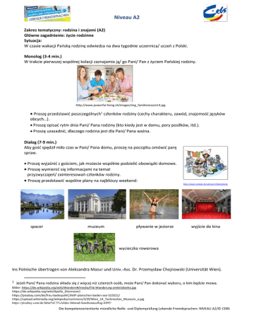 Niveau A2 Zakres tematyczny: rodzina i znajomi (A2) Główne zagadnienie: życie rodzinne Sytuacja: W czasie wakacji Pańską rodzinę odwiedza na dwa tygodnie uczennica/ uczeń z Polski. Monolog (3-4 min.) W trakcie pierwszej wspólnej kolacji zaznajamia ją/ go Pani/ Pan z życiem Pańskiej rodziny. http://www.powerful-living.ch/images/img_familienessen14.jpg Proszę przedstawić poszczególnych1 członków rodziny (cechy charakteru, zawód, znajomość języków obcych…). Proszę opisać rytm dnia Pani/ Pana rodziny (kto kiedy jest w domu, pory posiłków, itd.). Proszę uzasadnić, dlaczego rodzina jest dla Pani/ Pana ważna. Dialog (7-9 min.) Aby gość spędził miło czas w Pani/ Pana domu, proszę na początku omówić parę spraw. Proszę wyjaśnić z gościem, jak możecie wspólnie podzielić obowiązki domowe. Proszę wymienić się informacjami na temat przyzwyczajeń/ zainteresowań członków rodziny. Proszę przedstawić wspólne plany na najbliższy weekend: http://maier-reimer.de/category/illustration/ spacer muzeum pływanie w jeziorze wyjście do kina wycieczka rowerowa Ins Polnische übertragen von Aleksandra Mazur und Univ.-Ass. Dr. Przemysław Chojnowski (Universität Wien). 1 Jeżeli Pani/ Pana rodzina składa się z więcej niż czterech osób, może Pani/ Pan dokonać wyboru, o kim będzie mowa. Bilder: https://de.wikipedia.org/wiki/Wandern#/media/File:Wanderung-ambriobiotta.jpg https://de.wikipedia.org/wiki/Apollo_(Hannover) https://pixabay.com/de/frau-badespa%C3%9F-planschen-baden-see-523521/ https://upload.wikimedia.org/wikipedia/commons/3/3f/Wien_14_Technisches_Museum_a.jpg https://pixabay.com/de/fahrr%C3%A4der-fahrrad-familienausflug-6895/ Die kompetenzorientierte mündliche Reife- und Diplomprüfung Lebende Fremdsprachen: NIVEAU A2/© CEBS