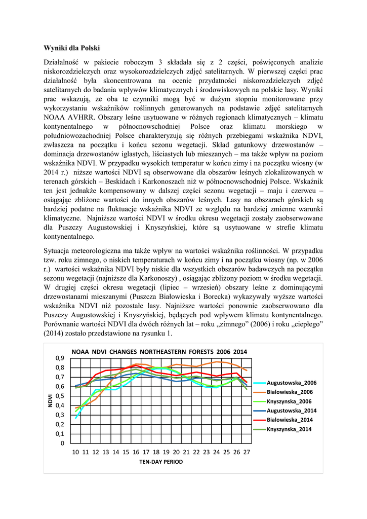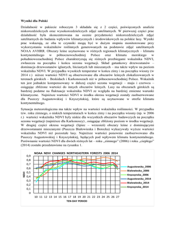 Wyniki dla Polski Działalność w pakiecie roboczym 3 składała się z 2 części, poświęconych analizie niskorozdzielczych oraz wysokorozdzielczych zdjęć satelitarnych. W pierwszej części prac działalność była skoncentrowana na ocenie przydatności niskorozdzielczych zdjęć satelitarnych do badania wpływów klimatycznych i środowiskowych na polskie lasy. Wyniki prac wskazują, ze oba te czynniki mogą być w dużym stopniu monitorowane przy wykorzystaniu wskaźników roślinnych generowanych na podstawie zdjęć satelitarnych NOAA AVHRR. Obszary leśne usytuowane w różnych regionach klimatycznych – klimatu kontynentalnego w północnowschodniej Polsce oraz klimatu morskiego w południowozachodniej Polsce charakteryzują się różnych przebiegami wskaźnika NDVI, zwłaszcza na początku i końcu sezonu wegetacji. Skład gatunkowy drzewostanów – dominacja drzewostanów iglastych, liściastych lub mieszanych – ma także wpływ na poziom wskaźnika NDVI. W przypadku wysokich temperatur w końcu zimy i na początku wiosny (w 2014 r.) niższe wartości NDVI są obserwowane dla obszarów leśnych zlokalizowanych w terenach górskich – Beskidach i Karkonoszach niż w północnowschodniej Polsce. Wskaźnik ten jest jednakże kompensowany w dalszej części sezonu wegetacji – maju i czerwcu – osiągając zbliżone wartości do innych obszarów leśnych. Lasy na obszarach górskich są bardziej podatne na fluktuacje wskaźnika NDVI ze względu na bardziej zmienne warunki klimatyczne. Najniższe wartości NDVI w środku okresu wegetacji zostały zaobserwowane dla Puszczy Augustowskiej i Knyszyńskiej, które są usytuowane w strefie klimatu kontynentalnego. NDVI Sytuacja meteorologiczna ma także wpływ na wartości wskaźnika roślinności. W przypadku tzw. roku zimnego, o niskich temperaturach w końcu zimy i na początku wiosny (np. w 2006 r.) wartości wskaźnika NDVI były niskie dla wszystkich obszarów badawczych na początku sezonu wegetacji (najniższe dla Karkonoszy) , osiągając zbliżony poziom w środku wegetacji. W drugiej części okresu wegetacji (lipiec – wrzesień) obszary leśne z dominującymi drzewostanami mieszanymi (Puszcza Białowieska i Borecka) wykazywały wyższe wartości wskaźnika NDVI niż pozostałe lasy. Najniższe wartości ponownie zaobserwowano dla Puszczy Augustowskiej i Knyszyńskiej, będących pod wpływem klimatu kontynentalnego. Porównanie wartości NDVI dla dwóch różnych lat – roku „zimnego” (2006) i roku „ciepłego” (2014) zostało przedstawione na rysunku 1. 0,9 0,8 0,7 0,6 0,5 0,4 0,3 0,2 0,1 0 NOAA NDVI CHANGES NORTHEASTERN FORESTS 2006 2014 Augustowska_2006 Bialowieska_2006 Knyszynska_2006 Augustowska_2014 Bialowieska_2014 Knyszynska_2014 10 11 12 13 14 15 16 17 18 19 20 21 22 23 24 25 26 27 TEN-DAY PERIOD Rys. 1. Porównanie wartości NDVI dla lasów północnowschodniej Polski – 2006 i 2014 Wyniki analizy wskaźnika NDVI generowanego ze zdjęć niskorozdzielczych zostały potwierdzone analizą drugiego wskaźnika charakteryzującego kondycję drzewostanówWskaźnika Kondycji Roślin (VCI). Wyniki analizy tego wskaźnika w okresie 2000 – 2016 wykazują podobne zależności jak w przypadku wskaźnika NDVI; zaobserwowano niższe wartości VCI w pierwszej fazie okresu wegetacji dla roku „zimnego” niż „ciepłego”, które następnie zostały skompensowane w dalszym etapie rozwoju drzewostanów. Na podstawie wskaźników roślinnych generowanych z niskorozdzielczych zdjęć satelitarnych w okresie 2000 – 2016 przeprowadzono analizę trendu. Wyniki tej analizy wykazały, że w wymienionym okresie nie ma znaczącej różnicy w wartości wskaźników na początku i w środku okresu wegetacji. Oznacza to, że w okresie ostatnich 16 lat nie zaobserwowano statystycznie istotnego wpływu zmian klimatycznych na wartości wskaźników. Ten wniosek jest zgodny z wynikami analizy danych meteorologicznych w okresie 2000 – 2016 – temperatury i wskaźnika hydrotermicznego charakteryzującego warunki suszowe. Analiza trendu tych parametrów w okresie 16 lat na początku i w środku okresu wegetacji nie wykryła statystycznie istotnych zmian. Druga część prac w pakiecie roboczym 3 byłą poświęcona analizie wysokorozdzielczych danych satelitarnych do badania zmian klimatycznych i środowiskowych w polskich lasach. Do prac wykorzystano 3 typy zdjęć: Landsat, SPOT 5 i Sentinel 2 (także obraz z satelity WorldView dla jednego obszaru badawczego dla celów porównawczych). Analiza była poświęcona lasom północnowschodniej Polski, dla których była dostępna odpowiednia liczba zdjęć satelitarnych. Na podstawie zdjęć Landsat i SPOT 5 wygenerowano kilka wskaźników roślinności: - Normalized Difference Vegetation Index – NDVI - Enhanced Normalized Difference Vegetation Index – ENDVI - Enhanced Vegetation Index – EVI - Normalized Difference Infrared Index –NDII - Ratio Drought Index - RDI - Disease Stress Water Index – DSWI Poszczególne wskaźniki analizowano w przekroju czasowym w przeciągu całego okresu wegetacji dla trzech obszarów badawczych: Puszczy Białowieskiej, Knyszyńskiej i Boreckiej. Wyniki analizy wskazują na szczególną przydatność wskaźnika Disease Stress Water Index – DSWI oraz Normalized Difference Infrared Index – NDII do różnicowania niektórych gatunków drzew w ramach poszczególnych obszarów badawczych. W drugim etapie prac przebadano wpływ zmienności środowiska na wartości wskaźników roślinności określanie na podstawie wysokorozdzielczych zdjęć satelitarnych. Przeanalizowano dwa aspekty środowiska leśnego: typ siedliska oraz zmieszanie drzewostanów. Do analizy wykorzystano trzy typy siedlisk: siedlisko lasu wilgotnego, świeżego i suchego. Również trzy typy zmieszania drzewostanów wzięto pod uwagę: czyste drzewostany iglaste lub liściaste, drzewostany o zmieszaniu drzew iglastych i liściastych 70 – 90 % oraz 50 – 70 %. An