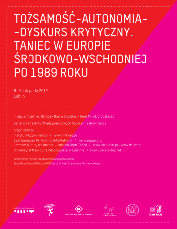 Tożsamość-autonomia-dyskurs krytyczny. Taniec w Europie Środkowo-Wschodniej po 1989 roku 8–9 listopada 2012 Lublin miejsce / partner: Ośrodek Brama Grodzka – Teatr NN, ul. Grodzka 21 panel w ramach XVI Międzynarodowych Spotkań Teatrów Tańca organizatorzy: Instytut Muzyki i Tańca / www.imit.org.pl East European Performing Arts Platform / www.eepap.org Centrum Kultury w Lublinie + Lubelski Teatr Tańca / www.ck.lublin.pl + www.ltt.art.pl Uniwersytet Marii Curie-Skłodowskiej w Lublinie / www.umcs.e-bip.net Konferencja została objęta honorowym patronatem Jego Magnificencji Rektora UMCS prof. dr hab. Stanisława Michałowskiego. Międzynarodowa konferencja poświęcona analizie przemian, jakie zaszły w świecie tańca w Europie Środkowej i Wschodniej po 1989 roku, z perspektywy artystów, naukowców i krytyków. Goście z kilku krajów, w tym autorzy przygotowywanej przez Instytut Muzyki i Tańca oraz wydawnictwo Routledge książki Nowy taniec w Europie po 1989: communitas i Inny, członkowie wschodnioeuropejskiej sieci EEPAP oraz badacze związani z Uniwersytetem Marii Curie-Skłodowskiej w Lublinie, będą dyskutować nad złożonymi kwestiami tożsamości i autonomii tańca oraz budowania dyskursu krytycznego. 8 listopada 9.30–10.00: powitanie 10.00–11.30: TOŻSAMOŚĆ – panel dyskusyjny wstęp: Krystyna Duniec prowadzenie: Grzegorz Reske udział biorą: Heili Einasto, Julia Hoczyk, Stefan Hölscher, Mihaela Michailov, Iulia Popovici, Annamária Szoboszlai 11.30–12.30: dyskusja 12.30–13.30: przerwa 13.30–15.00: AUTONOMIA – panel dyskusyjny prowadzenie: Marta Keil udział biorą: Harutyun Alpetyan, Joanna Leśnierowska, Ewan McLaren, Liza Sargsyan, Izabela Szymańska, Aleksander Tebenkov, Swietłana Ulanovskaja, Larisa Venediktova 15.00–15.30: dyskusja 15.30–16.00: podsumowanie dnia 9 listopada 9.30–10.00: powitanie 10.00–11.30: DYSKURS KRYTYCZNY – panel dyskusyjny prowadzenie: Jarosław Cymerman udział biorą: Anna R. Burzyńska, Grzegorz Kondrasiuk, Tadeusz Kornaś, Anna Królica, Jadwiga Majewska 11.30–12.30: dyskusja 12.30–13.30: przerwa 13.30–15.00: Taniec wobec przemian kulturowych w Europie Środkowo-Wschodniej po 89 roku na wybranych przykładach (referaty studentów i doktorantów UMCS) prowadzenie: Gabriela Żuk 15.00–15.30: dyskusja 15.30–16.00: podsumowanie konferencji Harutyun Alpetyan (Armenia) – życie zawodowe zaczynał jako inżynier, ale potem zwrócił się w stronę sztuki. Tworzy krótkie filmy dokumentalne, dotyczące recepcji sztuki w środowiskach lokalnych, prowadząc w tym celu badania terenowe i studiując miejscową sztukę. Brał udział w Letniej Szkole Kuratorskiej oraz kursie Wystawiennictwo i krytyka kulturalna, obu organizowanych przez armeński oddział AICA. Założył, razem z Nvardem Yerkanianem, AJZ space – placówkę artystyczną realizującą różnorodne projekty związane z działalnością kuratorską. Anna R. Burzyńska (Polska) – adiunkt w Katedrze Teatru i Dramatu na Wydziale Polonistyki Uniwersytetu Jagiellońskiego. Jej zainteresowania badawcze obejmują przede wszystkim najnowszy teatr europejski oraz dramat polski i niemiecki od XIX wieku po współczesność. Zajmuje się także krytyką teatralną. Od 2000 roku współredaguje Gazetę Teatralną „Didaskalia”, w latach 2004– –2010 była recenzentką i publicystką „Tygodnika Powszechnego”. Autorka książek Mechanika cudu (2005), The Classics and the Troublemakers (2008), Maska twarzy (2011) i Małe dramaty (2012). Jarosław Cymerman (Polska) – teatrolog, krytyk teatralny, pracuje jako adiunkt w Zakładzie Teatrologii Instytutu Filologii Polskiej Uniwersytetu Marii Curie-Skłodowskiej w Lublinie. Zajmuje się historią i teorią teatru oraz dramaturgią polską XIX i XX wieku. Stały współpracownik miesięcznika „Teatr”, publikował m.in. w „Pamiętniku Teatralnym”, „Akcencie” i „Dialogu”. Krystyna Duniec (Polska) – historyczka teatru współczesnego, eseistka, redaktorka. Profesor w Zakładzie Historii i Teorii Teatru Instytutu Sztuki PAN. Autorka monografii: Kaprysy Prospera. Szkice o szekspirowskich inscenizacjach Leona Schillera (1999), Jan. Kreczmar. Grał jakby uczył (2005). W druku Mięso i krew. Ciało we współczesnym teatrze. Współautorka zbioru esejów Soc i sex. Diagnozy teatralne i nieteatralne (2009), nagrodzonego w konkursie Fundacji Kultury, redaktorka książek: Bruliony (dzienniki Jana Kreczmara, 2005), Aktor. Niepewna tożsamość (2011) oraz opracowania Teatr po 1989 roku („Kronika Warszawy” 2007) i teatralnego biuletynu informacyjnego „Rzeczy Teatralne (1999–2007). Heili Einasto (Estonia) – wykładowczyni historii tańca na Uniwersytecie Talińskim. Uzyskała licencjat z historii i anglistyki w Estońskim Instytucie Humanistycznym, natomiast studia magisterskie z zakresu Gender Studies i kulturoznawstwa odbyła na Uniwersytecie Środkowoeuropejskim w Budapeszcie. Brała udział w Body Project w ramach International Women’s University w Hanowerze – Bremie. Od 1991 Heili Einasto pisze o tańcu współczesnym oraz popularyzuje go. Julia Hoczyk (Polska) – teatrolożka i krytyczka tańca. W latach 2005–2010 redaktorka „Sceny”, 2008–2011 – sieciowego miesięcznika „Kultura Enter”. Publikuje teksty krytyczne (m.in. „Didaskalia” „Teatr”, dwutygodnik.com), prowadzi gościnne wykłady o tańcu współczesnym i buto. Słuchaczka podyplomowych Gender Studies ISNS Uniwersytetu Warszawskiego. Doktorantka Instytutu Sztuki PAN, gdzie przygotowuje rozprawę doktorską na temat dyskursu cielesności w tańcu. Współpracuje z Akademią Teatralną w Warszawie. Redaktorka portalu TaniecPOLSKA.pl. Pracuje w Instytucie Muzyki i Tańca. Stefan Hölscher (Niemcy) – w latach 2001–2008 studiował na Wydziale Teatrologii Stosowanej na Uniwersytecie Justus Liebig w Giessen (Niemcy). Od 2009 pracuje tam jako adiunkt na nowopowstałych studiach magisterskich C