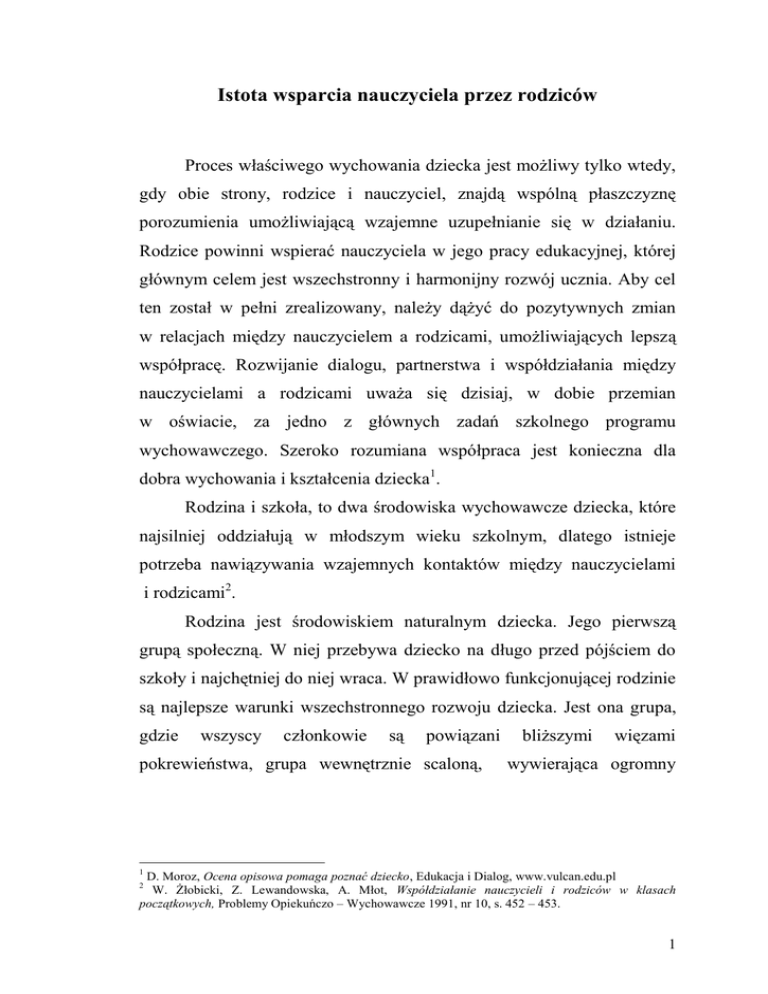 Istota wsparcia nauczyciela przez rodziców Proces właściwego wychowania dziecka jest możliwy tylko wtedy, gdy obie strony, rodzice i nauczyciel, znajdą wspólną płaszczyznę porozumienia umożliwiającą wzajemne uzupełnianie się w działaniu. Rodzice powinni wspierać nauczyciela w jego pracy edukacyjnej, której głównym celem jest wszechstronny i harmonijny rozwój ucznia. Aby cel ten został w pełni zrealizowany, należy dążyć do pozytywnych zmian w relacjach między nauczycielem a rodzicami, umożliwiających lepszą współpracę. Rozwijanie dialogu, partnerstwa i współdziałania między nauczycielami a rodzicami uważa się dzisiaj, w dobie przemian w oświacie, za jedno z głównych zadań szkolnego programu wychowawczego. Szeroko rozumiana współpraca jest konieczna dla dobra wychowania i kształcenia dziecka1. Rodzina i szkoła, to dwa środowiska wychowawcze dziecka, które najsilniej oddziałują w młodszym wieku szkolnym, dlatego istnieje potrzeba nawiązywania wzajemnych kontaktów między nauczycielami i rodzicami2. Rodzina jest środowiskiem naturalnym dziecka. Jego pierwszą grupą społeczną. W niej przebywa dziecko na długo przed pójściem do szkoły i najchętniej do niej wraca. W prawidłowo funkcjonującej rodzinie są najlepsze warunki wszechstronnego rozwoju dziecka. Jest ona grupa, gdzie wszyscy członkowie są powiązani pokrewieństwa, grupa wewnętrznie scaloną, bliższymi więzami wywierająca ogromny 1 D. Moroz, Ocena opisowa pomaga poznać dziecko, Edukacja i Dialog, www.vulcan.edu.pl W. Żłobicki, Z. Lewandowska, A. Młot, Współdziałanie nauczycieli i rodziców w klasach początkowych, Problemy Opiekuńczo – Wychowawcze 1991, nr 10, s. 452 – 453. 2 1 wpływ na zachowanie się dzieci. W szkole nauczyciele nie mogą o tym fakcie zapominać3. W literaturze przedmiotu można przeczytać, że na rozwój dziecka bardziej wpływa wychowanie rodzinne, niż wychowanie szkolne. W procesie wychowania rodzice odgrywają rolę pierwszorzędną. Są zwykle najważniejszymi i najbardziej wpływowymi nauczycielami swych dzieci4. W wychowanie dziecka zaangażowany jest jak już wspomniano dom i szkoła. Aby proces ten przebiegał skutecznie, konieczne jest współdziałanie obu środowisk. Nie może być bowiem tak, ze kierunek wychowania prezentowany przez nauczyciela będzie inny niż ten, jaki wybrali rodzice. Rodzina ma obowiązek dopomóc nauczycielom w należytym wywiązywaniu się z zadań wychowawczych. Do tego konieczna jest właściwa współpraca i wsparcie. Rodzice powinni: dokładnie badać możliwości i trudności pracy w szkole, dokonywać właściwej, obiektywnej oceny pracy nauczyciela, lepiej poznawać swoje dziecko i jego sytuacje w szkole, dokonywać właściwej, obiektywnej własnego dziecka, współkształtować nauczanie i wychowanie w szkole, dążyć do wzajemnego uzupełniania się edukacji domowej ze szkolną, przeciwdziałać izolowaniu edukacji w rodzinnym domu od edukacji szkolnej5. Szkoła jest drugim środowiskiem życia dziecka, a więc pełni również doniosłą rolę w jego rozwoju. Wspieranie nauczycieli przez rodziców 3 M. Łobocki, Współdziałanie nauczycieli i rodziców w procesie wychowania, Warszawa 1985, s. 12 – 14. 4 J. Gordon, Wychowanie bez porażek w szkole, Warszawa 1996, s. 344. 5 W. Segiet, Rodzice – nauczyciele. Wzajemne stosunki i reprezentacje, Poznań 1990, s. 179. 2 polega na współpracy, wzajemnym wspomaganiu się i współdziałaniu w realizacji wspólnego celu. Opiera się to wszystko na wzajemnym zaufaniu, lojalności, podporządkowaniu się celowi, który musi być należycie uświadomiony zarówno przez rodziców, jak i przez nauczycieli6. Warunkiem współpracy jest stworzenie wspólnoty w działaniu. Nauczyciel i rodzice musza wytworzyć wspólną linię działania i uzgodnić jego cel. Istotne jest również określenie tego, co kto ma robić w ramach w szkolnej wspólnego edukacji działania. swojego Rodzic dziecka. winien Nie uczestniczyć chodzi tu tylko o uzupełnienie procesu edukacji poprzez pracę w domu, ale o zaangażowanie w to, co dzieje się na terenie szkoły. Może ona przybierać różne formy, na przykład uczestnictwa w zajęciach lub ich prowadzenie. W takim przypadku nauczyciel powinien poznać wcześniej zainteresowania i zdolności poszczególnych rodziców oraz zapytać ich o chęci i możliwości podzielenia się z nimi klasą7. Współpraca powinna mieć charakter subsydialny, czyli zarówno rodzice, jak i nauczyciele muszą przezwyciężyć swoje osobiste ograniczenia. Chcąc współdziałać, rodzice i nauczyciele powinni dążyć do tego, aby ich kompetencje były wytworem ich współpracy. Stanem pożądanym jest wspólne działanie, dlatego współpraca jest zarówno punktem wyjścia, jak i celem działania nauczycieli i rodziców, a to umożliwia efektywne ich wspomaganie8. Celem nadrzędnym współpracy rodziców i nauczycieli jest osiągniecie dobra dziecka. Istotnym dążeniem jest usprawnienie pracy wychowawczej z uczniami. Współdziałanie rodziców i nauczycieli 6 W. Okoń, Słownik pedagogiczny, Warszawa 1981, s. 346. P. Bąbel, S. Trusz, Rodzina i szkoła. Nowe perspektywy współpracy, Nauczanie początkowe, kształcenie zintegrowane, Kielce 2004, nr 2, s. 15. 8 W. Segiet, Rodzice – nauczyciele …, dz., cyt., s. 148. 7 3 w różnych formach jest przydatne wszystkim bez wyjątku. Choć szczególne znaczenie ma ona dla uczniów, którzy zaniedbują się w obowiązkach szkolnych, są agresywni, zahamowani czy apatyczni9. Celem współpracy nauczycieli z rodzicami jest też uświadomienie rodzicom, ze rozwój dziecka zależy od wspólnie realizowanych działań przez szkołę i rodzinę. Efektem wzajemnej współpracy nauczycieli i rodziców jest tworzenie na co dzień właściwej atmosfery wychowawczej w szkole i w domu. Na atmosferę wychowawczą składają się stosunki interpersonalne w relacji nauczyciel – uczeń, nauczyciel 