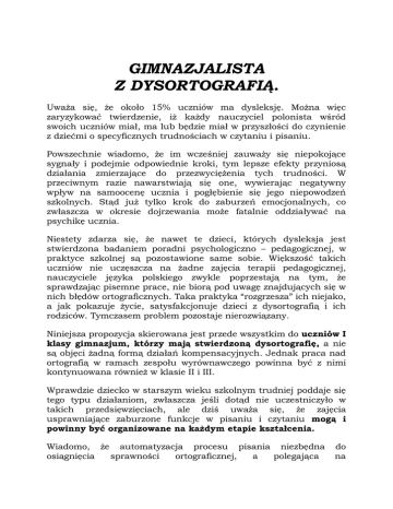 GIMNAZJALISTA Z DYSORTOGRAFIĄ. Uważa się, że około 15% uczniów ma dysleksję. Można więc zaryzykować twierdzenie, iż każdy nauczyciel polonista wśród swoich uczniów miał, ma lub będzie miał w przyszłości do czynienie z dziećmi o specyficznych trudnościach w czytaniu i pisaniu. Powszechnie wiadomo, że im wcześniej zauważy się niepokojące sygnały i podejmie odpowiednie kroki, tym lepsze efekty przyniosą działania zmierzające do przezwyciężenia tych trudności. W przeciwnym razie nawarstwiają się one, wywierając negatywny wpływ na samoocenę ucznia i pogłębienie się jego niepowodzeń szkolnych. Stąd już tylko krok do zaburzeń emocjonalnych, co zwłaszcza w okresie dojrzewania może fatalnie oddziaływać na psychikę ucznia. Niestety zdarza się, że nawet te dzieci, których dysleksja jest stwierdzona badaniem poradni psychologiczno – pedagogicznej, w praktyce szkolnej są pozostawione same sobie. Większość takich uczniów nie uczęszcza na żadne zajęcia terapii pedagogicznej, nauczyciele języka polskiego zwykle poprzestają na tym, że sprawdzając pisemne prace, nie biorą pod uwagę znajdujących się w nich błędów ortograficznych. Taka praktyka “rozgrzesza” ich niejako, a jak pokazuje życie, satysfakcjonuje dzieci z dysortografią i ich rodziców. Tymczasem problem pozostaje nierozwiązany. Niniejsza propozycja skierowana jest przede wszystkim do uczniów I klasy gimnazjum, którzy mają stwierdzoną dysortografię, a nie są objęci żadną formą działań kompensacyjnych. Jednak praca nad ortografią w ramach zespołu wyrównawczego powinna być z nimi kontynuowana również w klasie II i III. Wprawdzie dziecko w starszym wieku szkolnym trudniej poddaje się tego typu działaniom, zwłaszcza jeśli dotąd nie uczestniczyło w takich przedsięwzięciach, ale dziś uważa się, że zajęcia usprawniające zaburzone funkcje w pisaniu i czytaniu mogą i powinny być organizowane na każdym etapie kształcenia. Wiadomo, że automatyzacja procesu pisania niezbędna osiągnięcia sprawności ortograficznej, a polegająca do na skoordynowaniu pamięci wzrokowej, słuchowej i ruchowej, wytwarza się około 12 roku życia. Wiąże się z tym wielka odpowiedzialność nauczycieli języka polskiego w szkole podstawowej, którzy mają decydujący wpływ na kształtowanie się prawidłowych nawyków ortograficznych. To właśnie oni powinni być czujni i jako pierwsi zauważyć wśród swoich uczniów tych, którzy mają specyficzne trudności w pisaniu i czytaniu i nie zbagatelizować niepokojących sygnałów. Zadania zespołu wyrównawczego dla uczniów z dysortografią. Zespół wyrównawczy dla uczniów z dysortografią wydaje się najlepszym wyjściem w sytuacji, gdy na lekcjach języka polskiego nie ma czasu, by problemom ortograficznym poświęcić tyle miejsca, ile byłoby konieczne. Najczęściej realizuje się tylko bieżące tematy z ortografii, wynikające z programu nauczania w danej klasie. Nie ma natomiast możliwości, by prowadzić systematyczny trening ortograficzny i utrwalać nawyki poprawnego pisania. Niestety, nie da się nauczyć ortografii za pomocą teorii. Zanotowanie przez ucznia reguły ortograficznej niczego nie załatwia, stwarza tylko pozory działania. Dodatkową niesprzyjającą okolicznością jest fakt, że większość nauczycieli uczy ortografii za pomocą dyktand (!). Nie dziwi więc sytuacja, że coraz więcej uczniów pisze z błędami, a przecież tylko pewien ich procent ma stwierdzoną dysortografię. Co mają robić właśnie ci uczniowie, jeśli nawet ich niedysortograficzni rówieśnicy nie radzą sobie z poprawnym pisaniem? By zalecenia poradni psychologiczno-pedagogicznej odnośnie pracy nad poprawnością ortograficzną były realizowane, należałoby zorganizować na terenie szkoły zespoły wyrównawcze dla uczniów z dysortografią. Zaproponowane przeze mnie zajęcia mają na celu przede wszystkim: zapewnić uczniom z dysortografią systematyczny trening ortograficzny podawać niezbędną wiedzę ortograficzną w sposób uporządkowany i maksymalnie przystępny utrwalać wzrokowo-ruchowe obrazy słów, co jest konieczne do osiągnięcia zadowalającej sprawności ortograficznej, zwłaszcza w przypadku uczniów w starszym wieku szkolnym, co polega na kształceniu nawyku ortograficznego poprzez automatyzm ruchowy aktywizować i mobilizować uczniów do pracy nad sprawnością ortograficzną wyrównywać braki w wiadomościach z ortografii (wielu uczniów nie zna podstawowych reguł ortograficznych, co w przypadku uczniów dyslektycznych nie zapobiega popełnianiu błędów, ale jest jednym z ważnych czynników opanowania poprawnej pisowni) przeciwdziałać niepowodzeniom szkolnym. Zasady funkcjonowania Zajęcia zespołu wyrównawczego dla uczniów z dysortografią powinny odbywać się w wymiarze 2 godzin lekcyjnych tygodniowo (najlepiej dwa razy po 1 godz.) Jest to niezbędne minimum, jeśli działania te mają przynieść jakiekolwiek pozytywne efekty. W zajęciach tych nie powinno uczestniczyć jednorazowo więcej niż 6 – 8 uczniów. Nauczyciel prowadzący zespół powinien mieć okazję jak najczęstszego osobistego kontaktu z każdym dzieckiem, uwzględnienia jego indywidualnych możliwości, tempa pracy, sprawności motorycznej, itp. Uczeń musi mieć bowiem świadomość, że jest podmiotem wszystkich tych działań. W większej grupie bardzo często staje się niestety, ich podmiotem. Wrogiem wszelkiego uczenia się jest pośpiech, dlatego lepiej pracować nad ortografią bez ponaglania, bez dodatkowych stresów, których uczeń ze specyficznymi trudnościami w pisaniu ma pod dostatkiem na co dzień w trakcie zajęć szkolnych. Zajęcia wyrównawcze powinny dać mu poczucie, że może pokonać trudności w nauce, rolą nauczyciela zaś będzie wzmacnianie tego pozytywnego nastawienia. Metody pracy z uczniem na zajęciach wyrównawczych. Zważywszy na to, że ortografia jest dzi