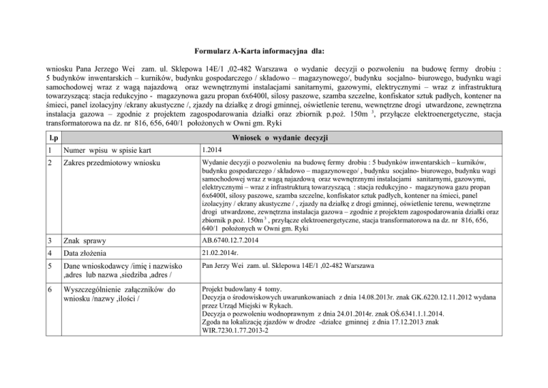 Formularz A-Karta informacyjna dla: wniosku Pana Jerzego Wei zam. ul. Sklepowa 14E/1 ,02-482 Warszawa o wydanie decyzji o pozwoleniu na budowę fermy drobiu : 5 budynków inwentarskich – kurników, budynku gospodarczego / składowo – magazynowego/, budynku socjalno- biurowego, budynku wagi samochodowej wraz z wagą najazdową oraz wewnętrznymi instalacjami sanitarnymi, gazowymi, elektrycznymi – wraz z infrastrukturą towarzyszącą: stacja redukcyjno - magazynowa gazu propan 6x6400l, silosy paszowe, szamba szczelne, konfiskator sztuk padłych, kontener na śmieci, panel izolacyjny /ekrany akustyczne /, zjazdy na działkę z drogi gminnej, oświetlenie terenu, wewnętrzne drogi utwardzone, zewnętrzna instalacja gazowa – zgodnie z projektem zagospodarowania działki oraz zbiornik p.poż. 150m 3, przyłącze elektroenergetyczne, stacja transformatorowa na dz. nr 816, 656, 640/1 położonych w Owni gm. Ryki l.p Wniosek o wydanie decyzji 1 Numer wpisu w spisie kart 1.2014 2 Zakres przedmiotowy wniosku Wydanie decyzji o pozwoleniu na budowę fermy drobiu : 5 budynków inwentarskich – kurników, budynku gospodarczego / składowo – magazynowego/ , budynku socjalno- biurowego, budynku wagi samochodowej wraz z wagą najazdową oraz wewnętrznymi instalacjami sanitarnymi, gazowymi, elektrycznymi – wraz z infrastrukturą towarzyszącą : stacja redukcyjno - magazynowa gazu propan 6x6400l, silosy paszowe, szamba szczelne, konfiskator sztuk padłych, kontener na śmieci, panel izolacyjny / ekrany akustyczne / , zjazdy na działkę z drogi gminnej, oświetlenie terenu, wewnętrzne drogi utwardzone, zewnętrzna instalacja gazowa – zgodnie z projektem zagospodarowania działki oraz zbiornik p.poż. 150m 3 , przyłącze elektroenergetyczne, stacja transformatorowa na dz. nr 816, 656, 640/1 położonych w Owni gm. Ryki 3 Znak sprawy AB.6740.12.7.2014 4 Data złożenia 21.02.2014r. 5 Dane wnioskodawcy /imię i nazwisko ,adres lub nazwa ,siedziba ,adres / Pan Jerzy Wei zam. ul. Sklepowa 14E/1 ,02-482 Warszawa 6 Wyszczególnienie załączników do wniosku /nazwy ,ilości / Projekt budowlany 4 tomy. Decyzja o środowiskowych uwarunkowaniach z dnia 14.08.2013r. znak GK.6220.12.11.2012 wydana przez Urząd Miejski w Rykach. Decyzja o pozwoleniu wodnoprawnym z dnia 24.01.2014r. znak OŚ.6341.1.1.2014. Zgoda na lokalizację zjazdów w drodze -działce gminnej z dnia 17.12.2013 znak WIR.7230.1.77.2013-2 l.p Wniosek o wydanie decyzji 7 Miejsce przechowywania /nazwa organu , Starostwo Powiatowe w Rykach Wydział Architektury i Budownictwa ul. Wyczółkowskiego 10a , nazwa komórki organizacyjnej, nr. pokoju/ 08-500 Ryki , tel. (0-81)8657-465 ,pokój nr. 202 8 Informacja o uwzględnieniu lub nieuwzględnieniu wniosku /nr. wpisu w wykazie decyzji/ brak 9 Zastrzeżenie dotyczące udostępnienia informacji brak 10 Numery innych wpisów w wykazie , dotyczących wnioskodawcy brak 11 Uwagi brak opracowała: B. Jońska