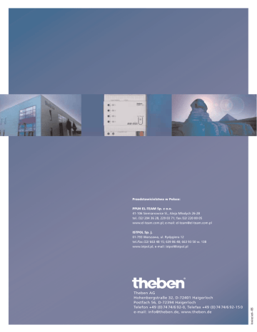 Przedstawicielstwa w Polsce: PPUH EL-TEAM Sp. z o.o. 41-106 Siemianowice Sl., Aleja Młodych 26-28 tel. /32/ 204 36 28, 229 03 71; fax /32/ 220 00 05 www.el-team.com.pl; e-mail: [email protected] Theben AG Hohenbergstraße 32, D-72401 Haigerloch Postfach 56, D-72394 Haigerloch Telefon +49 (0) 74 74/6 92-0, Telefax +49 (0) 74 74/6 92-15 0 e-mail: [email protected], www.theben.de kwiecień– 05 ISTPOL Sp. j. 01-793 Warszawa, ul. Rydygiera 12 tel./fax /22/ 663 48 15; 639 86 48; 663 93 50 w. 138 www.istpol.pl; e-mail: [email protected] polska System sterowania instalacjami budynków • Sterowniki (aktory) łączeniowe • Sterowniki (aktory) ściemniające • Sterowniki (aktory) żaluzjowe • Sterowniki (aktory) ogrzewania • Regulatory temperatury pojedynczych pomieszczeń • Nastawniki silnikowy • Stacja pogodowa • Czujniki jasności • Zegary sterujące • Zegary podporządkowane • Akcesoria systemu EIB/KNX - Spektrum wyrobów Theben w zarysie Theben oferuje wszystko do zabudowy w rozdzielnicach. Wszystko kompletnie. Wszystko perfekcyjnie. Bright- Dim Time TR 648 S DCF 16–kanałowy zegar roczny z 4-kanałami astronomicznymi i możliwością programowania na PC RMG 8 8-kanałowy sterownik, 10 A lub 4-kanałowy sterownik rolet TR 612 S 2–kanałowy zegar tygodniowy LUNA 130 Czujnik jasności z 3 progami lub 4 scenami RMG 4 S 4–kanałowy sterownik łączeniowy 16 A oraz RMG 4 C-Last dla dużych prądów załączenia i obciążeń pojemnościowych RME 8 8-kanałowy moduł rozszerzający, 10 A lub 4- kanałowy sterownik rolet dla JMG 4 lub RMG 8 RME 4 S 4-kanłowy moduł rozszerzający, 16 A dla rozszerzeń do 12-kanałów oraz RME 4 C-Last dla dużych prądów załączenia i obciążeń pojemnościowych HMG 8 8-kanałowy sterownik ogrzewania do termicznych nastawników Swit- m- Wszystko do łączeń oraz ściemniania źródeł światła, do sterowań rolet, markiz i żaluzji, do sterowań ogrzewania pomieszczeń i ogrzewań podłogowych, do sterowań o przebiegach czasowych lub zależnie od stopnia jasności. Theben ma po prostu wszystko do zabudowy w rozdzielnicy oraz dopasowane odpowiednie komponenty systemu. System Heatin Blind DMG 2 2-kanałowy uniwersalny sterownik ściemniania, 2 x 300 W/VA lub 1 x 500 W/VA DME 2 2-kanałowy moduł rozszerzający ściemniacza do maks. 6 kanałów FME 8 Urządzenie rozszerzające do HMG 8 dla 8 kontaktów okiennych DMB 2 rozszerzenie mocy dla DMG 2 oraz DME 2 w celu podwojenia mocy ściemniania, 2 x 600 W/VA lub 1 x 1000 W/VA Zasilacz napięciowy 640 mA JMG 4 4-kanałowy sterownik, 8 A oraz JMG 4 24 VDC 4-kanałowy sterownik żaluzjowy do silników prądu stałego Sprzęgło RS 232 EIB/KNX – Spektrum wyrobów Theben w zarysie Rozwiązania w całym budynku – zarys Czujnik jasności LU 131 100 000 lx str. 46 –47 Sterowanie czasowe TR 644 S DCF 4 kanały sterowanie kwarcowe lub sygn. radiowym str. 51 –53 Termostat pokojowy RAM 713 Regulatory temperatury str. 30 – 33 Grzejniki CHEOPS Nastawniki motoryczne str. 34 – 41 Ogrzewanie HMG 8 Sterownik ogrzewania 8 kanałów, 250 VDC, str. 22 – 25 Ogrzewanie podłogowe HTM 6 Sterownik ogrzewania do rozdzielacza ciepła 6 kanałów, 24 VDC str. 26 –29 4 Stacja pogodowa Stacja pogodowa Zestaw kombi str. 42 –45 Żaluzje / rolety JMG 4 + RMG 8 4 – 8 kanałów str. 14 – 17 Łączenie RMG 4S + RME 4S Sterowniki łączeniowe 4 – 12 kanałów str. 6 – 9 Ściemnianie DMG 2 Sterowniki ściemniania str. 10 – 13 Wskazywanie czasu OSIRIA Zegary ścienne str. 56 – 61 Akcesoria systemu Zasilacz napięciowy Sprzęgło RS -232 str. 62 –63 5 Sterowniki łączeniowe serii RME 4C-Last RMG 4S, RME 4S, RMG 4C-Last, Czynią prawie wszystko możliwym – idea modułów do łączenia odbiorników elektrycznych RMG 4S (moduł podstawowy) • 4-kanałowy sterownik łączeniowy RME 4S (moduł rozszerzający) • 4- kanałowy sterownik łączeniowy RMG 4C-Last (moduł podstawowy) • 4- kanałowy sterownik łączeniowy RME 4C-Last (moduł rozszerzający) • 4- kanałowy sterownik łączeniowy RMG 4C-Last Moduł podstawowy, 4 kanały 6 Opis Seria jest serią urządzeń, składających się z modułów podstawowych (np. RMG 4S lub RMG 4C-Last) oraz z modułów rozszerzających (np. RME 4S lub RME 4C-Last). Do jednego modułu podstawowego tej serii podłączonych może być do 2 modułów rozszerzających. Każdy kanał tych sterowników łączeniowych wyposażony jest w diodę LED dla wskazywania stanu łączenia i jeden łącznik ręczny z pozycjami Zał/Wył/bus. Sterowniki łączeniowe mogą w ciągu 1 s po powrocie napięcia sieciowego przyjąć ustalony (sparametryzowany) uprzednio stan łączenia, dlatego nadają się do zastosowań w układach wg VDE 0108. Przez parametry nastawialne są takie funkcje podstawowe jak łączenia, łączenia ze RME 4S Moduł rozszerzający, 4 kanały Łączenia zwłoką, funkcja impulsowa. Ponadto parametryzowane mogą być powiązania kanałów, rodzaje kontaktów (rozwierne, zwierne), udział w rozkazach centralnych, jak: trwale Zał, trwale Wył, łączenie centralne oraz zapisywanie/ wywoływanie scen. Cechy • Moc łączeniowa 16 A, rozszerzalna do 12 kanałów. • Obiekt sygnalizacji zwrotnej dla każdego kanału. • Obiekty centralne z oraz bez priorytetu. • Funkcje łączeniowe: Zał/Wył, impuls, zwłoczne Zał/Wył, oświetlenie schodowe z ostrzeganiem wg DIN 180 15/2. • Powiązania logiczne: blokowanie, AND, AND z cofaniem, OR. • Sceny, wywoływanie i zapisywanie. • Nastawialne zachowanie się po wypadnięciu bus. • Nastawialne zachowanie się po powrocie bus lub napięcia sieciowego. • Łącznik ręczny Zał, Wył, bus, łączenie także bez napięcia bus. Zalety • Możliwa dowolna kombinacja łączenia oraz ściemniania. Dzięki temu osiągnąć można bardzo korzystne efekty ściemniania. • Moduły ściemniaczy wyposażone są w łączniki ręczne, co ułatwia instalowanie. • Sterowniki (aktory) łączeniowe 12-krotne dla o