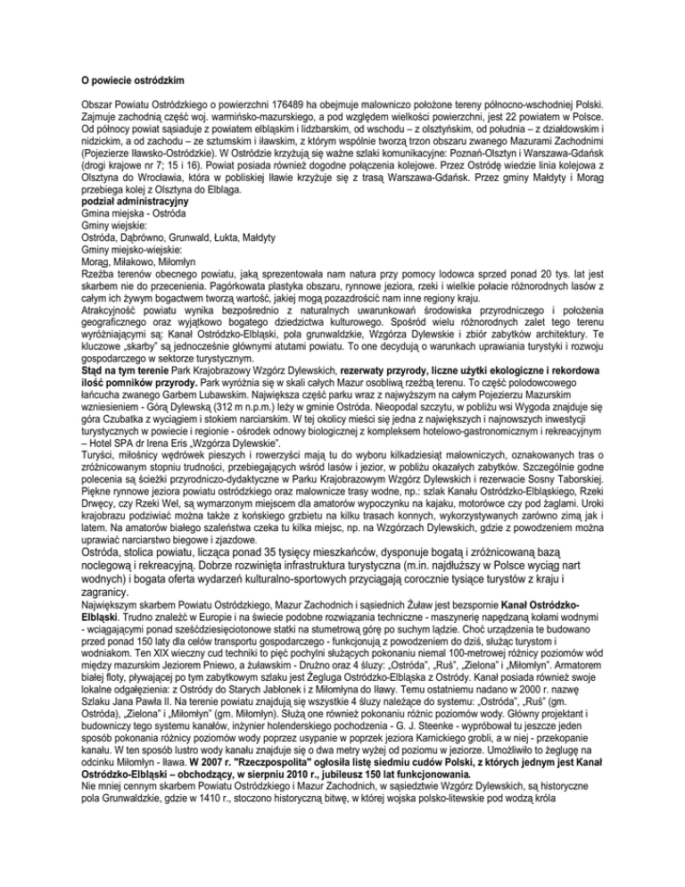 O powiecie ostródzkim Obszar Powiatu Ostródzkiego o powierzchni 176489 ha obejmuje malowniczo położone tereny północno-wschodniej Polski. Zajmuje zachodnią część woj. warmińsko-mazurskiego, a pod względem wielkości powierzchni, jest 22 powiatem w Polsce. Od północy powiat sąsiaduje z powiatem elbląskim i lidzbarskim, od wschodu – z olsztyńskim, od południa – z działdowskim i nidzickim, a od zachodu – ze sztumskim i iławskim, z którym wspólnie tworzą trzon obszaru zwanego Mazurami Zachodnimi (Pojezierze Iławsko-Ostródzkie). W Ostródzie krzyżują się ważne szlaki komunikacyjne: Poznań-Olsztyn i Warszawa-Gdańsk (drogi krajowe nr 7; 15 i 16). Powiat posiada również dogodne połączenia kolejowe. Przez Ostródę wiedzie linia kolejowa z Olsztyna do Wrocławia, która w pobliskiej Iławie krzyżuje się z trasą Warszawa-Gdańsk. Przez gminy Małdyty i Morąg przebiega kolej z Olsztyna do Elbląga. podział administracyjny Gmina miejska - Ostróda Gminy wiejskie: Ostróda, Dąbrówno, Grunwald, Łukta, Małdyty Gminy miejsko-wiejskie: Morąg, Miłakowo, Miłomłyn Rzeźba terenów obecnego powiatu, jaką sprezentowała nam natura przy pomocy lodowca sprzed ponad 20 tys. lat jest skarbem nie do przecenienia. Pagórkowata plastyka obszaru, rynnowe jeziora, rzeki i wielkie połacie różnorodnych lasów z całym ich żywym bogactwem tworzą wartość, jakiej mogą pozazdrościć nam inne regiony kraju. Atrakcyjność powiatu wynika bezpośrednio z naturalnych uwarunkowań środowiska przyrodniczego i położenia geograficznego oraz wyjątkowo bogatego dziedzictwa kulturowego. Spośród wielu różnorodnych zalet tego terenu wyróżniającymi są: Kanał Ostródzko-Elbląski, pola grunwaldzkie, Wzgórza Dylewskie i zbiór zabytków architektury. Te kluczowe „skarby” są jednocześnie głównymi atutami powiatu. To one decydują o warunkach uprawiania turystyki i rozwoju gospodarczego w sektorze turystycznym. Stąd na tym terenie Park Krajobrazowy Wzgórz Dylewskich, rezerwaty przyrody, liczne użytki ekologiczne i rekordowa ilość pomników przyrody. Park wyróżnia się w skali całych Mazur osobliwą rzeźbą terenu. To część polodowcowego łańcucha zwanego Garbem Lubawskim. Największa część parku wraz z najwyższym na całym Pojezierzu Mazurskim wzniesieniem - Górą Dylewską (312 m n.p.m.) leży w gminie Ostróda. Nieopodal szczytu, w pobliżu wsi Wygoda znajduje się góra Czubatka z wyciągiem i stokiem narciarskim. W tej okolicy mieści się jedna z największych i najnowszych inwestycji turystycznych w powiecie i regionie - ośrodek odnowy biologicznej z kompleksem hotelowo-gastronomicznym i rekreacyjnym – Hotel SPA dr Irena Eris „Wzgórza Dylewskie”. Turyści, miłośnicy wędrówek pieszych i rowerzyści mają tu do wyboru kilkadziesiąt malowniczych, oznakowanych tras o zróżnicowanym stopniu trudności, przebiegających wśród lasów i jezior, w pobliżu okazałych zabytków. Szczególnie godne polecenia są ścieżki przyrodniczo-dydaktyczne w Parku Krajobrazowym Wzgórz Dylewskich i rezerwacie Sosny Taborskiej. Piękne rynnowe jeziora powiatu ostródzkiego oraz malownicze trasy wodne, np.: szlak Kanału Ostródzko-Elbląskiego, Rzeki Drwęcy, czy Rzeki Wel, są wymarzonym miejscem dla amatorów wypoczynku na kajaku, motorówce czy pod żaglami. Uroki krajobrazu podziwiać można także z końskiego grzbietu na kilku trasach konnych, wykorzystywanych zarówno zimą jak i latem. Na amatorów białego szaleństwa czeka tu kilka miejsc, np. na Wzgórzach Dylewskich, gdzie z powodzeniem można uprawiać narciarstwo biegowe i zjazdowe. Ostróda, stolica powiatu, licząca ponad 35 tysięcy mieszkańców, dysponuje bogatą i zróżnicowaną bazą noclegową i rekreacyjną. Dobrze rozwinięta infrastruktura turystyczna (m.in. najdłuższy w Polsce wyciąg nart wodnych) i bogata oferta wydarzeń kulturalno-sportowych przyciągają corocznie tysiące turystów z kraju i zagranicy. Największym skarbem Powiatu Ostródzkiego, Mazur Zachodnich i sąsiednich Żuław jest bezspornie Kanał OstródzkoElbląski. Trudno znaleźć w Europie i na świecie podobne rozwiązania techniczne - maszynerię napędzaną kołami wodnymi - wciągającymi ponad sześćdziesięciotonowe statki na stumetrową górę po suchym lądzie. Choć urządzenia te budowano przed ponad 150 laty dla celów transportu gospodarczego - funkcjonują z powodzeniem do dziś, służąc turystom i wodniakom. Ten XIX wieczny cud techniki to pięć pochylni służących pokonaniu niemal 100-metrowej różnicy poziomów wód między mazurskim Jeziorem Pniewo, a żuławskim - Drużno oraz 4 śluzy: „Ostróda”, „Ruś”, „Zielona” i „Miłomłyn”. Armatorem białej floty, pływającej po tym zabytkowym szlaku jest Żegluga Ostródzko-Elbląska z Ostródy. Kanał posiada również swoje lokalne odgałęzienia: z Ostródy do Starych Jabłonek i z Miłomłyna do Iławy. Temu ostatniemu nadano w 2000 r. nazwę Szlaku Jana Pawła II. Na terenie powiatu znajdują się wszystkie 4 śluzy należące do systemu: „Ostróda”, „Ruś” (gm. Ostróda), „Zielona” i „Miłomłyn” (gm. Miłomłyn). Służą one również pokonaniu różnic poziomów wody. Główny projektant i budowniczy tego systemu kanałów, inżynier holenderskiego pochodzenia - G. J. Steenke - wypróbował tu jeszcze jeden sposób pokonania różnicy poziomów wody poprzez usypanie w poprzek jeziora Karnickiego grobli, a w niej - przekopanie kanału. W ten sposób lustro wody kanału znajduje się o dwa metry wyżej od poziomu w jeziorze. Umożliwiło to żeglugę na odcinku Miłomłyn - Iława. W 2007 r. "Rzeczpospolita" ogłosiła listę siedmiu cudów Polski, z których jednym jest Kanał Ostródzko-Elbląski – obchodzący, w sierpniu 2010 r., jubileusz 150 lat funkcjonowania. Nie mniej cennym skarbem Powiatu Ostródzkiego i Mazur Zachodnich, w sąsiedztwie Wzgórz Dylewskich, są historyczne 