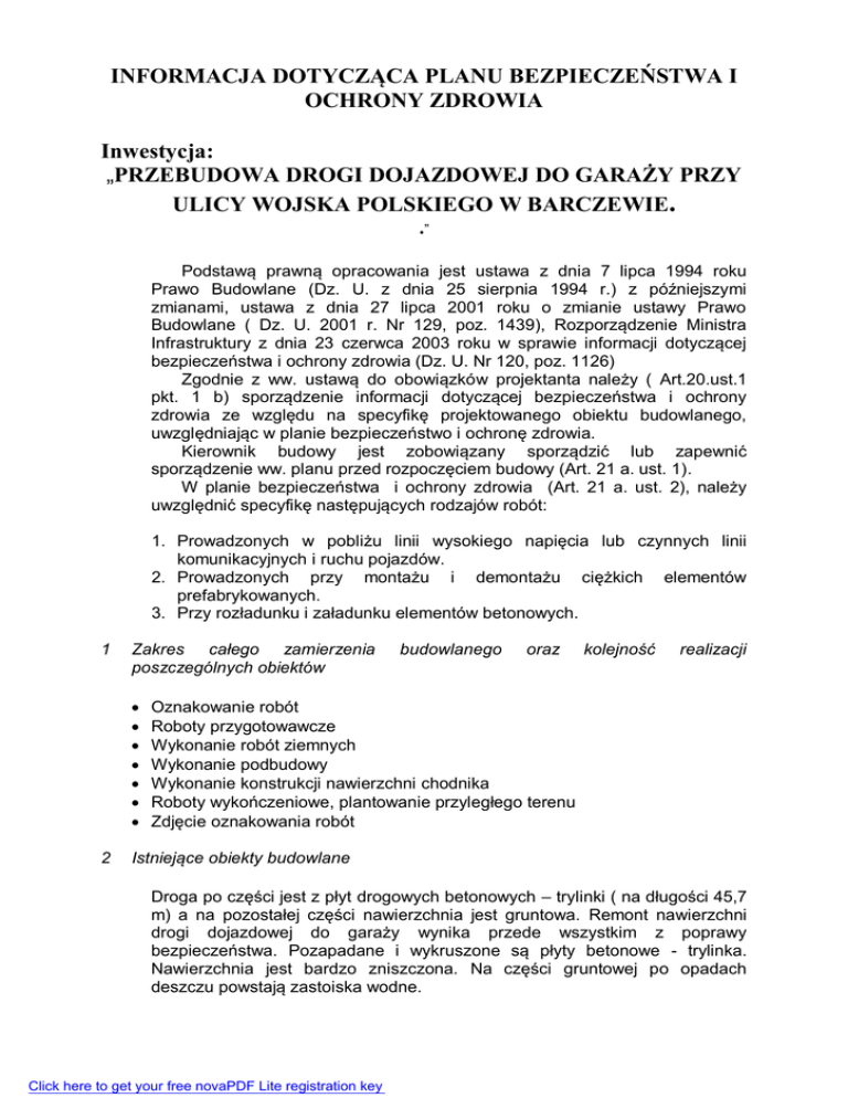 INFORMACJA DOTYCZĄCA PLANU BEZPIECZEŃSTWA I OCHRONY ZDROWIA Inwestycja: „PRZEBUDOWA DROGI DOJAZDOWEJ DO GARAŻY PRZY ULICY WOJSKA POLSKIEGO W BARCZEWIE. .” Podstawą prawną opracowania jest ustawa z dnia 7 lipca 1994 roku Prawo Budowlane (Dz. U. z dnia 25 sierpnia 1994 r.) z późniejszymi zmianami, ustawa z dnia 27 lipca 2001 roku o zmianie ustawy Prawo Budowlane ( Dz. U. 2001 r. Nr 129, poz. 1439), Rozporządzenie Ministra Infrastruktury z dnia 23 czerwca 2003 roku w sprawie informacji dotyczącej bezpieczeństwa i ochrony zdrowia (Dz. U. Nr 120, poz. 1126) Zgodnie z ww. ustawą do obowiązków projektanta należy ( Art.20.ust.1 pkt. 1 b) sporządzenie informacji dotyczącej bezpieczeństwa i ochrony zdrowia ze względu na specyfikę projektowanego obiektu budowlanego, uwzględniając w planie bezpieczeństwo i ochronę zdrowia. Kierownik budowy jest zobowiązany sporządzić lub zapewnić sporządzenie ww. planu przed rozpoczęciem budowy (Art. 21 a. ust. 1). W planie bezpieczeństwa i ochrony zdrowia (Art. 21 a. ust. 2), należy uwzględnić specyfikę następujących rodzajów robót: 1. Prowadzonych w pobliżu linii wysokiego napięcia lub czynnych linii komunikacyjnych i ruchu pojazdów. 2. Prowadzonych przy montażu i demontażu ciężkich elementów prefabrykowanych. 3. Przy rozładunku i załadunku elementów betonowych. 1 Zakres całego zamierzenia poszczególnych obiektów 2 budowlanego oraz kolejność realizacji Oznakowanie robót Roboty przygotowawcze Wykonanie robót ziemnych Wykonanie podbudowy Wykonanie konstrukcji nawierzchni chodnika Roboty wykończeniowe, plantowanie przyległego terenu Zdjęcie oznakowania robót Istniejące obiekty budowlane Droga po części jest z płyt drogowych betonowych – trylinki ( na długości 45,7 m) a na pozostałej części nawierzchnia jest gruntowa. Remont nawierzchni drogi dojazdowej do garaży wynika przede wszystkim z poprawy bezpieczeństwa. Pozapadane i wykruszone są płyty betonowe - trylinka. Nawierzchnia jest bardzo zniszczona. Na części gruntowej po opadach deszczu powstają zastoiska wodne. Click here to get your free novaPDF Lite registration key 3 Elementy zagospodarowania działki lub terenu, które mogą stwarzać zagrożenie bezpieczeństwu i zdrowiu ludzi. Zagrożenie bezpieczeństwa i zdrowia ludzi będzie stwarzał ruch kołowy 4 Przewidywane zagrożenia występujące podczas realizacji robót budowlanych określające skalę i rodzaje zagrożeń oraz miejsce i czas ich występowania. 4.1. Roboty, których charakter, organizacja lub miejsce prowadzenia stwarza szczególnie wysokie ryzyko powstania zagrożenia bezpieczeństwa i zdrowia ludzi, a w szczególności przysypania ziemią lub upadku z wysokości: Nie występują 4.2. Roboty budowlane, przy prowadzeniu których występują działania substancji chemicznych lub czynników biologicznych zagrażających bezpieczeństwu i zdrowiu ludzi; Nie występują 4.3. Roboty prowadzone w pobliżu linii wysokiego napięcia lub czynnych linii komunikacyjnych: Przy remoncie nawierzchni drogi roboty będą wykonywane w sąsiedztwie ruchu kołowego. 4.4. Roboty prowadzone przy montażu lub demontażu ciężkich elementów prefabrykowanych: Nie występują W planie BIOZ należy przewidzieć zaplanowanie i podjęcie działań ograniczających potencjalne ryzyko związane z prowadzeniem budowy. W szczególności należy mieć na uwadze: Odpowiednie przygotowanie do prowadzenia budowy, Organizację terenu budowy zapewniającą bezpieczeństwo z uwagi na konieczność utrzymania ruchu kołowego oraz ruchu pieszego, Właściwe użytkowanie sprzętu mechanicznego Zachowanie szczególnej ostrożności przy wykonywaniu prac w terenach uzbrojonych Zapewnienie bezpieczeństwa przy wykonywaniu prac, przy których występuje działanie substancji toksycznych, trujących, wysokiej temperatury Zasady postępowania w trakcie przygotowania i prowadzenia robót zawarte są w instrukcjach BHP oraz przepisach prawnych min. Rozporządzeniu Ministra Pracy i Polityki Społecznej z dnia 26 września 1997 roku w sprawie ogólnych przepisów bezpieczeństwa i higieny pracy (Dz. U. nr 129, poz. 844 z 1997 r), Rozporządzeniu Ministra Infrastruktury z dnia 6 lutego 2003 roku w sprawie bezpieczeństwa i higieny pracy podczas robót budowlanych (Dz. U. Nr. 47, poz. 401), Rozporządzeniu Ministra Gospodarki z dnia 20 września 2001 roku w sprawie bezpieczeństwa i higieny pracy Click here to get your free novaPDF Lite registration key podczas eksploatacji maszyn i innych urządzeń technicznych do robót ziemnych, budowlanych i drogowych (Dz. U. z 2001 r. nr 118 poz. 1263) oraz rozporządzeniu Ministra Komunikacji i Ministra Administracji, Gospodarki terenowej i Ochrony Środowiska w sprawie bezpieczeństwa i higieny pracy przy wykonywaniu robót drogowych i mostowych (Dz. U. nr 7, poz. 30 z 1977 r.) Ad. 1. Odpowiednie przygotowanie do prowadzenia budowy. Zapewnienie bezpieczeństwa i ochrony zdrowia podczas trwania budowy zależy w dużym stopniu od odpowiedniego przygotowania do prowadzenia inwestycji. Osoba odpowiedzialna za prowadzenie budowy – kierownik budowy zgodnie z obowiązującym prawem budowlanym (Dz. U. z 2001 r. Nr 129, poz. 14390 jest zobowiązany sporządzić lub zapewnić sporządzenie planu bezpieczeństwa i ochrony zdrowia uwzględniając specyfikę obiektu budowlanego i warunki prowadzenia robót budowlanych, przed rozpoczęciem budowy ( Art. 21 a. ust. 1) Jednocześnie zobowiązany jest (Art. 22. Ust. 3c) do wprowadzenia niezbędnych zmian w informacji do planu bezpieczeństwa i ochrony zdrowia ( opracowanej przez projektanta) oraz w planie, wynikających z postępu prac budowlanych. Właściwe przygotowanie inwestycji obejmować będzie m. in.: Określenie zakresu i rodzaju prac oraz przygotowanie szczegółowego harmonogramu realizacyjnego Przygotowanie kadry – sprawdzenie kwalifikacji, stanu zdrowia, przeprowadzenie szkoleń, Zaplanowanie i zagospodarowanie placu budowy