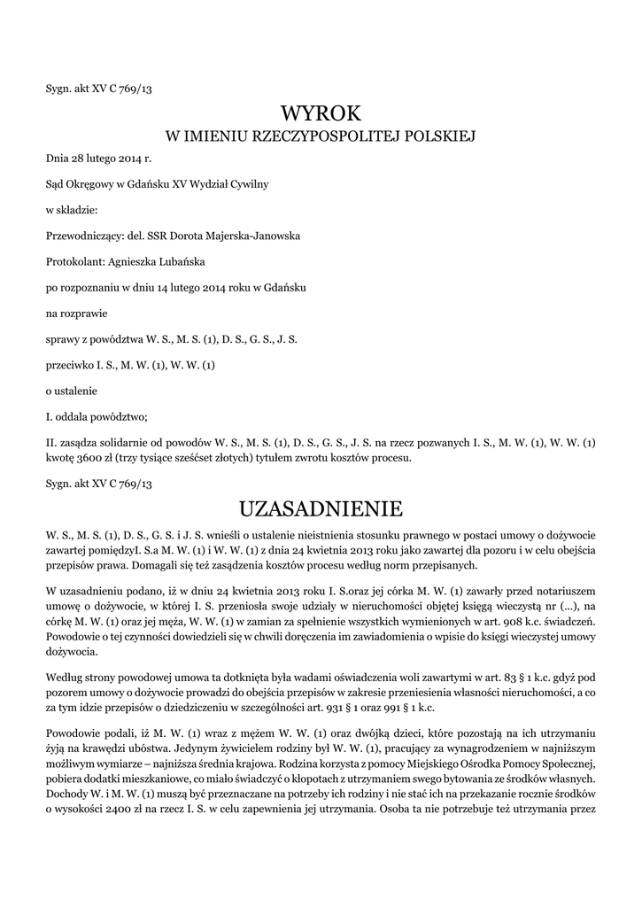 Sygn. akt XV C 769/13 WYROK W IMIENIU RZECZYPOSPOLITEJ POLSKIEJ Dnia 28 lutego 2014 r. Sąd Okręgowy w Gdańsku XV Wydział Cywilny w składzie: Przewodniczący: del. SSR Dorota Majerska-Janowska Protokolant: Agnieszka Lubańska po rozpoznaniu w dniu 14 lutego 2014 roku w Gdańsku na rozprawie sprawy z powództwa W. S., M. S. (1), D. S., G. S., J. S. przeciwko I. S., M. W. (1), W. W. (1) o ustalenie I. oddala powództwo; II. zasądza solidarnie od powodów W. S., M. S. (1), D. S., G. S., J. S. na rzecz pozwanych I. S., M. W. (1), W. W. (1) kwotę 3600 zł (trzy tysiące sześćset złotych) tytułem zwrotu kosztów procesu. Sygn. akt XV C 769/13 UZASADNIENIE W. S., M. S. (1), D. S., G. S. i J. S. wnieśli o ustalenie nieistnienia stosunku prawnego w postaci umowy o dożywocie zawartej pomiędzyI. S.a M. W. (1) i W. W. (1) z dnia 24 kwietnia 2013 roku jako zawartej dla pozoru i w celu obejścia przepisów prawa. Domagali się też zasądzenia kosztów procesu według norm przepisanych. W uzasadnieniu podano, iż w dniu 24 kwietnia 2013 roku I. S.oraz jej córka M. W. (1) zawarły przed notariuszem umowę o dożywocie, w której I. S. przeniosła swoje udziały w nieruchomości objętej księgą wieczystą nr (...), na córkę M. W. (1) oraz jej męża, W. W. (1) w zamian za spełnienie wszystkich wymienionych w art. 908 k.c. świadczeń. Powodowie o tej czynności dowiedzieli się w chwili doręczenia im zawiadomienia o wpisie do księgi wieczystej umowy dożywocia. Według strony powodowej umowa ta dotknięta była wadami oświadczenia woli zawartymi w art. 83 § 1 k.c. gdyż pod pozorem umowy o dożywocie prowadzi do obejścia przepisów w zakresie przeniesienia własności nieruchomości, a co za tym idzie przepisów o dziedziczeniu w szczególności art. 931 § 1 oraz 991 § 1 k.c. Powodowie podali, iż M. W. (1) wraz z mężem W. W. (1) oraz dwójką dzieci, które pozostają na ich utrzymaniu żyją na krawędzi ubóstwa. Jedynym żywicielem rodziny był W. W. (1), pracujący za wynagrodzeniem w najniższym możliwym wymiarze – najniższa średnia krajowa. Rodzina korzysta z pomocy Miejskiego Ośrodka Pomocy Społecznej, pobiera dodatki mieszkaniowe, co miało świadczyć o kłopotach z utrzymaniem swego bytowania ze środków własnych. Dochody W. i M. W. (1) muszą być przeznaczane na potrzeby ich rodziny i nie stać ich na przekazanie rocznie środków o wysokości 2400 zł na rzecz I. S. w celu zapewnienia jej utrzymania. Osoba ta nie potrzebuje też utrzymania przez osoby trzecie, pobiera wysoką emeryturę po zmarłym mężu, której wysokość znacznie przekracza dochody pozostałych pozwanych. Okoliczności te miały wykazać, iż M. W. (1) wraz z mężem nie są w stanie utrzymać I. S., zapewnić jej godziwego życia, opieki lekarskiej czy ewentualnego pogrzebu, o czym obie strony umowy doskonale wiedziały w chwili zawarcia umowy. Świadczenie, do którego zobowiązała się M. W. (1) i jej mąż spełnia tym samym przesłanki świadczenia niemożliwego, o którym stanowi art. 387 § 1 k.c., który stwierdza jednoznacznie, iż umowa taka jest nieważna. Powodowie uważali, iż zawierając umowę o dożywocie I. S.oraz M. W. (1) i W. W. (1) starali się obejść przepisy o dziedziczeniu, które wyraźnie przewidują udział dzieci zmarłego do spadku w przypadku dziedziczenia ustawowego oraz instytucje zachowku w przypadku dziedziczenia z testamentu. Strony umowy chciały wyłączyć w przypadku śmierci I. S. ustawowe prawo pozostałych dzieci M., D., G., J. oraz W. do dziedziczenia po swojej matce. Irena Spyra, M. W. (1) i W. W. (1) wnieśli o oddalenie powództwa oraz zasądzenie od strony powodowej na rzecz strony pozwanej kosztów procesu. Podniesiono, że czynność zmierzająca do obejścia prawa nie może być jednocześnie czynnością pozorną. Nie jest możliwe obejście prawa poprzez dokonanie czynności pozornej, choćby z tego względu, że czynność symulowana jest bezwzględnie nieważna. Obie te instytucje wzajemnie się wykluczają. Wskazano, iż zawarta umowa dożywocia nie ma cech czynności pozornej, albowiem umowa została zawarta przed notariuszem. Zaprzeczono, by składając oświadczenie pozwani w rzeczywistości nie mieli na celu dokonania tej czynności. Strony zamierzały zawrzeć umowę dożywocia i tak też uczyniły. Po jej podpisaniu, była ona wykonywana. Zaś obowiązek dożywocie nie ograniczał się wyłącznie do świadczeń pieniężnych. Wprawdzie kontrakt miał charakter ekwiwalenty, lecz nie oznaczało to, że świadczenie ma odpowiadać konkretnej kwocie pieniężnej. Dożywotnik uzyskiwał bowiem świadczenie, posiadające określony wymiar materialny, przejawiający się zaoszczędzeniu wydatków, które musiałby ponieść w związku z własnym utrzymaniem. M. i W. W. (1) dbają oI. S., bywają w jej mieszkaniu 3-4 razy w tygodniu, robią większość zakupów, gotują, robią przetwory, córka zajmuje się sprzątaniem mieszkania. Stan zdrowia matki wymaga pomocy we wszystkich czynnościach domowych. M. W. (1) zajmuje się wszelkimi sprawami dotyczącymi stanu zdrowia pozwanej, a jej mąż wozi teściową do lekarzy. Po wizycie w szpitalu, I. S.przebywała w mieszkaniu małżonków W.. Opieka ta ma walor finansowy. Gdyby czynności te nie były wykonywane przez resztę pozwanych, toI. S.musiałaby zatrudnić opiekunkę na zasadzie odpłatności. Pozwani wskazali, iż są w stanie wykonać zawartą umowę, a sytuacja materialno – finansowa przedstawiona przez powodów nie jest prawdziwa. Dysponują trzypokojowym mieszkaniem, gdzie zamieszkują wraz z synami S. – studentem oraz P. – uczniem gimnazjum. Dochody rodziny nie są wysokie, to jednak środków starcza na zaspokojenie wszystkich potrzeb. M. W. (1) z uwagi na zdrowie oraz konieczność opieki na dziećmi, zrezygnowała z zatrudnienia. Po usamodzielnieniu się dzieci, pozwana zajmowała się od 9 lat swoim teściem po zawale mięśnia sercowego. Wydatki rodziny 