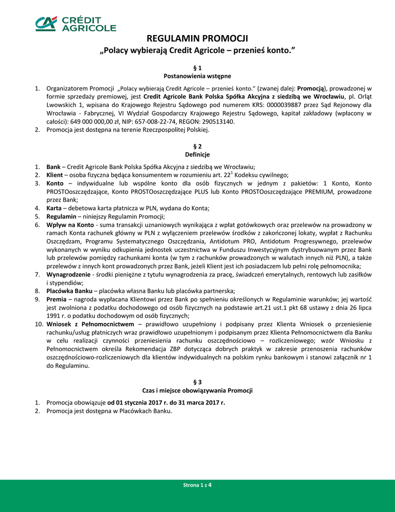 REGULAMIN PROMOCJI „Polacy wybierają Credit Agricole – przenieś konto.” §1 Postanowienia wstępne 1. Organizatorem Promocji „Polacy wybierają Credit Agricole – przenieś konto.” (zwanej dalej: Promocją), prowadzonej w formie sprzedaży premiowej, jest Credit Agricole Bank Polska Spółka Akcyjna z siedzibą we Wrocławiu, pl. Orląt Lwowskich 1, wpisana do Krajowego Rejestru Sądowego pod numerem KRS: 0000039887 przez Sąd Rejonowy dla Wrocławia - Fabrycznej, VI Wydział Gospodarczy Krajowego Rejestru Sądowego, kapitał zakładowy (wpłacony w całości): 649 000 000,00 zł, NIP: 657-008-22-74, REGON: 290513140. 2. Promocja jest dostępna na terenie Rzeczpospolitej Polskiej. §2 Definicje 1. Bank – Credit Agricole Bank Polska Spółka Akcyjna z siedzibą we Wrocławiu; 2. Klient – osoba fizyczna będąca konsumentem w rozumieniu art. 221 Kodeksu cywilnego; 3. Konto – indywidualne lub wspólne konto dla osób fizycznych w jednym z pakietów: 1 Konto, Konto PROSTOoszczędzające, Konto PROSTOoszczędzające PLUS lub Konto PROSTOoszczędzające PREMIUM, prowadzone przez Bank; 4. Karta – debetowa karta płatnicza w PLN, wydana do Konta; 5. Regulamin – niniejszy Regulamin Promocji; 6. Wpływ na Konto - suma transakcji uznaniowych wynikająca z wpłat gotówkowych oraz przelewów na prowadzony w ramach Konta rachunek główny w PLN z wyłączeniem przelewów środków z zakończonej lokaty, wypłat z Rachunku Oszczędzam, Programu Systematycznego Oszczędzania, Antidotum PRO, Antidotum Progresywnego, przelewów wykonanych w wyniku odkupienia jednostek uczestnictwa w Funduszu Inwestycyjnym dystrybuowanym przez Bank lub przelewów pomiędzy rachunkami konta (w tym z rachunków prowadzonych w walutach innych niż PLN), a także przelewów z innych kont prowadzonych przez Bank, jeżeli Klient jest ich posiadaczem lub pełni rolę pełnomocnika; 7. Wynagrodzenie - środki pieniężne z tytułu wynagrodzenia za pracę, świadczeń emerytalnych, rentowych lub zasiłków i stypendiów; 8. Placówka Banku – placówka własna Banku lub placówka partnerska; 9. Premia – nagroda wypłacana Klientowi przez Bank po spełnieniu określonych w Regulaminie warunków; jej wartość jest zwolniona z podatku dochodowego od osób fizycznych na podstawie art.21 ust.1 pkt 68 ustawy z dnia 26 lipca 1991 r. o podatku dochodowym od osób fizycznych; 10. Wniosek z Pełnomocnictwem – prawidłowo uzupełniony i podpisany przez Klienta Wniosek o przeniesienie rachunku/usług płatniczych wraz prawidłowo uzupełnionym i podpisanym przez Klienta Pełnomocnictwem dla Banku w celu realizacji czynności przeniesienia rachunku oszczędnościowo – rozliczeniowego; wzór Wniosku z Pełnomocnictwem określa Rekomendacja ZBP dotycząca dobrych praktyk w zakresie przenoszenia rachunków oszczędnościowo-rozliczeniowych dla klientów indywidualnych na polskim rynku bankowym i stanowi załącznik nr 1 do Regulaminu. §3 Czas i miejsce obowiązywania Promocji 1. Promocja obowiązuje od 01 stycznia 2017 r. do 31 marca 2017 r. 2. Promocja jest dostępna w Placówkach Banku. Strona 1 z 4 §4 Uczestnictwo w Promocji 1. Z Promocji może skorzystać Klient , który spełni łącznie poniższe warunki: 1) zawrze umowę Konta, złoży wniosek o wydanie Karty oraz zawrze jednocześnie umowę Bankowości Elektronicznej CA24 (umowę o dostęp do Konta za pośrednictwem serwisu internetowego CA 24 lub telefonicznego CA24, pod warunkiem nadania przez Posiadacza Konta hasła do danego serwisu i wyboru wyciągu z Konta w formie elektronicznej, 2) złoży Wniosek z Pełnomocnictwem zgodnie z postanowieniami Regulaminu, 3) zapewni stałe wpływy na Konto zgodnie z postanowieniami Regulaminu, 4) nie wyrazi sprzeciwu wobec działań marketingowych Banku, 5) wyrazi zgodę na otrzymywanie informacji handlowej drogą elektroniczną oraz poda w tym celu swój numer telefonu komórkowego oraz adres poczty elektroniczne (e-mail). 2. Z Promocji może skorzystać także Klient, który będąc Posiadaczem konta indywidualnego lub jednym z Posiadaczy konta wspólnego, prowadzonego w Pakiecie Depozytowym złoży dyspozycję zmiany pakietu tego konta na jeden ze wskazanych w § 2 ust. 3 oraz spełni pozostałe warunki wskazane w niniejszym paragrafie. 3. Z Promocji nie może skorzystać Klient, który w okresie do 1 roku przed datą otwarcia Konta była Posiadaczem Konta indywidualnego lub jednym z Posiadaczy Konta wspólnego prowadzonego przez Bank w pakiecie innym niż Pakiet Depozytowy. §5 Stałe wpływy na Konto Warunek zapewnienia stałych wpływów na Konto uważa się za spełniony, jeżeli Klient: 1) wypełni i podpisze „Zlecenie przekazywania środków” oraz wskaże we Wniosku z Pełnomocnictwem nazwę i adres instytucji przekazującej Wynagrodzenie, która ma być powiadomiona przez Bank o zmianie rachunku bankowego Klienta oraz 2) zapewni Wpływ na Konto, co najmniej raz w każdym miesiącu kalendarzowym, kwoty zadeklarowanej na „Zleceniu przekazywania środków”, na kwotę nie mniejszą niż 3000 zł przez co najmniej trzy następujące po sobie miesiące kalendarzowe, przy czym pierwszy Wpływ na Konto określony powyżej powinien zasilić Konto najpóźniej do końca kolejnego miesiąca kalendarzowego przypadającego po dniu otwarcia Konta. §6 Zasady przyznawania Premii 1. Klient spełniający warunki Regulaminu jest uprawniony do uzyskania jednorazowej Premii w kwocie 200 zł (słownie: dwieście złotych). 2. Wypłata kwoty Premii na rachunek Konta Klienta nastąpi nie później niż na koniec kolejnego miesiąca kalendarzowego po spełnieniu przez Klienta wszystkich warunków określonych w Regulaminie. 3. W celu przeniesienia Konta Klient otwiera Konto oraz składa w Placówce Banku Wniosek z Pełnomocnictwem, w którym wskazuje co najmniej: a. nazwę dotychczasowego banku (lista banków uczestniczących w procesie przenoszenia rachunku/usług płatniczych stanowi Załącznik nr 2 do Regulaminu), b. p