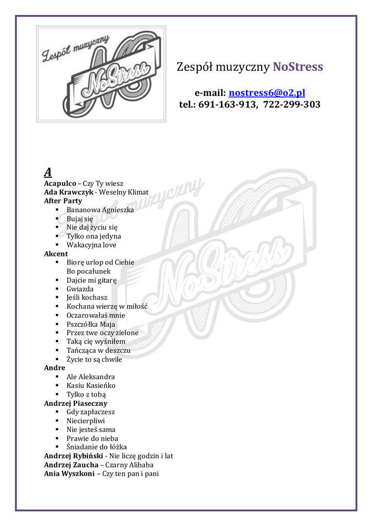 Zespół muzyczny NoStress e-mail: [email protected] tel.: 691-163-913, 722-299-303 A Acapulco – Czy Ty wiesz Ada Krawczyk - Weselny Klimat After Party Bananowa Agnieszka Bujaj się Nie daj życiu się Tylko ona jedyna Wakacyjna love Akcent Biorę urlop od Ciebie Bo pocałunek Dajcie mi gitarę Gwiazda Jeśli kochasz Kochana wierzę w miłość Oczarowałaś mnie Pszczółka Maja Przez twe oczy zielone Taką cię wyśniłem Tańcząca w deszczu Życie to są chwile Andre Ale Aleksandra Kasiu Kasieńko Tylko z tobą Andrzej Piaseczny Gdy zapłaczesz Niecierpliwi Nie jesteś sama Prawie do nieba Śniadanie do łóżka Andrzej Rybiński - Nie liczę godzin i lat Andrzej Zaucha – Czarny Alibaba Ania Wyszkoni – Czy ten pan i pani Anna Jantar Baju baj Przetańczyć z tobą chcę Arek Kopaczewski - Malowane Usta Avanti – Nic do stracenia AYA RL - Skóra B Baciary 7 czerwonych róż Agnieszka Jak się bawią ludzie Wietrze wiej Wódko ma Zostań tu ze mną na zawsze Żyje się raz Bad boys blue - Gimme gimme your lovin Bayer full Ballada o Płocku Blondyneczka Majteczki w kropeczki Moja muzyka Tort weselny Biesiada 4 razy po 2 razy Biały miś Camment ca va Casablanca Cipuleńka Cyganeczka Janeczka Cyganeczka Zosia Czerwone i bure Gdybym miał gitarę Głęboka studzienka Granica Hej bystra woda Hej hej hej cyganie Hej Sokoły I jo se też musioł I znowy nie przespana noc Kalina malina Kawiarenki Malowany wóz Maryjanka Mix biesiadny Mydełko Fa Na opolskim rynku Na zamku Ore ore Panno Walerciu Pocałuj mnie mój kochany Rezerwa Riki tiki Skrzypeczki Szła dzieweczka Wiła wianki Wsią dal Wysokie płoty W zielonym gaju Z tamtej strony wisły Zabrałaś serce moje Za górami, za lasami Zagraj mi piękny cyganie Złoty krążek Big Cyc Facet to świnia Makumba ska Rudy się żeni Świat według Kiepskich Big Dance -Gaz gaz Bobi Halo Halo Pocałuj mnie Boys Bawmy się Białe łabędzie Chłop z Mazur Jagódka Jaki piękny świat Jesteś szalona Kochana uwierz mi Lody Łobuz Magdaleno Tu jest Wolność Budka Suflera Jolka Jolka Piąty bieg C Casanova - Nikt na świecie Classic Biodro przy bioderku Jeszcze dzień najwyżej dwa Cliver Bożena Chodź Kochanie Moje ciało oszalało Podnieście w górę ręce Pokaż jak się kręcisz Twoje uda Code red – Kanikuły (PL) Czadoman Chodź na kolana Ruda tańczy jak szalona Czerwone gitary Anna Maria Lecz tylko na chwilę Matura Najpiękniejsza Senny szept Czesław Niemen - Wspomnienie D Dance Express – Jolka Jolanta De Mono – Póki na to czas DJ DISCO Feat. MC POLO – Szalona ruda Domino – Filmowa miłość Drossel Ach te oczy Twe Co ja zrobiłem, że się ożeniłem Ja chcę mieć żonę Mariolka To ten klub Dystans Kalifornia Ty tego nie wiesz Za oknem deszcz Dżem Sen o Victorii Wehikuł czasu Whisky E Edyta Geppert - Szukaj mnie Effect - Żono jak bardzo Cię kocham Eleni Troszeczkę ziemi Tylko w twoich dłoniach Enej Radio hello Skrzydlate ręce Tak smakuje życie Ewa Farna - Cisza F Fanatic – Czarownica Fancy – Flames of love G Gesek -Nago nago Golec Uorkiestra Lornetka Ściernisko Gusttavo Lima - Balada H Halina Frąckowiak - Papierowy księżyc Happy End - Jak się masz Kochanie Hi-Fi -Loczki I Ich Troje – Powiedz Imperium Zakochany klaun Żółte tulipany Implus Dwa jabłuszka Sexualnie niebezpieczna Impress – Na sianeczku sianie Ira – Nie daj mi odejść Irena Santor - Tych lat nie odda nikt Ivan Komarenko Biała suknia Jej czarne oczy Izabela Trojanowska - Wszystko, czego dziś chcę J Janusz Laskowski Beata z Albatrosa Świat nie wierzy łzom Jorrgus Hej hej w górę Kiedy patrzę na nią Na zabawie Junior –Nastolatka Jurij Shatunov – Bielyje rozy K Kancelaria - Zabiorę cię K.A.S.A. – Piękniejsza Kolor – Kochaj kochaj Kombi Avinion Hey rock and rool Pokolenie Kordian -Dziewczyna z gór Krzysztof Krawczyk Bo jesteś ty Byle było tak Jak przeżyć wszystko jeszcze raz Upływa szybko życie Zatańczysz ze mną Kukiz Całuj mnie Miasto budzi się L Lady Pank Dziewczyny dzisiaj z byle kim nie tańczą Mniej niż zero Tacy sami Zawsze tam gdzie Ty Zostawcie titanica Lombard Przeżyj to sam Szklana pogoda Long&Junor Helenka Kolorowa sukienka Tańcz tańcz Loka - Prawdziwe Powietrze Love System – Noc z Renatą Lukash Bambina Chciałbym ci powiedzieć M Manaam Cykady na Cykladach Nie poganiaj mnie Marek i Kasia – Czary Mary Marcin Siegieńczuk YABADABADU Sąsiadka Marek Grechuta – Nie dokazuj Maria Koterbska - Serduszko Puka Maryla Rodowicz – Konik na biegunach Masters Szukam dziewczyny Wybacz mi Żono moja Maxel Lekcja miłości Letni czas Meffis Bad boy lowelas Ruda Usta milczą Podnieście w górę ręce Życia smak Mega Dance – Ewa odeszła Megam - Pomarańczowe lato Megustar - Baja bongo Mig Co Ty mi dasz Jej dotyk Miód malina Nie ma mocnych na Mariolę Tak byś chciała Wymarzona Milano Bara bara Brązowe oczy Jasnowłosa Kasiu Katarzyno Osiemnastka O tobie kochana Model MT – Biała róża Modern Talking – Cheri Cheri Lady Mr Zoob – Kawałek podłogi O Okej – Czarne oczy masz O-Zone – Dragostea din tei (PL) P Paradoks – Noce nad jeziorem Paula – Od dziś Pectus –Barcelona Perfect Nie płacz Ewka Raz po raz Piersi – Bałkanica Prokar – Spowiedź Poparzeni kawą trzy Byłaś dla mnie wszystkim Kawałek do tańca Power Play 90 km Bez Ciebie Chce się żyć Co za noc Gdy jesteś ze mną Gwiazda z nieba Hana hana Ja wole Ole Karty biel Kochaj mnie Na zawsze NajPiekne Nie bo nie Powiedz że chcesz Skok w bok Suknie kolorowe Teraz albo nigdy Zawsze coś(oj tam oj tam) Pudzian Cała sala buja się Takich już nie ma R Redox -Biznesmen Ronan Keating - When you say nothing at all S Savage - Only you Seweryn Krajewski - Wielka miłość Shantel - A Ty daj Skalar - Nie zabieraj mi strun Skaldowie -Ktoś mnie pokochał Skaner Lato w Kołobrzegu Nadzieja Pociąg do gwiazd Wolność moja jedyna Solaris – I już zawsze tak będzie Soleo Ania i Hania Słodko słodka Stachursky - Z Każdym Twy