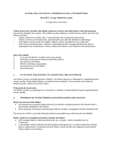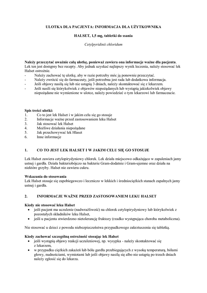 ULOTKA DLA PACJENTA: INFORMACJA DLA UŻYTKOWNIKA HALSET, 1,5 mg, tabletki do ssania Cetylpyridinii chloridum Należy przeczytać uważnie całą ulotkę, ponieważ zawiera ona informacje ważne dla pacjenta. Lek ten jest dostępny bez recepty. Aby jednak uzyskać najlepszy wynik leczenia, należy stosować lek Halset ostrożnie. Należy zachować tę ulotkę, aby w razie potrzeby móc ją ponownie przeczytać. Należy zwrócić się do farmaceuty, jeśli potrzebna jest rada lub dodatkowa informacja. Jeśli objawy nasilą się lub nie ustąpią 3 dniach, należy skontaktować się z lekarzem. Jeśli nasili się którykolwiek z objawów niepożądanych lub wystąpią jakiekolwiek objawy niepożądane nie wymienione w ulotce, należy powiedzieć o tym lekarzowi lub farmaceucie. Spis treści ulotki: 1. Co to jest lek Halset i w jakim celu się go stosuje 2. Informacje ważne przed zastosowaniem leku Halset 3. Jak stosować lek Halset 4. Możliwe działania niepożądane 5. Jak przechowywać lek Hlaset 6. Inne informacje 1. CO TO JEST LEK HALSET I W JAKIM CELU SIĘ GO STOSUJE Lek Halset zawiera cetylopirydyniowy chlorek. Lek działa miejscowo odkażająco w zapaleniach jamy ustnej i gardła. Działa bakteriobójczo na bakterie Gram-dodatnie i Gram-ujemne oraz działa na niektóre grzyby. Halset nie zawiera cukru. Wskazania do stosowania Lek Halset stosuje się zapobiegawczo i leczniczo w lekkich i średniociężkich stanach zapalnych jamy ustnej i gardła. 2. INFORMACJE WAŻNE PRZED ZASTOSOWANIEM LEKU HALSET Kiedy nie stosować leku Halset jeśli pacjent ma uczulenie (nadwrażliwość) na chlorek cetylopirydyniowy lub którykolwiek z pozostałych składników leku Halset, jeśli u pacjenta stwierdzono nietolerancję fruktozy (rzadko występująca choroba metaboliczna). Nie stosować u dzieci z powodu niebezpieczeństwa przypadkowego zakrztuszenia się tabletką. Kiedy zachować szczególną ostrożność stosując lek Halset jeśli wystąpią objawy reakcji uczuleniowej, np. wysypka - należy skontaktować się z lekarzem, w przypadku ciężkich zakażeń lub bólu gardła przebiegających z wysoką temperaturą, bólami głowy, nudnościami, wymiotami lub jeśli objawy nasilą się albo nie ustąpią po trzech dniach należy zgłosić się do lekarza. Stosowanie innych leków Należy powiedzieć lekarzowi lub farmaceucie o wszystkich przyjmowanych aktualnie lub ostatnio lekach, również tych, które wydawane są bez recepty. Ciąża i karmienie piersią Przed zastosowaniem jakiegokolwiek leku należy poradzić się lekarza lub farmaceuty. Prowadzenie pojazdów i obsługiwanie maszyn Brak danych dotyczących wpływu leku na zdolność prowadzenia pojazdów mechanicznych i obsługiwania urządzeń mechanicznych będących w ruchu. Ważne informacje o niektórych składnikach leku Halset Lek zawiera sorbitol. Jedna tabletka do ssania zawiera 742,35 mg sorbitolu. Jeżeli stwierdzono wcześniej u pacjenta nietolerancję niektórych cukrów, pacjent powinien skontaktować się z lekarzem przed przyjęciem leku (patrz punkt Kiedy nie stosować leku Halset). Wartość kaloryczna 2,6 kcal/g sorbitolu. 3. JAK STOSOWAĆ LEK HALSET Lek Halset należy stosować zgodnie z informacjami podanymi w tej ulotce. W razie wątpliwości należy skontaktować się z lekarzem lub farmaceutą. Tabletki Halset stosować doustnie. Ssać powoli po jednej tabletce. Zazwyczaj stosowana dawka: Dorośli i młodzież: ssać 1 tabletkę co 1-2 godziny (maksymalnie 8 tabletek na dobę). Stosowanie u dzieci Dzieci w wieku powyżej 6 lat: ssać 1 tabletkę co 2-3 godziny (maksymalnie 6 tabletek na dobę). Nie zaleca się stosowania u dzieci w wieku poniżej 6 lat. Zastosowanie większej niż zalecana dawki leku Halset Stosowanie większej liczby tabletek Halset niż zalecane może spowodować podrażnienie błony śluzowej jamy ustnej, biegunkę (szczególnie u dzieci), nudności, wymioty. W razie przyjęcia większej niż zalecana dawki leku, należy zwrócić się do lekarza lub farmaceuty. Pominięcie zastosowania leku Halset Nie należy stosować dawki podwójnej w celu uzupełnienia pominiętej dawki. Przerwanie stosowania leku Halset W razie jakichkolwiek dalszych wątpliwości związanych ze stosowaniem leku należy zwrócić się do lekarza lub farmaceuty. 4. MOŻLIWE DZIAŁANIA NIEPOŻĄDANE Jak każdy lek, Halset może powodować działania niepożądane, chociaż nie u każdego one wystąpią. Rzadko występują reakcje alergiczne (np. pokrzywka, wysypka), uczucie pieczenia w jamie ustnej, nudności i przemijające zaburzenia smaku. Jeśli nasili się którykolwiek z objawów niepożądanych lub wystąpią jakiekolwiek objawy niepożądane niewymienione w ulotce, należy powiedzieć o tym lekarzowi lub farmaceucie. 5. JAK PRZECHOWYWAĆ LEK HALSET Przechowywać w miejscu niedostępnym i niewidocznym dla dzieci. Lek należy przechowywać w temperaturze poniżej 25°C. Nie stosować leku Halset po upływie terminu ważności zamieszczonego na pudełku. Termin ważności oznacza ostatni dzień danego miesiąca. Leków nie należy wyrzucać do kanalizacji ani domowych pojemników na odpadki. Należy zapytać farmaceutę co zrobić z lekami, które nie są już potrzebne. Takie postępowanie pomoże chronić środowisko. 6. INNE INFORMACJE Co zawiera lek Halset Substancją czynną leku jest cetylopirydyniowy chlorek jednowodny. Jedna tabletka do ssania zawiera 1,5 mg cetylopirydyniowego chlorku jednowodnego. Ponadto lek zawiera sorbitol, olejek miętowy, mentol, magnezu stearynian. Jak wygląda lek Halset i co zawiera opakowanie Tabletki do ssania. Tabletki Halset są prostokątne, obustronnie płaskie, o gładkiej powierzchni, zaokrąglonych narożnikach i krawędziach, białe, z połyskiem, o słodkim, miętowym smaku i mentolowym zapachu. Wielkość opakowania: 18 lub 24 tabletek. Podmiot odpowiedzialny i wytwórca BIOFARM Sp. z o.o. ul. Wałbrzyska 13 60-198 Poznań Polska Tel. 061 66 51 500 W celu uzyskania bardziej 