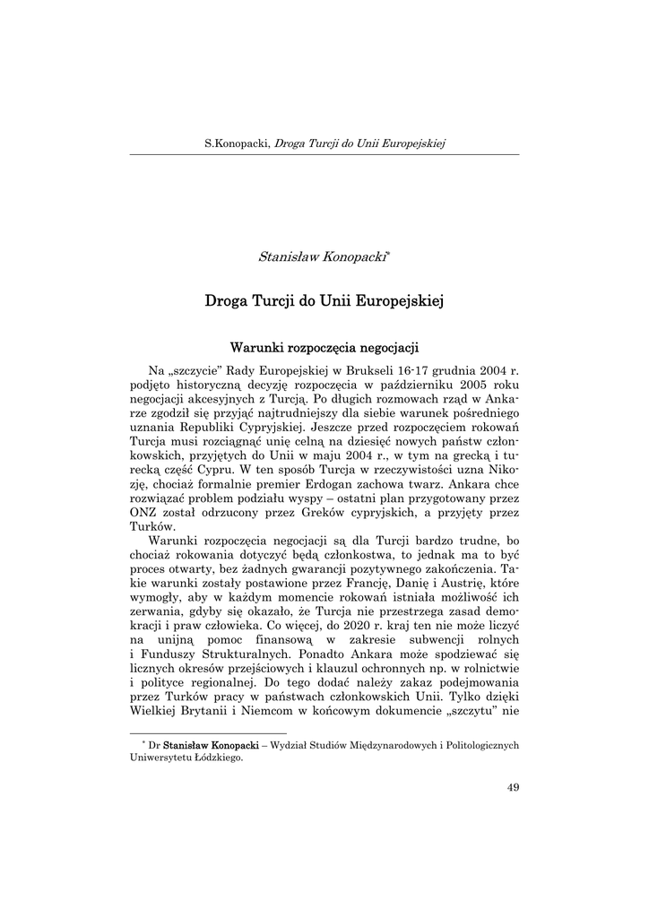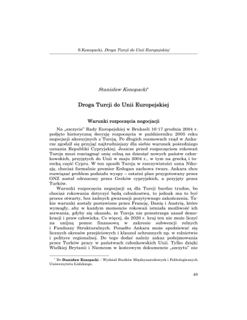 S.Konopacki, Droga Turcji do Unii Europejskiej Stanisław Konopacki * Droga Turcji do Unii Europejskiej Warunki rozpoczęcia negocjacji Na „szczycie” Rady Europejskiej w Brukseli 16-17 grudnia 2004 r. podjęto historyczną decyzję rozpoczęcia w październiku 2005 roku negocjacji akcesyjnych z Turcją. Po długich rozmowach rząd w Ankarze zgodził się przyjąć najtrudniejszy dla siebie warunek pośredniego uznania Republiki Cypryjskiej. Jeszcze przed rozpoczęciem rokowań Turcja musi rozciągnąć unię celną na dziesięć nowych państw członkowskich, przyjętych do Unii w maju 2004 r., w tym na grecką i turecką część Cypru. W ten sposób Turcja w rzeczywistości uzna Nikozję, chociaż formalnie premier Erdogan zachowa twarz. Ankara chce rozwiązać problem podziału wyspy – ostatni plan przygotowany przez ONZ został odrzucony przez Greków cypryjskich, a przyjęty przez Turków. Warunki rozpoczęcia negocjacji są dla Turcji bardzo trudne, bo chociaż rokowania dotyczyć będą członkostwa, to jednak ma to być proces otwarty, bez żadnych gwarancji pozytywnego zakończenia. Takie warunki zostały postawione przez Francję, Danię i Austrię, które wymogły, aby w każdym momencie rokowań istniała możliwość ich zerwania, gdyby się okazało, że Turcja nie przestrzega zasad demokracji i praw człowieka. Co więcej, do 2020 r. kraj ten nie może liczyć na unijną pomoc finansową w zakresie subwencji rolnych i Funduszy Strukturalnych. Ponadto Ankara może spodziewać się licznych okresów przejściowych i klauzul ochronnych np. w rolnictwie i polityce regionalnej. Do tego dodać należy zakaz podejmowania przez Turków pracy w państwach członkowskich Unii. Tylko dzięki Wielkiej Brytanii i Niemcom w końcowym dokumencie „szczytu” nie * Dr Stanisław Konopacki – Wydział Studiów Międzynarodowych i Politologicznych Uniwersytetu Łódzkiego. 49 Studia Europejskie, 1/2005 znalazł się zapis stwierdzający, że alternatywą dla Turcji może być „specjalne partnerstwo z Unią”. Decyzja Rady Europejskiej odwołuje się ponadto do tzw. czwartego kryterium kopenhaskiego zwracającego uwagę na fakt, iż rozszerzenie Unii o Turcję nie powinno zagrozić dynamice integracji europejskiej. Premier Erdogan, przyjmując ostatecznie unijne kryteria rozpoczęcia negocjacji, był świadom ich niezwykłej trudności, czemu dał wyraz w swym przemówieniu do narodu wygłoszonym po powrocie z Brukseli. Zwracając się do rodaków powiedział, iż: „odtąd każde działanie, które podejmiemy przybliży nas do ostatecznego celu. Jednak proces będzie niezwykle trudny i usiany jeszcze większymi przeszkodami”. 1 Rzeczywiście skala zadań, jakie stoją przed Turcją jest ogromna. Nie tylko musi wdrożyć do swego prawodawstwa 80 tys. stron prawa wspólnotowego i kontynuować rozpoczęte reformy. Jej członkostwo w Unii zależy również od wyników referendów akcesyjnych, jakie po zakończeniu negocjacji odbędą się w niektórych państw członkowskich. Należy zwrócić uwagę na fakt, iż obecnie w państwach UE wcale nie mała część opinii publicznej jest przeciwna akcesji Turcji. Tak np. centroprawicowy odłam Chrześcijańskiej Demokracji w Niemczech (będącej aktualnie w opozycji) zapowiada, że po dojściu do władzy zawiesi negocjacje z Turcją. Z kolei prezydent Francji Jacques Chirac osobiście opowiadając się za członkostwem Turcji, jednocześnie podkreśla, że po zakończeniu negocjacji z Ankarą, to społeczeństwo francuskie zadecyduje w referendum o jej przyjęciu do Unii. Podobnie postanowił rząd austriacki. Proces dostosowywania się Ankary do wymogów unijnych będzie monitorowany przez Komisję Europejską, która szczególne znaczenie przywiązywać będzie do postępów w zakresie praw człowieka, zniesienia tortur, zwiększenia praw religijnych i mniejszości narodowych. Istotnym momentem poprzedzającym rozpoczęcie rokowań będzie stanowisko wszystkich państw członkowskich, które w kwietniu 2005 r. muszą podjąć decyzję odnośnie do mandatu negocjacyjnego Komisji. Początki kontaktów Turcji ze Wspólnotami Europejskimi Turcja została przyjęta do Rady Europy, stojącej na straży europejskich wartości i zasad, w sierpniu 1949 r. po spełnieniu dwu warunków członkostwa: uznania za kraj europejski, jak również prze1 Cyt. za: A.Akcakoca, Turkey on its way to EU accession – challenge ahead, CEPC, 2004, s.1. 50 S.Konopacki, Droga Turcji do Unii Europejskiej strzegania praw człowieka, pluralizmu demokratycznego i reguł państwa prawa. Wiarygodność Turcji nie była wówczas kwestią sporną, a jej przynależność do obozu państw zachodnich w okresie „zimnej wojny” stała się sprawą o kapitalnym znaczeniu. W 1951 r. Ankara przystąpiła do Paktu Północnoatlantyckiego, tworząc istotny element euroatlantyckiego systemu obrony. Następnie została członkiem Organizacji Współpracy Gospodarczej i Rozwoju (OECD), Konferencji Bezpieczeństwa i Współpracy w Europie oraz Europejskiego Banku Odbudowy i Rozwoju. Z wyjątkiem Unii Europejskiej, Turcja jest członkiem niemal wszystkich ważnych organizacji europejskich. 2 W 1959 r. Turcja złożyła wniosek o stowarzyszenie z Europejską Wspólnotą Gospodarczą. Po pewnym opóźnieniu, spowodowanym przewrotem wojskowym w 1960 r., podpisano umowę stowarzyszeniową w 1963 r. W jednym z artykułów tego dokumentu zawarte było postanowienie, iż po wypełnieniu przez Turcję wszystkich warunków Traktatu Rzymskiego, strony rozważą możliwość przystąpienia tego kraju do Wspólnoty. Głównym elementem umowy stowarzyszeniowej było stopniowe wprowadzenie unii celnej, która ostatecznie – po wielu opóźnieniach – weszła w życie w 1996 r. Przyczyniła się ona do zniesienia ceł i kwot w handlu między Unią a Turcją, jednak wbrew pierwotnym planom nie osiągnięto porozumienia w zakresie swobodnego przepływu osób, usług i kapitału. W 1987 r. Turcj