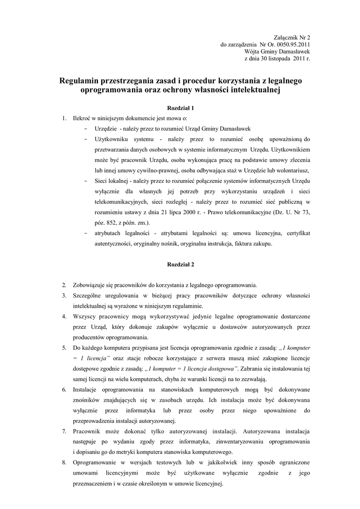 Załącznik Nr 2 do zarządzenia Nr Or. 0050.95.2011 Wójta Gminy Damasławek z dnia 30 listopada 2011 r. Regulamin przestrzegania zasad i procedur korzystania z legalnego oprogramowania oraz ochrony własności intelektualnej Rozdział 1 1. Ilekroć w niniejszym dokumencie jest mowa o: - Urzędzie - należy przez to rozumieć Urząd Gminy Damasławek - Użytkowniku systemu - należy przez to rozumieć osobę upoważnioną do przetwarzania danych osobowych w systemie informatycznym Urzędu. Użytkownikiem może być pracownik Urzędu, osoba wykonująca pracę na podstawie umowy zlecenia lub innej umowy cywilno-prawnej, osoba odbywająca staż w Urzędzie lub wolontariusz, - Sieci lokalnej - należy przez to rozumieć połączenie systemów informatycznych Urzędu wyłącznie dla własnych jej potrzeb przy wykorzystaniu urządzeń i sieci telekomunikacyjnych, sieci rozległej - należy przez to rozumieć sieć publiczną w rozumieniu ustawy z dnia 21 lipca 2000 r. - Prawo telekomunikacyjne (Dz. U. Nr 73, póz. 852, z późn. zm.). - atrybutach legalności - atrybutami legalności są: umowa licencyjna, certyfikat autentyczności, oryginalny nośnik, oryginalna instrukcja, faktura zakupu. Rozdział 2 2. Zobowiązuje się pracowników do korzystania z legalnego oprogramowania. 3. Szczególne uregulowania w bieżącej pracy pracowników dotyczące ochrony własności intelektualnej są wyrażone w niniejszym regulaminie. 4. Wszyscy pracownicy mogą wykorzystywać jedynie legalne oprogramowanie dostarczone przez Urząd, który dokonuje zakupów wyłącznie u dostawców autoryzowanych przez producentów oprogramowania. 5. Do każdego komputera przypisana jest licencja oprogramowania zgodnie z zasadą: „1 komputer = 1 licencja” oraz stacje robocze korzystające z serwera muszą mieć zakupione licencje dostępowe zgodnie z zasadą: „1 komputer = 1 licencja dostępowa”. Zabrania się instalowania tej samej licencji na wielu komputerach, chyba że warunki licencji na to zezwalają. 6. Instalacje oprogramowania na stanowiskach komputerowych mogą być dokonywane znośników znajdujących się w zasobach urzędu. Ich instalacja może być dokonywana wyłącznie przez informatyka lub przez osoby przez niego upoważnione do przeprowadzenia instalacji autoryzowanej. 7. Pracownik może dokonać tylko autoryzowanej instalacji. Autoryzowana instalacja następuje po wydaniu zgody przez informatyka, zinwentaryzowaniu oprogramowania i dopisaniu go do metryki komputera stanowiska komputerowego. 8. Oprogramowanie w wersjach testowych lub w jakikolwiek inny sposób ograniczone umowami licencyjnymi może być użytkowane wyłącznie przeznaczeniem i w czasie określonym w umowie licencyjnej. zgodnie z jego 9. Nośniki oprogramowania znajdują się w na stanowisku informatyka Urzędu lub na serwerze zasobów, do których dostęp mają informatyk lub upoważnione osoby. Nośniki oprogramowania nie mogą znajdować się w żadnym innym miejscu, a szczególnie nie mogą być kopiowane, wypożyczane lub w żaden sposób przekazywane osobom trzecim. Dotyczy to również kodów aktywacyjnych produktów. 10. Zgromadzenie oprogramowania wraz z dowodami potwierdzającymi ich legalność (dokumentacja, certyfikaty, licencje, nośniki, książki, kopie faktur) i przetrzymywanie ich w wyodrębnionym miejscu, niedostępnym dla pozostałych pracowników należy do obowiązków informatyka. 11. Każdy z pracowników zobowiązany jest do podpisania „metryki komputera", z wymienionym w niej oprogramowaniem, na które pracodawca posiada licencje, a ,z którego pracownik korzysta w związku z wykonywaniem obowiązków służbowych. Metryka komputera jest wydrukiem z programu zarządzającego zasobami programowymi i sprzętowymi urzędu. 12. Pracownicy przyjmują, do wiadomości informacje o konieczności pracy wyłącznie na oprogramowaniu wymienionym w „metryce komputera". 13. Pracownicy otrzymują wyraźny zakaz wnoszenia na teren zakładu pracy prywatnych kopii oprogramowania oraz kopiowania z pamięci przenośnych i pobierania z internetu „utworów" będących przedmiotem ochrony praw autorskich.(programy komputerowe, utwory muzyczne, filmy, gry komputerowe, itp.). 14. Konieczne zakupy oprogramowania lub instalowanie oprogramowania nie będącego w zasobach urzędu realizuje informatyk po uzgodnieniu z kierownictwem. 15. Naruszenia wyżej wymienionych ustaleń, ze względu na obowiązujące przepisy prawne stanowią poważne naruszenie dyscypliny pracy. 16. Każdy z pracowników zobowiązany jest podpisać niniejsze zarządzenie zobowiązując się do przestrzegania zasad i procedur wynikających z niniejszego regulaminu. 17. Zezwala się pracownikom na korzystanie z przenośnego komputera służbowego poza miejscem pracy, pod warunkiem przestrzegania zasad wymienianych poniżej : a) wszyscy pracownicy urzędu korzystający z komputerów przenośnych mogą korzystać z nich poza miejscem pracy zachowując obowiązujące w Urzędzie zasady korzystania z oprogramowania oraz obowiązującej „Polityki Bezpieczeństwa i Instrukcji Zarządzania Systemem Informatycznym Urzędu Gminy Damasławek, b) zabrania się użyczania komputerów osobom postronnym, c) naruszenia wyżej wymienionych ustaleń, ze względu na obowiązujące przepisy prawne stanowią poważne naruszenie dyscypliny pracy. Rozdział 3 18. Likwidacji podlega oprogramowanie komputerowe, które: a) nie są i nie będą mogły być wykorzystywane w realizacji zadań związanych z działalnością jednostki; b) nie nadaje się do współpracy z pozostałym sprzętem lub/i oprogramowaniem w jednostce, a ich przystosowanie byłoby technicznie i ekonomicznie nieuzasadnione; c) podczas przeprowadzonej inwentaryzacji oprogramowania wykryto braki odpowiedniej liczby atrybutów legalności. 19. Likwidacja oprogramowania: a) W przypadku gdy oprogramowanie zostało zakupione w licencji OEM, jego likwidacja następuje równocześnie z likwidacją sprzętu z którym z