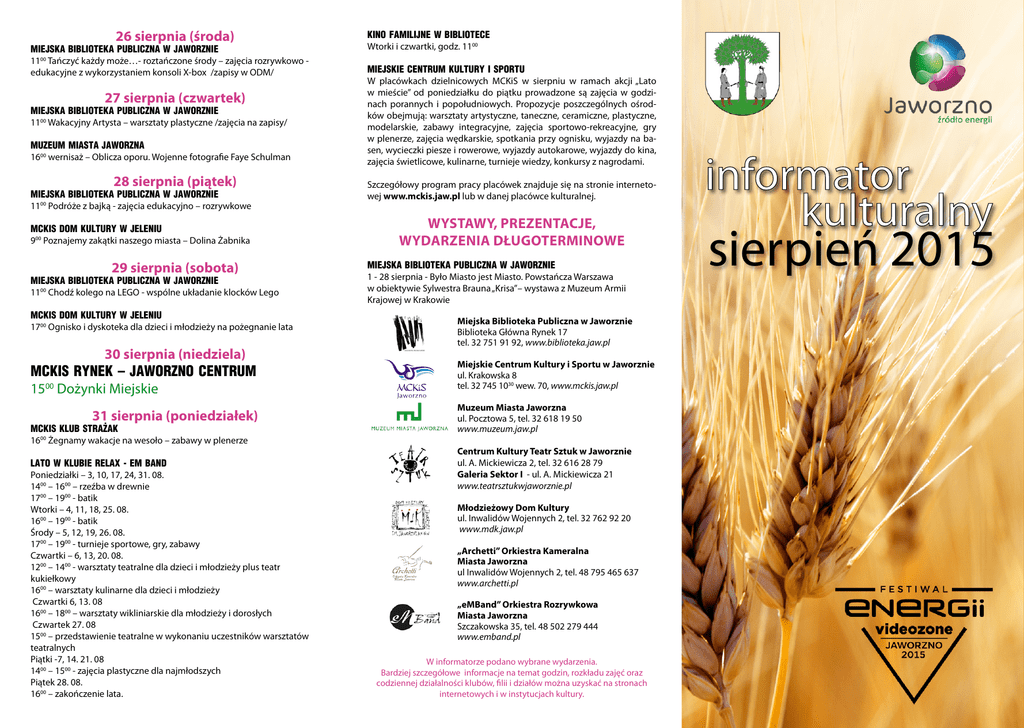 26 sierpnia (środa) Miejska Biblioteka Publiczna w Jaworznie 1100 Tańczyć każdy może…- roztańczone środy – zajęcia rozrywkowo edukacyjne z wykorzystaniem konsoli X-box /zapisy w ODM/ 27 sierpnia (czwartek) Miejska Biblioteka Publiczna w Jaworznie 1100 Wakacyjny Artysta – warsztaty plastyczne /zajęcia na zapisy/ Muzeum Miasta Jaworzna 1600 wernisaż – Oblicza oporu. Wojenne fotografie Faye Schulman 28 sierpnia (piątek) Miejska Biblioteka Publiczna w Jaworznie 1100 Podróże z bajką - zajęcia edukacyjno – rozrywkowe MCKiS Dom Kultury w Jeleniu 900 Poznajemy zakątki naszego miasta – Dolina Żabnika 29 sierpnia (sobota) Miejska Biblioteka Publiczna w Jaworznie 1100 Chodź kolego na LEGO - wspólne układanie klocków Lego MCKiS Dom Kultury w Jeleniu 1700 Ognisko i dyskoteka dla dzieci i młodzieży na pożegnanie lata 30 sierpnia (niedziela) MCKiS Rynek – Jaworzno Centrum 1500 Dożynki Miejskie 31 sierpnia (poniedziałek) MCKiS Klub Strażak 1600 Żegnamy wakacje na wesoło – zabawy w plenerze Lato w Klubie Relax - eM Band Poniedziałki – 3, 10, 17, 24, 31. 08. 1400 – 1600 – rzeźba w drewnie 1700 – 1900 - batik Wtorki – 4, 11, 18, 25. 08. 1600 – 1900 - batik Środy – 5, 12, 19, 26. 08. 1700 – 1900 - turnieje sportowe, gry, zabawy Czwartki – 6, 13, 20. 08. 1200 – 1400 - warsztaty teatralne dla dzieci i młodzieży plus teatr kukiełkowy 1600 – warsztaty kulinarne dla dzieci i młodzieży Czwartki 6, 13. 08 1600 – 1800 – warsztaty wikliniarskie dla młodzieży i dorosłych Czwartek 27. 08 1500 – przedstawienie teatralne w wykonaniu uczestników warsztatów teatralnych Piątki -7, 14. 21. 08 1400 – 1500 - zajęcia plastyczne dla najmłodszych Piątek 28. 08. 1600 – zakończenie lata. KINO FAMILIJNE W BIBLIOTECE Wtorki i czwartki, godz. 1100 Miejskie Centrum Kultury i Sportu W placówkach dzielnicowych MCKiS w sierpniu w ramach akcji „Lato w mieście” od poniedziałku do piątku prowadzone są zajęcia w godzinach porannych i popołudniowych. Propozycje poszczególnych ośrodków obejmują: warsztaty artystyczne, taneczne, ceramiczne, plastyczne, modelarskie, zabawy integracyjne, zajęcia sportowo-rekreacyjne, gry w plenerze, zajęcia wędkarskie, spotkania przy ognisku, wyjazdy na basen, wycieczki piesze i rowerowe, wyjazdy autokarowe, wyjazdy do kina, zajęcia świetlicowe, kulinarne, turnieje wiedzy, konkursy z nagrodami. Szczegółowy program pracy placówek znajduje się na stronie internetowej www.mckis.jaw.pl lub w danej placówce kulturalnej. Wystawy, prezentacje, wydarzenia długoterminowe Miejska Biblioteka Publiczna w Jaworznie 1 - 28 sierpnia - Było Miasto jest Miasto. Powstańcza Warszawa w obiektywie Sylwestra Brauna „Krisa”– wystawa z Muzeum Armii Krajowej w Krakowie Miejska Biblioteka Publiczna w Jaworznie Biblioteka Główna Rynek 17 tel. 32 751 91 92, www.biblioteka.jaw.pl Miejskie Centrum Kultury i Sportu w Jaworznie ul. Krakowska 8 tel. 32 745 1030 wew. 70, www.mckis.jaw.pl Muzeum Miasta Jaworzna ul. Pocztowa 5, tel. 32 618 19 50 www.muzeum.jaw.pl Centrum Kultury Teatr Sztuk w Jaworznie ul. A. Mickiewicza 2, tel. 32 616 28 79 Galeria Sektor I - ul. A. Mickiewicza 21 www.teatrsztukwjaworznie.pl Młodzieżowy Dom Kultury ul. Inwalidów Wojennych 2, tel. 32 762 92 20 www.mdk.jaw.pl „Archetti” Orkiestra Kameralna Miasta Jaworzna ul Inwalidów Wojennych 2, tel. 48 795 465 637 www.archetti.pl „eMBand” Orkiestra Rozrywkowa Miasta Jaworzna Szczakowska 35, tel. 48 502 279 444 www.emband.pl W informatorze podano wybrane wydarzenia. Bardziej szczegółowe informacje na temat godzin, rozkładu zajęć oraz codziennej działalności klubów, filii i działów można uzyskać na stronach internetowych i w instytucjach kultury. sierpień 2015 1 sierpnia (sobota) 11 sierpnia (wtorek) Miejska Biblioteka Publiczna w Jaworznie 1100 Chodź kolego na LEGO - wspólne układanie klocków Lego MCKiS Stadion, ul. Krakowska 8 1800 Festiwal Energii Videozone Jaworzno 2015 Miejska Biblioteka Publiczna w Jaworznie 1100 Na upał – książka – głośne czytanie wakacyjnych lektur, blok zabaw logicznych Muzeum Miasta Jaworzna 1000 „Obóz dwóch totalitaryzmów 1943-1956”, zwiedzanie wystawy stałej, pokaz filmu – prowadzenie Adrian Rams Muzeum Miasta Jaworzna 1000 Zabawa z gliną, dorośli – kubek, dzieci – stworki, potworki – prowadzenia Małgorzata Wosik 3 sierpnia (poniedziałek) 12 sierpnia (środa) Miejska Biblioteka Publiczna w Jaworznie 1100 Podróże z bajką - zajęcia edukacyjno - rozrywkowe Miejska Biblioteka Publiczna w Jaworznie 1100 Tańczyć każdy może… roztańczone środy – zajęcia rozrywkowo edukacyjne z wykorzystaniem konsoli X-box /zapisy w ODM/ Miejska Biblioteka Publiczna w Jaworznie 1100 Na upał – książka – głośne czytanie wakacyjnych lektur, blok zabaw logicznych Muzeum Miasta Jaworzna 1000 Budowanie z klocków Maple – prow. Elżbieta Trojan 6 sierpnia (czwartek) Miejska Biblioteka Publiczna w Jaworznie 1100 Wakacyjny Artysta – warsztaty plastyczne /zajęcia na zapisy/ MCKiS Dom Kultury w Jeleniu 1400 Otwarte warsztaty perkusyjne MCKiS Dom Kultury w Szczakowej 1000 Piknik na wesoło – ognisko, gry i zabawy, wakacyjna przygoda z filmem 7 sierpnia (piątek) Miejska Biblioteka Publiczna w Jaworznie 1100 - Wirtualne podróże Lato w Disneylandzie – zajęcia rozrywkowo – edukacyjne /na zapisy w ODM/ 8 sierpnia (sobota) Miejska Biblioteka Publiczna w Jaworznie 1100 Chodź kolego na LEGO - wspólne układanie klocków Lego MCKiS Park Długoszyn 1600 Festyn Rodzinny 9 sierpnia (niedziela) „Archetti” Orkiestra Kameralna Miasta Jaworzna 1900 Koncert „Dobry wieczór”. W programie muzyka filmowa, folkowa, popowa, tanga i klasyka 10 sierpnia (poniedziałek) Miejska Biblioteka Publiczna w Jaworznie 1100 Podróże z bajką - zajęcia edukacyjno – rozrywkowe MCKiS Klub Strażak 1600 „Słońcem malowane” – otwarte zajęcia plastyczne w plenerze UWAGA! W kolorze pom