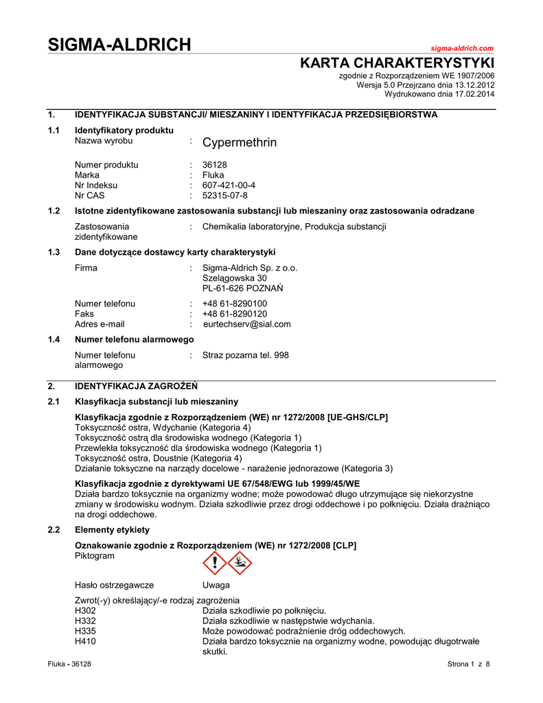 SIGMA-ALDRICH sigma-aldrich.com KARTA CHARAKTERYSTYKI zgodnie z Rozporządzeniem WE 1907/2006 Wersja 5.0 Przejrzano dnia 13.12.2012 Wydrukowano dnia 17.02.2014 1. IDENTYFIKACJA SUBSTANCJI/ MIESZANINY I IDENTYFIKACJA PRZEDSIĘBIORSTWA 1.1 Identyfikatory produktu Nazwa wyrobu : Cypermethrin Numer produktu Marka Nr Indeksu Nr CAS : : : : 36128 Fluka 607-421-00-4 52315-07-8 1.2 Istotne zidentyfikowane zastosowania substancji lub mieszaniny oraz zastosowania odradzane Zastosowania zidentyfikowane 1.3 1.4 : Chemikalia laboratoryjne, Produkcja substancji Dane dotyczące dostawcy karty charakterystyki Firma : Sigma-Aldrich Sp. z o.o. Szelągowska 30 PL-61-626 POZNAŃ Numer telefonu Faks Adres e-mail : : : +48 61-8290100 +48 61-8290120 [email protected] Numer telefonu alarmowego Numer telefonu alarmowego : Straz pozarna tel. 998 2. IDENTYFIKACJA ZAGROŻEŃ 2.1 Klasyfikacja substancji lub mieszaniny Klasyfikacja zgodnie z Rozporządzeniem (WE) nr 1272/2008 [UE-GHS/CLP] Toksyczność ostra, Wdychanie (Kategoria 4) Toksyczność ostrą dla środowiska wodnego (Kategoria 1) Przewlekła toksyczność dla środowiska wodnego (Kategoria 1) Toksyczność ostra, Doustnie (Kategoria 4) Działanie toksyczne na narządy docelowe - narażenie jednorazowe (Kategoria 3) Klasyfikacja zgodnie z dyrektywami UE 67/548/EWG lub 1999/45/WE Działa bardzo toksycznie na organizmy wodne; może powodować długo utrzymujące się niekorzystne zmiany w środowisku wodnym. Działa szkodliwie przez drogi oddechowe i po połknięciu. Działa drażniąco na drogi oddechowe. 2.2 Elementy etykiety Oznakowanie zgodnie z Rozporządzeniem (WE) nr 1272/2008 [CLP] Piktogram Hasło ostrzegawcze Uwaga Zwrot(-y) określający/-e rodzaj zagrożenia H302 Działa szkodliwie po połknięciu. H332 Działa szkodliwie w następstwie wdychania. H335 Może powodować podrażnienie dróg oddechowych. H410 Działa bardzo toksycznie na organizmy wodne, powodując długotrwałe skutki. Fluka - 36128 Strona 1 z 8 Zwrot(-y) określający/-e środki ostrożności P261 Unikać wdychania pyłu/ dymu/ gazu/ mgły/ par/ rozpylonej cieczy. P273 Unikać uwolnienia do środowiska. P501 Zawartość/ pojemnik usuwać do autoryzowanego zakładu utylizacji odpadów. Uzupełniające zwroty wskazujące rodzaj zagrożenia żaden Zgodnie z Dyrektywą 67/548/EWG i poprawkami. Piktogram(-y) Zwrot(y) R R20/22 R37 R50/53 Działa szkodliwie przez drogi oddechowe i po połknięciu. Działa drażniąco na drogi oddechowe. Działa bardzo toksycznie na organizmy wodne; może powodować długo utrzymujące się niekorzystne zmiany w środowisku wodnym. Zwrot(y) S S24 S36/37/39 Unikać zanieczyszczenia skóry. Nosić odpowiednią odzież ochronną, odpowiednie rękawice ochronne i okulary lub ochronę twarzy. Produkt i opakowanie usuwać jako odpad niebezpieczny. Unikać zrzutów do środowiska. Postępować zgodnie z instrukcją lub kartą charakterystyki. S60 S61 2.3 Inne zagrożenia - żaden 3. SKŁAD/ INFORMACJA O SKŁADNIKACH 3.1 Substancje Synonimy : Alphamethrine Wzór chemiczny Masa cząsteczkowa : : C22H19Cl2NO3 416,3 g/mol Składniki Cypermethrin Nr CAS Nr WE Nr Indeksu Stężenie 52315-07-8 257-842-9 607-421-00-4 4. ŚRODKI PIERWSZEJ POMOCY 4.1 Opis środków pierwszej pomocy - Porady ogólne Zasięgnąć porady medycznej. Przedstawić lekarzowi dołączoną Kartę Charakterystyki Substancji Niebezpiecznej. W przypadku wdychania Jeżeli osoba poszkodowana oddycha, przenieść na świeże powietrze. Jeżeli osoba poszkodowana nie oddycha, zastosować sztuczne oddychanie. Zasięgnąć porady medycznej. W przypadku kontaktu ze skórą Zmyć mydłem i dużą ilością wody. Zabrać poszkodowanego niezwłocznie do szpitala. Zasięgnąć porady medycznej. W przypadku kontaktu z oczami Zapobiegawczo przemyć oczy wodą. Fluka - 36128 Strona 2 z 8 W przypadku połknięcia Nieprzytomnej osobie nigdy nie podawać nic doustnie. Wypłukać usta wodą. Zasięgnąć porady medycznej. 4.2 Najważniejsze ostre i opóźnione objawy oraz skutki narażenia Narażenie może spowodować zdrętwienie, cierpnięcie i osłabienie kończyn., Mdłości, Zawroty głowy, Ból głowy, Depresja centralnego systemu nerwowego, Zgodnie z naszą najlepszą wiedzą, właściwości chemiczne, fizyczne i toksykologiczne nie zostały dokładnie zbadane. 4.3 Wskazania dotyczące wszelkiej natychmiastowej pomocy lekarskiej i szczególnego postępowania z poszkodowanym brak dostępnych danych 5. POSTĘPOWANIE W PRZYPADKU POŻARU 5.1 Środki gaśnicze Odpowiednie środki gaśnicze Stosować zraszanie wodą, piany alkoholoodporne, suche chemikalia lub dwutlenek węgla. 5.2 Szczególne zagrożenia związane z substancją lub mieszaniną Tlenki węgla, tlenki azotu (NOx), Chlorowodór gazowy 5.3 Informacje dla straży pożarnej W razie konieczności w trakcie akcji gaśniczej założyć aparat oddechowy z zamkniętym obiegiem. 5.4 Dalsze informacje brak dostępnych danych 6. POSTĘPOWANIE W PRZYPADKU NIEZAMIERZONEGO UWOLNIENIA DO ŚRODOWISKA 6.1 Indywidualne środki ostrożności, wyposażenie ochronne i procedury w sytuacjach awaryjnych Stosować ochronę układu oddechowego. Unikać wdychania par/mgły/gazu. Zapewnić wystarczającą wentylację. Ewakuować załogę w bezpieczne miejsce. 6.2 Środki ostrożności w zakresie ochrony środowiska Zapobiegać dalszemu wyciekowi lub rozlaniu jeżeli to bezpieczne. Nie dopuścić do przedostania się do kanalizacji. Trzeba zapobiegać przedostaniu się do środowiska. 6.3 Metody i materiały zapobiegające rozprzestrzenianiu się skażenia i służące do usuwania skażenia Wchłonąć w obojętny materiał sorpcyjny i unieszkodliwić jako niebezpieczny odpad. Przechować w odpowiednich, zamkniętych pojemnikach do czasu usunięcia. 6.4 Odniesienia do innych sekcji Usuwanie - patrz Sekcja 13. 7. POSTĘPOWANIE Z SUBSTANCJAMI I MIESZANINAMI ORAZ ICH MAGAZYNOWANIE 7.1 Środki ostrożności dotyczące bezpiecznego postępowania Unikać zanieczyszczenia skóry i oczu. U
