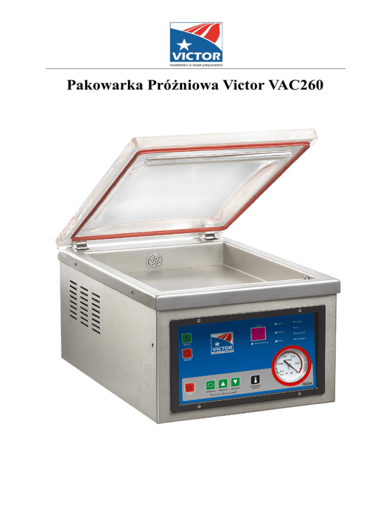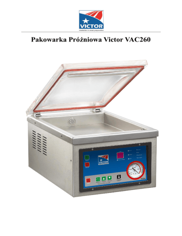 Pakowarka Próżniowa Victor VAC260 WAŻNE: ZACHOWAJ SKRZYNIĘ W RAZIE KONIECZNOŚCI TRANSPORTU MASZYNY! POTENCJALNE REKLAMACJE BĘDĄ UWZGLĘDNIANE JEDYNIE PRZY TRANSPORCIE MASZYNY W SKRZYNI. POSTĘPOWANIE PRZED INSTALACJĄ 1. 2. 3. Wyjmij pakowarkę z drewnianej skrzyni odkręcając górną i jedną z bocznych ścianek. Wyjmij z komory pakowarki materiały eksploatacyjne. Wlej olej do dozownika oleju. Odkręć tylną płytkę maszyny, dokręć śrubę ‘14’ znajdującą się pod pompą, odkręć zupełnie śrubę na środku pompy i uzupełnij olej z dozownika do wymaganego poziomu (jeśli poziom oleju jest niższy niż 1/3 poziomu). Rysunki poniżej przedstawiają te kroki. 4. Jeśli maszyna była wcześniej w zimnym pomieszczeniu (poniżej 5ºC) pozostaw ją na ok. godzinę bez rozruchu. Podłącz kabel do instalacji. Ustaw włącznik (z tyłu maszyny) w pozycję ON (włączone). 5. 6. INSTALACJA Przed uruchomieniem, proszę przeczytać instrukcję obsługi dotyczącą zasady działania oraz środków bezpieczeństwa. 8. Upewnij się, że poziom oleju musi być między 1/3 a ½ wysokości okienka). Gdy maszyna pracuje, olej nie powinien być niżej niż 1/3 wysokości okienka. Nie napełniać przesadnie, gdyż grozi to przelaniem oleju i zanieczyszczeniem filtru lub uszkodzeniem pompy. 9. Maszynę należy ustawić w pozycji poziomej w dobrze wentylowanym i jasnym pomieszczeniu bez dostępu toksycznych gazów lub mocnego pylenia. 10. Upewnij się, czy maszyna ma uziemienie. 11. Zawsze sprawdź czy górna pokrywa jest otwarta przed włączeniem urządzenia. 7. Materiały eksploatacyjne 1. 2. Olej – olej do pompy próżniowej należy wymienić co najmniej raz na 6 miesięcy. Rekomendujemy olej Victor Vacuum Oil dostępny u producenta bądź dystrybutora. Pasek Teflonowy – Należy wymienić w momencie przypalenia. Niezastosowanie się grozi uszkodzeniem listwy zgrzewającej. Paski teflonowe do nabycia u producenta lub dystrybutora. URUCHAMIANIE 1. 2. 3. 4. 5. 6. Włącz maszynę - zaświeci się dioda oznaczona PROCES W TRAKCIE (trwa to od kilkunastu sekund do kilku minut). Niemożliwe jest w tym czasie zmiana w ustawieniach maszyny. Naciśnij przycisk USTAWIENIA, po czym zaświeci się dioda sygnalizująca ustawienie poziomu próżni. Ustaw żądaną wartość naciskając przyciski ZWIĘKSZYĆ i ZMNIEJSZYĆ. Zakres czasowy to 0-99 sekund. Naciśnij przycisk USTAWIENIA, po czym zaświeci się dioda sygnalizująca ustawienie poziomu zgrzewaniu woreczków. Ustaw żądaną wartość naciskając przyciski ZWIĘKSZYĆ i ZMNIEJSZYĆ. Zakres czasowy to 0-3,5 sekund. Optymalny czas zgrzewanie to ok. 1,2 sekundy. Naciśnij przycisk USTAWIENIA, po czym zaświeci się dioda sygnalizująca ustawienie poziomu chłodzenia. Ustaw żądaną wartość naciskając przyciski ZWIĘKSZYĆ i ZMNIEJSZYĆ. Zakres czasowy to 0-9,9 sekund. UWAGA: czas schładzania nie powinien być krótszy niż czas zgrzewania. Optymalny to 2 sekundy. Naciśnij przycisk USTAWIENA, po czym zgaśnie poprzednia dioda, na wyświetlaczu pojawi się napis ED lub --. Naciśnij przycisk TEMPERATURA ZGRZEWU aby ustawić siłę z jaką maszyna ma zgrzać woreczek próżniowy (mocno/średnio/słabo). UWAGA: optymalnie należy używać średnio/słabo. UWAGA: aby proces się rozpoczął należy zamknąć pokrywę i przyciskiem USTAWIENIA sprawić aby pojawił się napis ED lub --. POMOCNA UWAGA: aby szybciej wytworzyć stan próżni w przypadku użycia małego woreczka, połóż blok wypełniający do wewnątrz komory, aby wypełnić niewykorzystane miejsce i tym samym skrócić czas procesu. Skontaktuj się ze swoim dystrybutorem aby zakupić blok wypełniający. UWAGA: nie wolno blokować otworu przepływu powietrza w komorze. INSTRUKCJA DZIAŁANIA PROCESU PAKOWANIA PRÓŻNIOWEGO Włącz zasilanie i przygotuj woreczek do pakowania próżniowego. Ustaw parametry procesu oraz temperaturę (punkty 8-12 części INSTALACJA). Umieść woreczek próżniowy wraz z zawartością w komorze kładąc otwarcie na listwie zgrzewającej. Zatrzaśnij woreczek metalową klamrą. Upewnij się czy cała długość woreczka jest na listwie zgrzewającej i że folia nie jest zagięta na zgrzewie. 4. Zamknij akrylową pokrywę, proces rozpocznie się automatycznie. Opcjonalne jest zabezpieczenie pokrywy dodatkową klamrą blokującą. 5. Podczas działania komora wytworzy podciśnienie, które nie dopuści do samoistnego otwarciapokrywy. Wszystkie procesy odbywają się w stanie próżni, wyświetlacz oraz zegar pokazują aktualny proces (czas pozostały do końca wytworzenia pełnej próżni, potem czas zgrzewania, następnie czas chłodzenia). 6. Po zakończeniu cyklu, powietrze jest przywracane do komory, pokrywa otwiera się automatycznie. Pokrywa nie otworzy się samoistnie jeśli użyta została klamra blokująca. Należy wówczas odblokować klamrę. 7. W nagłym przypadku naciśnij przycisk STOP aby zatrzymać proces pakowania próżniowego. Komora napełni się powietrzem kończąc proces, pokrywa otworzy się po zakończeniu procesu . 1. 2. 3. UWAGA 1. 2. 3. 4. 5. 6. 7. 8. Należy czyścić komorę maszyny po użyciu, szczególnie okolice listwy zgrzewającej, gdyż gromadzące się tam zabrudzenia mogą powodować nieprawidłowe działanie maszyny, w konsekwencji także uszkodzenie, co nie będzie traktowane gwarancyjnie. Nie należy uruchamiać maszyny bez woreczka próżniowego w środku. Jeśli to nastąpi, element grzewczy szybciej się zużyje. Wyłącz maszynę i wyjmij kabel zasilający podczas gdy maszyna jest dłuższy czas nieużytkowana. Wskaźnik próżni może wskazywać inne wartości w różnych warunkach. Na dużej wysokości nad poziomem morza wskazania licznika są niższe. Nie należy używać woreczków próżniowych, które wydzielają trujące opary podczas zgrzewania – stosuj worki dedykowane Victor VacuumBags. Maszyna musi być transportowana poziomo. Transport musi odbywać się zgodnie z instrukcjami zawartymi na o