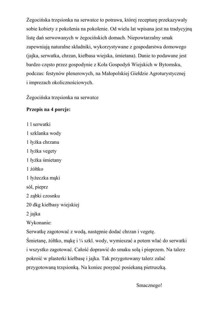 Żegocińska trzęsionka na serwatce to potrawa, której recepturę przekazywały sobie kobiety z pokolenia na pokolenie. Od wielu lat wpisana jest na tradycyjną listę dań serwowanych w żegocińskich domach. Niepowtarzalny smak zapewniają naturalne składniki, wykorzystywane z gospodarstwa domowego (jajka, serwatka, chrzan, kiełbasa wiejska, śmietana). Danie to podawane jest bardzo często przez gospodynie z Koła Gospodyń Wiejskich w Bytomsku, podczas: festynów plenerowych, na Małopolskiej Giełdzie Agroturystycznej i imprezach okolicznościowych. Żegocińska trzęsionka na serwatce Przepis na 4 porcje: 1 l serwatki 1 szklanka wody 1 łyżka chrzanu 1 łyżka vegety 1 łyżka śmietany 1 żółtko 1 łyżeczka mąki sól, pieprz 2 ząbki czosnku 20 dkg kiełbasy wiejskiej 2 jajka Wykonanie: Serwatkę zagotować z wodą, następnie dodać chrzan i vegetę. Śmietanę, żółtko, mąkę i ¼ szkl. wody, wymieszać a potem wlać do serwatki i wszystko zagotować. Całość doprawić do smaku solą i pieprzem. Na talerz pokroić w plasterki kiełbasę i jajka. Tak przygotowany talerz zalać przygotowaną trzęsionką. Na koniec posypać posiekaną pietruszką. Smacznego!