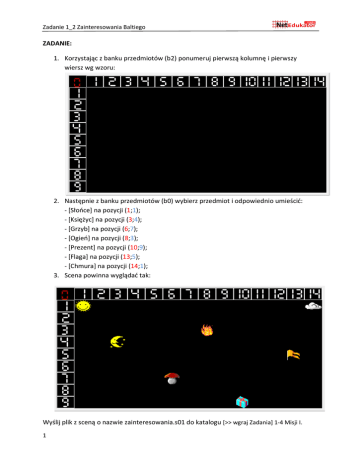 Zadanie 1_2 Zainteresowania Baltiego ZADANIE: 1. Korzystając z banku przedmiotów (b2) ponumeruj pierwszą kolumnę i pierwszy wiersz wg wzoru: 2. Następnie z banku przedmiotów (b0) wybierz przedmiot i odpowiednio umieścić: - [Słońce] na pozycji (1;1); - [Księżyc] na pozycji (3;4); - [Grzyb] na pozycji (6;7); - [Ogień] na pozycji (8;3); - [Prezent] na pozycji (10;9); - [Flaga] na pozycji (13;5); - [Chmura] na pozycji (14;1); 3. Scena powinna wyglądać tak: Wyślij plik z sceną o nazwie zainteresowania.s01 do katalogu [>> wgraj Zadania] 1-4 Misji I. 1 Zadanie 1_2 Zainteresowania Baltiego POMOC: 1. Każdy przedmiot na scenie ma swoją pozycję. Określają ją 2 numery pochodzące z numeracji kolumny i wiersza. Numer kolumny (oś X) Numer wiersza (oś Y) 2. I tak przedmiot [Słońce] ma pozycję (2;4) – najpierw nr kolumny; potem n-r wiersza. 3. Pamiętaj, że liczymy od „0 – zera”, więc przedmiot 14 w wierszu numerującym jest 15-tym w kolejności. Wszystkich pól na ekranie sceny jest więc 15x10 = 150. Tyle przedmiotów możesz na niej ustawić. 2