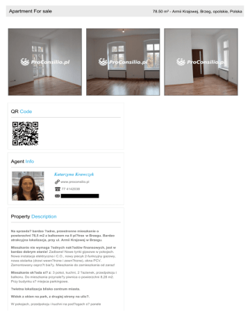 Apartment For sale 78.50 m² - Armii Krajowej, Brzeg, opolskie, Polska QR Code Agent Info Katarzyna Krawczyk www.proconsilio.pl 77 4142038 Property Description Na sprzeda? bardzo ?adne, przestronne mieszkanie o powierzchni 78,5 m2 z balkonem na II pi?trze w Brzegu. Bardzo atrakcyjna lokalizacja, przy ul. Armii Krajowej w Brzegu. Mieszkanie nie wymaga ?adnych nak?adów finansowych, jest w bardzo dobrym stanie! Zadbane! Nowe tynki gipsowe w pokojach. Nowa instalacja elektryczna i C.O., nowy piecyk 2-funkcyjny gazowy, nowa stolarka (drzwi wewn?trzne i zewn?trzne), okna PCV. Zamontowany osprz?t bia?y. Mieszkanie do zamieszkania od zaraz! Mieszkanie sk?ada si? z: 3 pokoi, kuchni, 2 ?azienek, przedpokoju i balkonu. Do mieszkania przynale?y piwnica o powierzchni 8,28 m2. Przy budynku s? miejsca parkingowe. ?wietna lokalizacja blisko centrum miasta. Widok z okien na park, z drugiej strony na ulic?. W pokojach, przedpokoju i kuchni na pod?ogach s? panele pod?ogowe, w ?azience s? kafelki. Wysokie sufity (3,20 m) co daje du?e mo?liwo?ci aran?acyjne. Niski czynsz (ok. 230 z?)! Mieszkanie zarz?dzane przez wspólnot? mieszkaniow?! Media: woda, kanalizacja, pr?d, gaz (piecyk 2-funkcyjny + wyprowadzenie pod kuchenk?). Mieszkanie na sprzeda? w stanie widocznym na zdj?ciach, bez umeblowania. Features Heating system Balcony Basement View Roof Deck Storage room Otoczenie: Park, w bliskiej odleg?o?ci szko?y podstawowe i ?rednie, przedszkola, place zabaw, sklepy, restauracje, punkty us?ugowe i handlowe, 5 minut spacerem do rynku! Parking Address Map Polecamy i zapraszamy do kontaktu! Tel. 77 414 20 38. Je?li potrzebujesz kredytu na zakup nieruchomo?ci umów si? z naszym doradc? kredytowym, który bezp?atnie zweryfikuje Twoj? zdolno?? kredytow?. Uwaga: Informacje dotycz?ce opisu nieruchomo?ci podane s? przez w?a?ciciela, maj? charakter wy??cznie informacyjny i mog? podlega? aktualizacji. Oferta dotycz?ca nieruchomo?ci stanowi zaproszenie do rokowa? zgodnie z art. 71 Kodeksu Cywilnego i nie stanowi oferty okre?lonej w art. 66 i nast?pnych KC. Basic Details Property type : Apartment Offer Type : For sale Offer ID : 1108 Price : 220,000 PLN View : Park Bedrooms : 2 Rooms : 3 Bathrooms : 2 Usable area : 78.50 m² Total area : 78.50 m² Country : Polska Province : opolskie Town : Brzeg Street : Armii Krajowej Floor : 2 Neighborhood Shopping center 10 Minutes City center 5 Minutes Hospital 20 Minutes Police station 2 Minutes Train station 10 Minutes Bus stop 5 Minutes Airport 40 Minutes Coffee shop 5 Minutes Cinema 5 Minutes Park 1 Minutes School 3 Minutes Sightseeing 5 Minutes Exhibitions 5 Minutes
