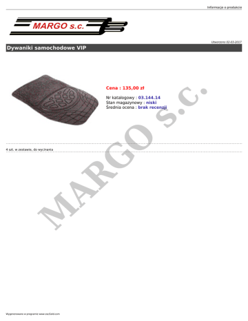 Informacje o produkcie Utworzono 02-03-2017 Cena : 135,00 zł M AR G 4 szt. w zestawie, do wycinania O s. c Nr katalogowy : 03.144.14 Stan magazynowy : niski Średnia ocena : brak recenzji . Dywaniki samochodowe VIP Wygenerowano w programie www.oscGold.com
