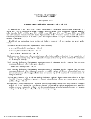 UCHWAŁA NR XIV/100/2015 RADY GMINY TERESIN z dnia 1 grudnia 2015 r. w sprawie podatku od środków transportowych na rok 2016 Na podstawie art. 18 ust. 2 pkt 8 ustawy z dnia 8 marca 1990 r. o samorządzie gminnym (tekst jednolity Dz.U. z 2015 r. poz. 1515), w związku z art. 10 ust. l ustawy z dnia 12 stycznia 1991 r. o podatkach i opłatach lokalnych (tekst jednolity Dz.U. z 2014 r. poz. 849, z 2015 r. poz. 528, poz. 699, poz. 774, poz. 1045, poz. 1283) oraz Obwieszczenia Ministra Finansów z dnia 7 października 2015 r. w sprawie stawek podatku od środków transportowych obowiązujących w 2016 roku (MP z dnia 22 października 2015 r. poz. 1029) Rada Gminy Teresin uchwala, co następuje: § 1. Określa się następujące stawki podatku od środków transportowych obowiązujące na terenie gminy Teresin: 1) od samochodów ciężarowych o dopuszczalnej masie całkowitej: a) powyżej 3,5 ton do 5,5 ton włącznie - 100,- zł b) powyżej 5,5 ton do 9 ton włącznie - 100,- zł c) powyżej 9 ton i poniżej 12 ton - 100,- zł 2) od samochodu ciężarowego o dopuszczalnej masie całkowitej równej lub wyższej niż 12 ton w zależności od liczby osi, dopuszczalnej masy całkowitej pojazdu i rodzaju zawieszenia wg stawek określonych w załączniku nr l do niniejszej uchwały; 3) od ciągnika siodłowego i balastowego przystosowanego do używania łącznie z naczepą lub przyczepą o dopuszczalnej masie całkowitej zespołu pojazdów: - od 3,5 tony i poniżej 12 ton - 100,-zł. 4) od ciągnika siodłowego i balastowego przystosowanego do używania łącznie z naczepą lub przyczepą o dopuszczalnej masie całkowitej zespołu pojazdów równej lub wyższej niż 12 ton w zależności od liczby osi, dopuszczalnej masy całkowitej pojazdu i rodzaju zawieszenia wg stawek określonych w załączniku nr 2 do niniejszej uchwały; 5) od przyczep i naczep, które łącznie z pojazdem silnikowym posiadają dopuszczalną masę całkowitą od 7 ton i poniżej 12 ton, z wyjątkiem związanych wyłącznie z działalnością rolniczą prowadzoną przez podatnika podatku rolnego - 100,- zł 6) od przyczep i naczep, które łącznie z pojazdem silnikowym posiadają dopuszczalną masę całkowitą równą lub wyższą niż 12 ton, z wyjątkiem związanych wyłącznie z działalnością rolniczą prowadzoną przez podatnika podatku rolnego, w zależności od liczby osi, dopuszczalnej masy całkowitej pojazdu i rodzaju zawieszenia, według stawek określonych w załączniku nr 3 do niniejszej uchwały; Id: 4D273D0D-0280-432B-86CF-49E25C004B47. Podpisany Strona 1 7) od autobusów, w zależności od liczby miejsc do siedzenia poza miejscem kierowcy: a) mniejszej niż 22 miejsca - 200,- zł b) równej lub większej niż 22 miejsca - 200,- zł § 2. Wykonanie uchwały powierza się Wójtowi Gminy Teresin. § 3. Uchwała podlega ogłoszeniu w Dzienniku Urzędowym Województwa Mazowieckiego i wchodzi w życie z dniem 1 stycznia 2016 r. Przewodniczący Rady Gminy Bogdan Linard Id: 4D273D0D-0280-432B-86CF-49E25C004B47. Podpisany Strona 2 Załącznik Nr 1 do Uchwały Nr XIV/100/2015 Rady Gminy Teresin z dnia 1 grudnia 2015 r. Stawki podatku dla pojazdów określonych w § 1 pkt 2 uchwały Liczba osi i dopuszczalna masa całkowita (w tonach) nie mniej niż mniej niż 1 2 12 13 14 15 13 14 15 12 17 19 21 23 25 17 19 21 23 25 12 25 27 29 31 25 27 29 31 Stawka podatku (w złotych) oś jezdna (osie jezdne) z zawieszeniem pneumatycznym lub zawieszeniem uznanym za równoważne 3 dwie osie 1,00 139,00 384,00 541,00 trzy osie 139,00 242,00 496,00 644,00 992,00 992,00 cztery osie i więcej 644,00 653,00 1019,00 1618,00 1618,00 inne systemy zawieszenia osi jezdnych 4 139,00 384,00 541,00 1225,00 242,00 496,00 644,00 992,00 1542,00 1542,00 653,00 1019,00 1618,00 2399,00 2399,00 Przewodniczący Rady Gminy Bogdan Linard Id: 4D273D0D-0280-432B-86CF-49E25C004B47. Podpisany Strona 1 Załącznik Nr 2 do Uchwały Nr XIV/100/2015 Rady Gminy Teresin z dnia 1 grudnia 2015 r. Stawki podatku dla pojazdów określonych w § 1 pkt 4 uchwały Liczba osi i dopuszczalna masa całkowita zespołu pojazdów: ciągnik siodłowy + naczepa, ciągnik balastowy + przyczepa (w tonach) nie mniej niż 1 12 18 25 31 12 40 Stawka podatku (w złotych) oś jezdna (osie jezdne) z zawieszeniem mniej niż pneumatycznym lub zawieszeniem uznanym za równoważne 2 3 dwie osie 18 1,00 25 260,00 31 548,00 1382,00 trzy osie i więcej 40 1219,00 1685,00 inne systemy zawieszenia osi jezdnych 4 38,00 470,00 899,00 1895,00 1685,00 2493,00 Przewodniczący Rady Gminy Bogdan Linard Id: 4D273D0D-0280-432B-86CF-49E25C004B47. Podpisany Strona 1 Załącznik Nr 3 do Uchwały Nr XIV/100/2015 Rady Gminy Teresin z dnia 1 grudnia 2015 r. Stawki podatku dla przyczep i naczep określonych w § 1 pkt 6 uchwały Liczba osi i dopuszczalna masa całkowita zespołu pojazdów: naczepa/przyczepa + pojazd silnikowy (w tonach) nie mniej niż 1 12 18 25 12 28 33 38 12 38 Stawka podatku (w złotych) oś jezdna (osie jezdne) z zawieszeniem mniej niż pneumatycznym lub zawieszeniem uznanym za równoważne 2 3 jedna oś 18 1,00 25 174,00 313,00 dwie osie 28 206,00 33 600,00 38 832,00 1124,00 trzy osie i więcej 38 662,00 922,00 inne systemy zawieszenia osi jezdnych 4 25,00 313,00 549,00 303,00 832,00 1263,00 1663,00 922,00 1253,00 Przewodniczący Rady Gminy Bogdan Linard Id: 4D273D0D-0280-432B-86CF-49E25C004B47. Podpisany Strona 1