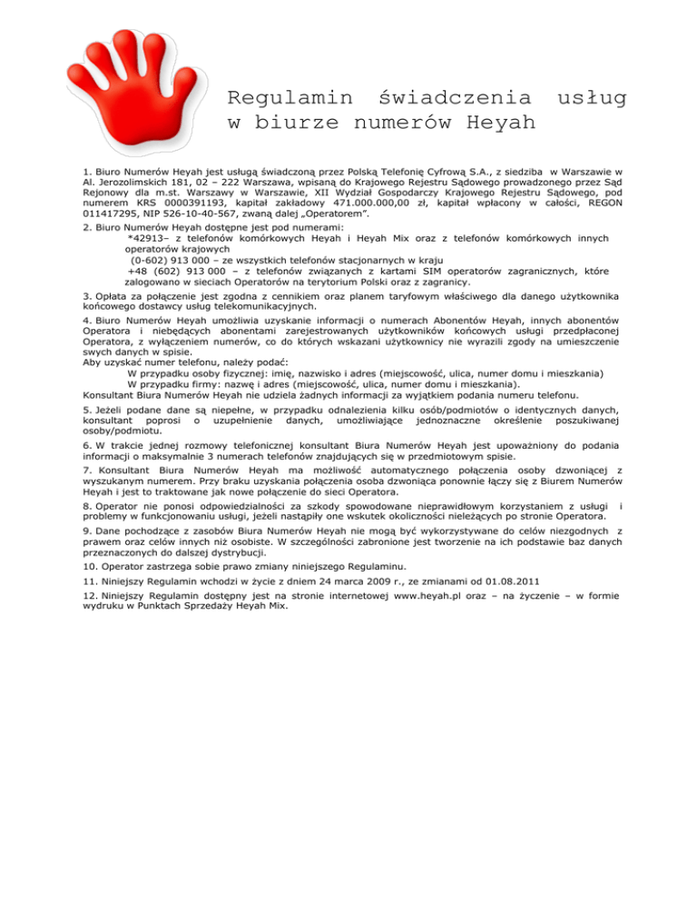 Regulamin świadczenia usług w biurze numerów Heyah 1. Biuro Numerów Heyah jest usługą świadczoną przez Polską Telefonię Cyfrową S.A., z siedziba w Warszawie w Al. Jerozolimskich 181, 02 – 222 Warszawa, wpisaną do Krajowego Rejestru Sądowego prowadzonego przez Sąd Rejonowy dla m.st. Warszawy w Warszawie, XII Wydział Gospodarczy Krajowego Rejestru Sądowego, pod numerem KRS 0000391193, kapitał zakładowy 471.000.000,00 zł, kapitał wpłacony w całości, REGON 011417295, NIP 526-10-40-567, zwaną dalej „Operatorem”. 2. Biuro Numerów Heyah dostępne jest pod numerami: *42913– z telefonów komórkowych Heyah i Heyah Mix oraz z telefonów komórkowych innych operatorów krajowych (0-602) 913 000 – ze wszystkich telefonów stacjonarnych w kraju +48 (602) 913 000 – z telefonów związanych z kartami SIM operatorów zagranicznych, które zalogowano w sieciach Operatorów na terytorium Polski oraz z zagranicy. 3. Opłata za połączenie jest zgodna z cennikiem oraz planem taryfowym właściwego dla danego użytkownika końcowego dostawcy usług telekomunikacyjnych. 4. Biuro Numerów Heyah umożliwia uzyskanie informacji o numerach Abonentów Heyah, innych abonentów Operatora i niebędących abonentami zarejestrowanych użytkowników końcowych usługi przedpłaconej Operatora, z wyłączeniem numerów, co do których wskazani użytkownicy nie wyrazili zgody na umieszczenie swych danych w spisie. Aby uzyskać numer telefonu, należy podać: W przypadku osoby fizycznej: imię, nazwisko i adres (miejscowość, ulica, numer domu i mieszkania) W przypadku firmy: nazwę i adres (miejscowość, ulica, numer domu i mieszkania). Konsultant Biura Numerów Heyah nie udziela żadnych informacji za wyjątkiem podania numeru telefonu. 5. Jeżeli podane dane są niepełne, w przypadku odnalezienia kilku osób/podmiotów o identycznych danych, konsultant poprosi o uzupełnienie danych, umożliwiające jednoznaczne określenie poszukiwanej osoby/podmiotu. 6. W trakcie jednej rozmowy telefonicznej konsultant Biura Numerów Heyah jest upoważniony do podania informacji o maksymalnie 3 numerach telefonów znajdujących się w przedmiotowym spisie. 7. Konsultant Biura Numerów Heyah ma możliwość automatycznego połączenia osoby dzwoniącej z wyszukanym numerem. Przy braku uzyskania połączenia osoba dzwoniąca ponownie łączy się z Biurem Numerów Heyah i jest to traktowane jak nowe połączenie do sieci Operatora. 8. Operator nie ponosi odpowiedzialności za szkody spowodowane nieprawidłowym korzystaniem z usługi problemy w funkcjonowaniu usługi, jeżeli nastąpiły one wskutek okoliczności nieleżących po stronie Operatora. i 9. Dane pochodzące z zasobów Biura Numerów Heyah nie mogą być wykorzystywane do celów niezgodnych z prawem oraz celów innych niż osobiste. W szczególności zabronione jest tworzenie na ich podstawie baz danych przeznaczonych do dalszej dystrybucji. 10. Operator zastrzega sobie prawo zmiany niniejszego Regulaminu. 11. Niniejszy Regulamin wchodzi w życie z dniem 24 marca 2009 r., ze zmianami od 01.08.2011 12. Niniejszy Regulamin dostępny jest na stronie internetowej www.heyah.pl oraz – na życzenie – w formie wydruku w Punktach Sprzedaży Heyah Mix.