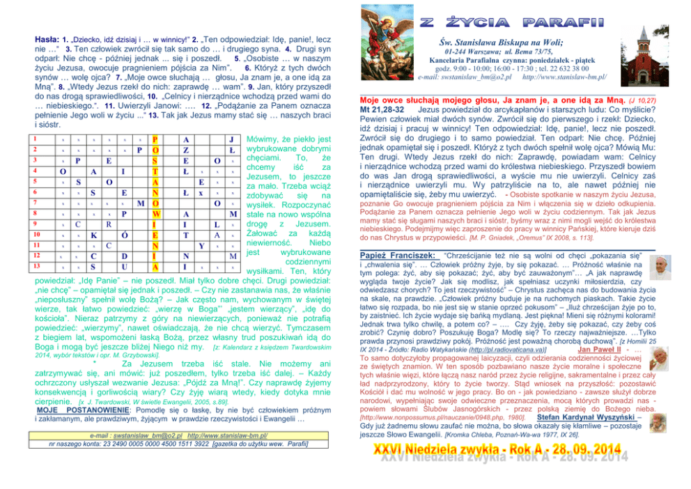 Hasła: 1. „Dziecko, idź dzisiaj i … w winnicy!” 2. „Ten odpowiedział: Idę, panie!, lecz nie …” 3. Ten człowiek zwrócił się tak samo do … i drugiego syna. 4. Drugi syn odparł: Nie chcę - później jednak ... się i poszedł. 5. „Osobiste … w naszym życiu Jezusa, owocuje pragnieniem pójścia za Nim”. 6. Któryż z tych dwóch synów … wolę ojca? 7. „Moje owce słuchają … głosu, Ja znam je, a one idą za Mną”. 8. „Wtedy Jezus rzekł do nich: zaprawdę … wam”. 9. Jan, który przyszedł do nas drogą sprawiedliwości, 10. „Celnicy i nierządnice wchodzą przed wami do … niebieskiego.”. 11. Uwierzyli Janowi: …. 12. „Podążanie za Panem oznacza pełnienie Jego woli w życiu ...” 13. Tak jak Jezus mamy stać się … naszych braci i sióstr. Mówimy, że piekło jest wybrukowane dobrymi chęciami. To, że 3 x P E O x chcemy iść za 4 x x x O A I Jezusem, to jeszcze 5 x x x S O E za mało. Trzeba wciąż 6 x x x x S E Ł x zdobywać się na 7 x x x x x O x wysiłek. Rozpoczynać 8 x x x x P A M stale na nowo wspólna 9 x drogę z Jezusem. C R I L x Żałować za każdą 10 x x A x K Ó T niewierność. Niebo 11 x x x x C Y x jest wybrukowane 12 x x M C D N codziennymi 13 x x x x x S U I wysiłkami. Ten, który powiedział: „Idę Panie” – nie poszedł. Miał tylko dobre chęci. Drugi powiedział: „nie chcę” – opamiętał się jednak i poszedł. – Czy nie zastanawia nas, że właśnie „nieposłuszny” spełnił wolę Bożą? – Jak często nam, wychowanym w świętej wierze, tak łatwo powiedzieć: „wierzę w Boga”’ „jestem wierzący”, „idę do kościoła”. Nieraz patrzymy z góry na niewierzących, ponieważ nie potrafią powiedzieć: „wierzymy”, nawet oświadczają, że nie chcą wierzyć. Tymczasem z biegiem lat, wspomożeni łaską Bożą, przez własny trud poszukiwań idą do Boga i mogą być jeszcze bliżej Niego niż my. [z: Kalendarz z księdzem Twardowskim 1 x x x x x 2 x x x x x P O S T A N M O W I E N I A x P A Z E Ł J Ł 2014, wybór tekstów i opr. M. Grzybowski]. * Za Jezusem trzeba iść stale. Nie możemy ani zatrzymywać się, ani mówić: już poszedłem, tylko trzeba iść dalej. – Każdy ochrzczony usłyszał wezwanie Jezusa: „Pójdź za Mną!”. Czy naprawdę żyjemy konsekwencją i gorliwością wiary? Czy żyję wiarą wtedy, kiedy dotyka mnie cierpienie. [x J. Twardowski, W świetle Ewangelii, 2005, s.89]. MOJE POSTANOWIENIE: Pomodlę się o łaskę, by nie być człowiekiem próżnym i zakłamanym, ale prawdziwym, żyjącym w prawdzie rzeczywistości i Ewangelii … e-mail : [email protected] http://www.stanislaw-bm.pl/ nr naszego konta: 23 2490 0005 0000 4500 1511 3922 [gazetka do użytku wew. Parafii] Św. Stanisława Biskupa na Woli; . 01-244 Warszawa; ul. Bema 73/75, Kancelaria Parafialna czynna: poniedziałek - piątek godz. 9:00 - 10:00; 16:00 - 17:30 ; tel. 22 632 38 00 e-mail: [email protected] http://www.stanislaw-bm.pl/ Moje owce słuchają mojego głosu, Ja znam je, a one idą za Mną. (J 10,27) Mt 21,28-32 Jezus powiedział do arcykapłanów i starszych ludu: Co myślicie? Pewien człowiek miał dwóch synów. Zwrócił się do pierwszego i rzekł: Dziecko, idź dzisiaj i pracuj w winnicy! Ten odpowiedział: Idę, panie!, lecz nie poszedł. Zwrócił się do drugiego i to samo powiedział. Ten odparł: Nie chcę. Później jednak opamiętał się i poszedł. Któryż z tych dwóch spełnił wolę ojca? Mówią Mu: Ten drugi. Wtedy Jezus rzekł do nich: Zaprawdę, powiadam wam: Celnicy i nierządnice wchodzą przed wami do królestwa niebieskiego. Przyszedł bowiem do was Jan drogą sprawiedliwości, a wyście mu nie uwierzyli. Celnicy zaś i nierządnice uwierzyli mu. Wy patrzyliście na to, ale nawet później nie opamiętaliście się, żeby mu uwierzyć. - Osobiste spotkanie w naszym życiu Jezusa, poznanie Go owocuje pragnieniem pójścia za Nim i włączenia się w dzieło odkupienia. Podążanie za Panem oznacza pełnienie Jego woli w życiu codziennym. Tak jak Jezus mamy stać się sługami naszych braci i sióstr, byśmy wraz z nimi mogli wejść do królestwa niebieskiego. Podejmijmy więc zaproszenie do pracy w winnicy Pańskiej, które kieruje dziś do nas Chrystus w przypowieści. [M. P. Gniadek, „Oremus” IX 2008, s. 113]. Papież Franciszek: “Chrześcijanie też nie są wolni od chęci „pokazania się” i „chwalenia się”. … Człowiek próżny żyje, by się pokazać. … Próżność właśnie na tym polega: żyć, aby się pokazać; żyć, aby być zauważonym”… „A jak naprawdę wygląda twoje życie? Jak się modlisz, jak spełniasz uczynki miłosierdzia, czy odwiedzasz chorych? To jest rzeczywistość” – Chrystus zachęca nas do budowania życia na skale, na prawdzie. „Człowiek próżny buduje je na ruchomych piaskach. Takie życie łatwo się rozpada, bo nie jest się w stanie oprzeć pokusom” – „Iluż chrześcijan żyje po to, by zaistnieć. Ich życie wydaje się bańką mydlaną. Jest piękna! Mieni się różnymi kolorami! Jednak trwa tylko chwilę, a potem co? – …. Czy żyję, żeby się pokazać, czy żeby coś zrobić? Czynię dobro? Poszukuję Boga? Modlę się? To rzeczy najważniejsze. …Tylko prawda przynosi prawdziwy pokój. Próżność jest poważną chorobą duchową”. [z Homilii 25 IX 2014 - Źródło: Radio Watykańskie (http://pl.radiovaticana.va)] Jan Paweł II - … To samo dotyczyłoby propagowanej laicyzacji, czyli odzierania codzienności życiowej ze świętych znamion. W ten sposób pozbawiano nasze życie moralne i społeczne tych właśnie więzi, które łączą nasz naród przez życie religijne, sakramentalne i przez cały ład nadprzyrodzony, który to życie tworzy. Stąd wniosek na przyszłość: pozostawić Kościół i dać mu wolność w jego pracy. Bo on - jak powiedziano - zawsze służył dobrze narodowi, wypełniając swoje odwieczne przeznaczenia, mocą kt