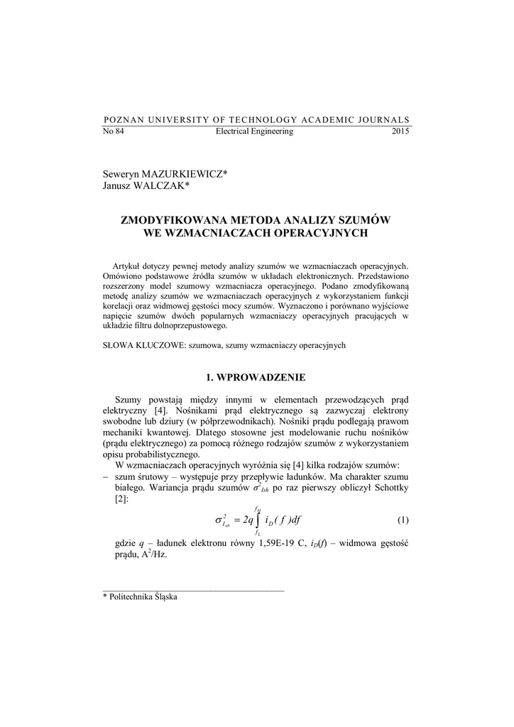 P O Z N A N UN I VE RS I T Y O F T E C HN O L O G Y ACA D E MI C J O URN A L S No 84 Electrical Engineering 2015 Seweryn MAZURKIEWICZ* Janusz WALCZAK* ZMODYFIKOWANA METODA ANALIZY SZUMÓW WE WZMACNIACZACH OPERACYJNYCH Artykuł dotyczy pewnej metody analizy szumów we wzmacniaczach operacyjnych. Omówiono podstawowe źródła szumów w układach elektronicznych. Przedstawiono rozszerzony model szumowy wzmacniacza operacyjnego. Podano zmodyfikowaną metodę analizy szumów we wzmacniaczach operacyjnych z wykorzystaniem funkcji korelacji oraz widmowej gęstości mocy szumów. Wyznaczono i porównano wyjściowe napięcie szumów dwóch popularnych wzmacniaczy operacyjnych pracujących w układzie filtru dolnoprzepustowego. SŁOWA KLUCZOWE: szumowa, szumy wzmacniaczy operacyjnych 1. WPROWADZENIE Szumy powstają między innymi w elementach przewodzących prąd elektryczny [4]. Nośnikami prąd elektrycznego są zazwyczaj elektrony swobodne lub dziury (w półprzewodnikach). Nośniki prądu podlegają prawom mechaniki kwantowej. Dlatego stosowne jest modelowanie ruchu nośników (prądu elektrycznego) za pomocą różnego rodzajów szumów z wykorzystaniem opisu probabilistycznego. W wzmacniaczach operacyjnych wyróżnia się [4] kilka rodzajów szumów: szum śrutowy – występuje przy przepływie ładunków. Ma charakter szumu białego. Wariancja prądu szumów σ2Ish po raz pierwszy obliczył Schottky [2]: fH 2 I ab 2q i D ( f )df (1) fL gdzie q – ładunek elektronu równy 1,59E-19 C, iD(f) – widmowa gęstość prądu, A2/Hz. __________________________________________ * Politechnika Śląska 122 Seweryn Mazurkiewicz, Janusz Walczak szum termiczny – w temperaturze powyżej zera absolutnego występują losowe ruchy nośników. Przyczyną tych ruchów jest energia cieplna elektronów. Im wyższa temperatura tym większa energia. Napięcie szumów termicznych ma charakter szumu białego i wariancję tego napięcia σ2UT wyraża wzór [2]: fH U2T 4 kTR df (2) fL gdzie k – stała Boltzmanna równa 1,38E-23 J/K, T – temperatura absolutna w stopniach Kelvina, natomiast R – rezystancja w Ω. Istotne jest to, że napięcie szumów na elemencie istnieje nawet bez podłączonego żadnego innego zewnętrznego źródła napięcia czy prądu. Wariancja napięcia szumów termicznych jest niezależna od ilości połączonych (szeregowo lub równolegle) rezystorów – jest zależna tylko od wypadkowej wartości rezystancji [4]. szum migotania – ma charakter szumu różowego zwanego szumem 1/f. Występuje w wszystkich układach aktywnych. Jest on najprawdopodobniej spowodowany niedoskonałością struktury krystalicznej półprzewodników. Intensywność tego szumu jest proporcjonalna do przepływającego prądu. Wariancję σ2Uf napięcia tego szumu określa wzór [2]: fH 2 Uf K 2 e fL 1 df f (3) gdzie Ke jest stałą układu. szum wybuchowy – spowodowany jest poprzez niedokładny proces wytwarzania półprzewodników. Szum ten ma postać krótkich impulsów w przypadkowych momentach czasu. Szumy te minimalizuje się poprzez odpowiednią czystość procesu wytwarzania. szum lawinowy – powstaje na złączu p-n spolaryzowanym zaporowo. Szumy te minimalizuje się poprzez unikanie stosowania złącz Zenera w syntezie struktur półprzewodnikowych. Na szumy wzmacniacza operacyjnego składa się wiele zależnych od siebie przyczyn. Dlatego w dokumentacji technicznej najczęściej podaje się wykres zależności napięcia (lub/i prądu) skutecznego szumu (odniesionego do wejścia) w funkcji częstotliwości. Na takim wykresie można wyróżnić dwa zakresy częstotliwości [4]: zakres małych częstotliwość, gdzie dominują szumy o charakterze szumu różowego, zakres większych częstotliwości, gdzie dominują szumy o charakterze szumu białego. Zmodyfikowana metoda analizy szumów we wzmacniaczach operacyjnych 123 Częstotliwość dla której wartość skuteczna szumu białego równa się wartości skutecznej szumu różowego nazywa się częstotliwością naroża fNC [5]. Z powyższego wynika, że szum całkowity wzmacniacza operacyjnego można modelować, za pomocą sumy dwóch źródeł szumu: źródła szumu białego i źródła szumu różowego. 2. MODEL SZUMOWY WZMACNIACZA OPERACYJNEGO W dokumentacjach podawane są wartości skuteczne napięć i prądów szumów odniesione do wejścia wzmacniacza operacyjnego [8, 9]. Szumy prądowe są modelowane przez źródła prądu włączane pomiędzy masę a każde z wejść wzmacniacza. Szumy napięciowe modelowane są przez źródło napięcia włączone szeregowo do wejścia nieodwracającego [2]. Analizowany w pracy model szumowy wzmacniacza operacyjnego pokazano na rysunku 1. Źródła prądu IPN oraz IPP modelują szum prądowy o charakterze szumu różowego. Źródła prądu IWN oraz IWP modelują szum prądowy o charakterze szumu białego. Źródło napięcia EP modeluje szum napięciowy o charakterze szumu różowego. Źródło napięcia EW modeluje szum napięciowy o charakterze szumu białego. Zakłada się, że wewnętrzny wzmacniacz operacyjny jest idealny, niegenerujący szumów i ma nieskończone wzmocnienie. Rys. 1. Model szumowy wzmacniacza operacyjnego Jeżeli impedancja podłączona do wejść wzmacniacza jest niewielka oraz wzmacniacz na wejściach ma tranzystory polowe to prądowe źródła szumów można pominąć [4]. 124 Seweryn Mazurkiewicz, Janusz Walczak 3. METODA ANALIZY SZUMÓW WE WZMACNIACZU OPERACYJNYM Proponowaną metodę analizy szumów pokazano na przykładzie filtru dolnoprzepustowego. Dla uproszczenia pominięto prądowe źródła szumów oraz szumy elementów biernych. Skupiono się na analizie szumów samego wzmacniacza operacyjnego. W podobny sposób można rozszerzyć analizę o szumy elementów biernych dodając kolejne szumowe źródła napięcia lub prądu. Analizowany układ pokazano na rysunku 2. Rys. 2. Analizowany układ Analizę szumową przeprowadza się dla wymuszenia X(t)=0. Dla X(t)=0 równanie 