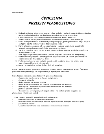 Danuta Dobek ĆWICZENIA PRZECIW PŁASKOSTOPIU 1. Siad ugięty (kolana ugięte), ręce oparte z tyłu o podłoże – zwijanie palcami stóp ręcznika bez obciążenia i z obciążeniem (np. książka na ręczniku), pięta oparta o podłoże. 2. Chwytanie palcami stóp drobnych przedmiotów (klocki, kredki, woreczki). 3. Siad na krześle, kolana proste – unoszenie palcami stóp woreczka i opuszczanie go. 4. Marsz na całych stopach- podłoża dotyka najpierw pięta, później zewnętrzna część stopy a następnie zgięte podeszwowo (w dół) wszystkie palce. 5. Stanie z lekkim oparciem rąk o poręcz krzesła – wysokie wspięcia na palce (niskie wspięcia powodują spłaszczenie łuku poprzecznego stopy). 6. Stanie z oparciem rąk o poręcz krzesła – naprzemienne wysokie wspięcia na palce na prawej i lewej nodze. 7. Siad ugięty – zginanie i prostowanie palców stóp bez unoszenia ich nad podłogą. 8. Siad z kolanami prostymi – chwyty palcami stóp woreczka lub innych przedmiotów i przekładanie ich do przeciwnej dłoni. 9. Postawa, ramiona w bok – ugięcie jednej nogi i położenie stopy na kolanie nogi wyprostowanej (element równowagi). 10. Marsz z ustawianiem stóp w jednej linii lub skrzyżnie. Każde ćwiczenie należy powtórzyć minimum 10 razy. Tempo powinno być wolne. Ćwiczenia powtarzać należy tak długo, jak długo można je wykonywać poprawnie. Przy stopach płaskich i płasko-koślawych przeciwwskazane są: długotrwałe stanie, marsz z dużym obciążeniem dźwiganie ciężarów skoki i zeskoki na twarde podłoże stanie w dużym rozkroku ze stopami skierowanymi na zewnątrz siad klęczny ( na piętach) z podudziami skierowanymi na zewnątrz jazda na łyżwach i rolkach chodzenie na wewnętrznych brzegach stóp i na piętach (może pogłębiać się płaskostopie i koślawość pięty ) - Przy stopach płaskich i płasko-koślawych zalecane są: pływanie (kraul, styl grzbietowy i motylkowy) chodzenie boso po nierównym terenie, wysokiej trawie, mokrym piasku na plaży prawidłowe obuwie wkładki ortopedyczne oraz jednoczesne wykonywanie ćwiczeń