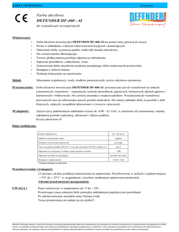 KARTA TECHNICZNA WYDANIE II Farba akrylowa DEFENDER DF-460 - AI do wymalowań wewnętrznych. Właściwości; • • • • • • • • • Skład; Farba akrylowa inwestycyjna DEFENDER DF-460-AI ma postać masy gotowej do użycia. Prosta w nakładaniu, o dużych właściwościach kryjących i penetrujących. Nanoszenie farby za pomocą pędzla, wałka lub metodą natryskową. Nie zawiera piasku fakturującego. Tworzy gładką matową powłokę odporną na zabrudzenia. Zapewnia prawidłowe ,,oddychanie,, ścian. Zastosowanie farby umożliwia uzyskanie pożądanego efektu malowanych powierzchni. Dostępna w kolorze białym. Wybrana kolorystyka na zamówienie. Mieszanina wypełniaczy, wody, środków pomocniczych, żywicy akrylowo-styrenowej. Przeznaczenie; Farba akrylowa inwestycyjna DEFENDER DF-460-AI przeznaczona jest do wymalowań na tynkach cementowych, cementowo – wapiennych, tynkach mineralnych, gipsowych, betonowych, płytach gipsowo – kartonowych i włóknowych. Nie zawiera amoniaku i rozpuszczalników. Przeznaczona do wymalować pierwotnych oraz do odświeżania starych powłok malarskich. Nie należy nakładać farby na powłoki z farb klejowych, olejnych, na podłoża lakierowane i z tworzyw sztucznych. Wydajność; Zużycie przy jednokrotnym nakładaniu wynosi ok. 0,08 – 0,1 l/m2. w zależności od zastosowanej metody nakładania powłoki malarskiej, chłonności i faktury podłoża. Krycie jakościowe II Dane techniczne; Gęstość objętościowa Zdolność rozcieńczania wodą Ściekanie z powierzchni pionowych ok. 1,45 g/cm³ zupełne nie ścieka Czas wysychania powłoki (20±2)°C i w/g wzgl. powietrza (55±5)%, stopień 5, h max.3 Odporność na szorowanie na mokro, liczba posuwów szczotki >200 Odporność powłoki na reemulgacje Dostępna w opakowaniach powłoka bez zmian 10 lit*, 18 lit * Pojemność dostępna na zamówienie Przechowywanie i transport: 12 miesięcy od daty produkcji umieszczonej na opakowaniu. Przechowywać w suchych i ciepłym miejscu / +5°C do + 25°C / w oryginalnym i szczelnie zamkniętym opakowaniu producenta. Chronić przed mrozem i przegrzaniem. UWAGA ! Prace wykonywać w temperaturze od +5 do + 25C. Przestrzegać czasu schnięcia farby pomiędzy nakładanymi pojedynczymi powłokami. Po zakończeniu prac narzędzia umyć bieżącą wodą. Towar przemrożony nie nadaje się do użytku!!. Wszelkie informacje zawarte w karcie technicznej nie przyniosą spodziewanego efektu bez zastosowania sie wykonawcy do instrukcji umieszczanych na opakowaniach sporządzonych w dobrej wierze i na podstawie wnikliwych badań oraz zebranych doświadczeń w sposobach postępowania z produktami oraz w sposobach prowadzenia prac remontowych lub wykończeniowych. Zawarte wskazówki nie zwalniają nabywcy od sprawdzenia na własną odpowiedzialność przydatności naszych produktów do przewidzianych przez nabywcę zastosowań.. KARTA TECHNICZNA WYDANIE II Bezpieczeństwo; P102 – chronić przed dziećmi P101 – w razie konieczności zasięgnąć porady lekarza P262 – nie wprowadzać do oczu, na skórę lub na odzież Przygotowanie podłoża; Powierzchnie muszą być czyste, nośne, stabilne i równe, wolne od kurzu, smarów, resztek farb, pleśni, glonów i mchów itp. Powierzchnie pokryte glonami, mchem należy pokryć środkiem biobójczym DEFENDER DZ – 800 , a następnie oczyścić mechanicznie za pomocą twardej gąbki lub szczotkami, strumieniem wody pod ciśnieniem. Powierzchnie silnie spękane lub zarysowane należy naprawiać zaprawą szpachlowo – wyrównującą. Nierówności podłoża można wyrównać gotową masą szpachlową DEFENDER DM- 600. Naprawiane miejsca muszą być wyschnięte i dobrze związane, a w razie konieczności wyszlifowane. Podłoże musi być suche i dojrzałe na całej powierzchni. Podłoża o niedostatecznej przyczepności / piaszczące lub kredujące / należy usunąć. Podłoża pylące, silnie lub nierówno nasiąkliwe np. beton komórkowy, płyty gipsowo – kartonowe można wcześniej zagruntować preparatem DEFGRUNT. Przygotowanie produktu; Farbę przed użyciem dokładnie wymieszać. Do farby nie należy dodawać wody ani innych materiałów. Sposób stosowania; Farbę można nanosić na podłoża za pomocą wałka lub pędzla oraz metodą natryskową. Prace powinny być prowadzone metodą ciągłą co pozwoli wyeliminować nierównomierność kolorystyczną ostatecznej warstwy. Świeżo wykonane tynki mogą być malowane po 28 dniach sezonowania, tynki gipsowe sezonowane po14 dniach, a dla tzw. ,,tynków suchych,, bez sezonowania bezpośrednio po przeszlifowaniu. W zależności od rodzaju podłoża nanosić jedna lub dwie warstwy w odstępach 2-4 godzin. Czas wysychania farby uzależniony jest od grubości naniesionej warstwy, chłonności podłoża i średnio wynosi ok 2-3 godzin. Przy niższych temperaturach oraz podczas dużej wilgotności czas ten może sie wydłużyć. Okna, drzwi oraz powierzchnie, które nie są przeznaczone do malowania osłonić folią. W czasie prowadzenia prac i po ich zakończeniu wietrzyć do zaniku zapachu. Dokument odniesienia: PN-C-81914: 2002 „Farby dyspersyjne stosowane wewnątrz ”. Producent; Wyprodukowane dla DEFENDER QUALITY przez ,, BEM ,, 95-100 Zgierz, ul. Barwnikowa 10 tel/fax; (42) 714 01 00/01 e-mail; [email protected] www.defendertynki.pl Data opracowania; 10/2015 Wszelkie informacje zawarte w karcie technicznej nie przyniosą spodziewanego efektu bez zastosowania sie wykonawcy do instrukcji umieszczanych na opakowaniach sporządzonych w dobrej wierze i na podstawie wnikliwych badań oraz zebranych doświadczeń w sposobach postępowania z produktami oraz w sposobach prowadzenia prac remontowych lub wykończeniowych. Zawarte wskazówki nie zwalniają nabywcy od sprawdzenia na własną odpowiedzialność przydatności naszych produktów do przewidzianych przez nabywcę zastosowań..