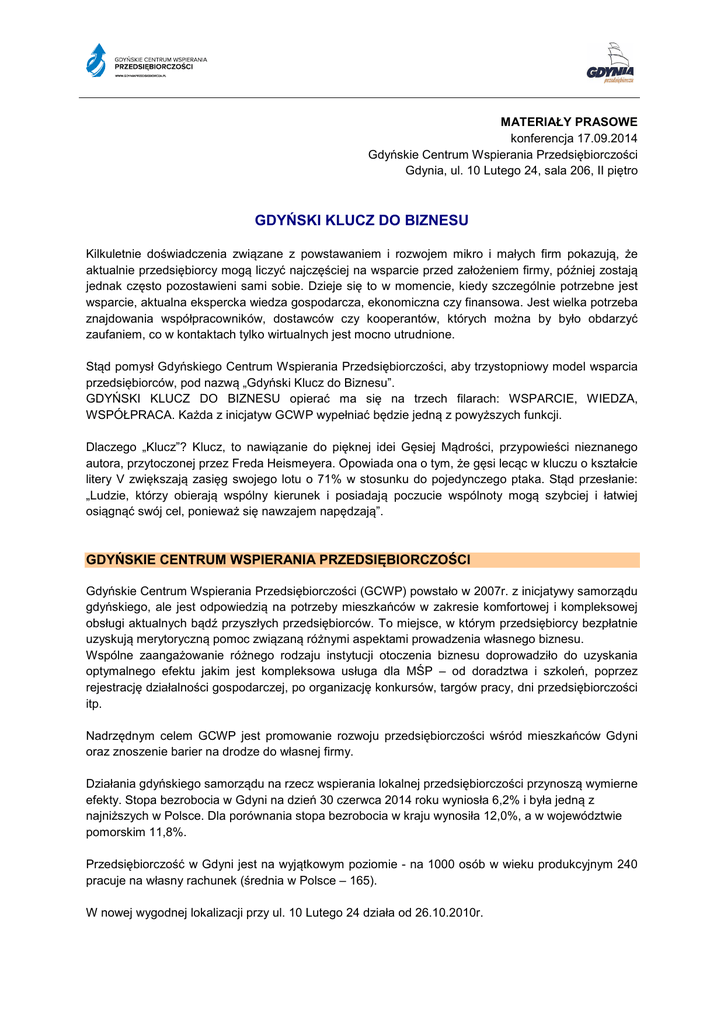 MATERIAŁY PRASOWE konferencja 17.09.2014 Gdyńskie Centrum Wspierania Przedsiębiorczości Gdynia, ul. 10 Lutego 24, sala 206, II piętro GDYŃSKI KLUCZ DO BIZNESU Kilkuletnie doświadczenia związane z powstawaniem i rozwojem mikro i małych firm pokazują, że aktualnie przedsiębiorcy mogą liczyć najczęściej na wsparcie przed założeniem firmy, później zostają jednak często pozostawieni sami sobie. Dzieje się to w momencie, kiedy szczególnie potrzebne jest wsparcie, aktualna ekspercka wiedza gospodarcza, ekonomiczna czy finansowa. Jest wielka potrzeba znajdowania współpracowników, dostawców czy kooperantów, których można by było obdarzyć zaufaniem, co w kontaktach tylko wirtualnych jest mocno utrudnione. Stąd pomysł Gdyńskiego Centrum Wspierania Przedsiębiorczości, aby trzystopniowy model wsparcia przedsiębiorców, pod nazwą „Gdyński Klucz do Biznesu”. GDYŃSKI KLUCZ DO BIZNESU opierać ma się na trzech filarach: WSPARCIE, WIEDZA, WSPÓŁPRACA. Każda z inicjatyw GCWP wypełniać będzie jedną z powyższych funkcji. Dlaczego „Klucz”? Klucz, to nawiązanie do pięknej idei Gęsiej Mądrości, przypowieści nieznanego autora, przytoczonej przez Freda Heismeyera. Opowiada ona o tym, że gęsi lecąc w kluczu o kształcie litery V zwiększają zasięg swojego lotu o 71% w stosunku do pojedynczego ptaka. Stąd przesłanie: „Ludzie, którzy obierają wspólny kierunek i posiadają poczucie wspólnoty mogą szybciej i łatwiej osiągnąć swój cel, ponieważ się nawzajem napędzają”. GDYŃSKIE CENTRUM WSPIERANIA PRZEDSIĘBIORCZOŚCI Gdyńskie Centrum Wspierania Przedsiębiorczości (GCWP) powstało w 2007r. z inicjatywy samorządu gdyńskiego, ale jest odpowiedzią na potrzeby mieszkańców w zakresie komfortowej i kompleksowej obsługi aktualnych bądź przyszłych przedsiębiorców. To miejsce, w którym przedsiębiorcy bezpłatnie uzyskują merytoryczną pomoc związaną różnymi aspektami prowadzenia własnego biznesu. Wspólne zaangażowanie różnego rodzaju instytucji otoczenia biznesu doprowadziło do uzyskania optymalnego efektu jakim jest kompleksowa usługa dla MŚP – od doradztwa i szkoleń, poprzez rejestrację działalności gospodarczej, po organizację konkursów, targów pracy, dni przedsiębiorczości itp. Nadrzędnym celem GCWP jest promowanie rozwoju przedsiębiorczości wśród mieszkańców Gdyni oraz znoszenie barier na drodze do własnej firmy. Działania gdyńskiego samorządu na rzecz wspierania lokalnej przedsiębiorczości przynoszą wymierne efekty. Stopa bezrobocia w Gdyni na dzień 30 czerwca 2014 roku wyniosła 6,2% i była jedną z najniższych w Polsce. Dla porównania stopa bezrobocia w kraju wynosiła 12,0%, a w województwie pomorskim 11,8%. Przedsiębiorczość w Gdyni jest na wyjątkowym poziomie - na 1000 osób w wieku produkcyjnym 240 pracuje na własny rachunek (średnia w Polsce – 165). W nowej wygodnej lokalizacji przy ul. 10 Lutego 24 działa od 26.10.2010r. OFERTA GCWP 1. Ewidencja działalności gospodarczej GCWP realizuje ideę „jednego okienka” czyli daje możliwość załatwienia wszystkich formalności w jednym miejscu. Osoby zamierzające założyć działalność gospodarczą i przedsiębiorcy już zarejestrowani na terenie Gdyni mogą załatwić najpilniejsze sprawy w jednym miejscu, bez konieczności przemieszczania się po mieście. Umożliwia to współpraca z Partnerami Strategicznymi: Zakładem Ubezpieczeń Społecznych i Urzędami Skarbowymi. Systematycznie skraca się czas procesu rejestracji działalności gospodarczej – aktualnie jest to rekordowy poziom – 30 minut! W Gdyni aktualnie działa blisko 27 tys. przedsiębiorców – osób fizycznych prowadzących indywidualną działalność gospodarczą lub wspólników spółek cywilnych 2. Doradcy biznesowi W GCWP bezpłatne dyżury pełnią specjaliści z różnych dziedzin przydatnych przedsiębiorcom. Eksperci doradzają w zakresie dostępnych programów pomocowych dla przedsiębiorców, możliwych źródeł finansowania działalności gospodarczej, prawnych aspektów prowadzenia biznesu czy oferty instytucji wspierających przedsiębiorczość. Aktualnie współpracuje z nami 9 specjalistów z różnych dziedzin. Organizujemy 15 stałych dyżurów w miesiącu. W odpowiedzi na potrzeby przedsiębiorców przewiduje się również rozszerzenie oferty bezpłatnych dyżurów ekspertów w GCWP. Dodatkowe konsultacje będzie miał trener przedsiębiorczości. W związku z pojawiającymi się możliwościami pozyskiwania finansowania działalności gospodarczej istnieje duże zainteresowanie poradami w zakresie tworzenia biznesplanów. Uruchomione zostaną także dyżury doradcy podatkowego – problematyka optymalizacji kosztów zawsze budzi zainteresowania przedsiębiorców, a wiele zagadnień może wyjaśnić jedynie doświadczony doradca podatkowy. 3. Portal biznesowy Centrum prowadzi również stronę internetową www.gdyniaprzedsiebiorcza.pl, gdzie na bieżąco zamieszczane są aktualne informacje na temat inicjatyw ukierunkowanych na wsparcie MŚP, ogłoszenia dotyczące aktualnych naborów wniosków w konkursach o przyznanie dotacji ze środków Unii Europejskiej, a także szereg praktycznych porad dotyczących zakładania i prowadzenia działalności gospodarczej. W okresie ostatnich 14 dni średnia odsłon na 1 dzień wyniosła 1591. W listopadzie 2013 roku nastąpiło otwarcie oficjalnego profilu Gdyńskiego Centrum Wspierania Przedsiębiorczości na Facebook’u (facebook.com/gdyniaprzedsiebiorcza). 4. Aktywizacja zawodowa osób niepełnosprawnych Wśród interesantów GCWP szczególne miejsce zajmują osoby niepełnosprawne, ponieważ tu mogą znaleźć szereg instrumentów wsparcia – od pomocy merytorycznej w załatwianiu spraw formalnych po doradztwo i informację na temat programów aktywizujących zawodowo lub umożliwiających podjęcie działalności gospodarczej. GCWP realizując powyższe działania wspó