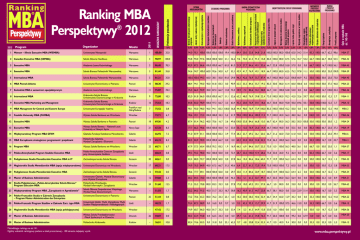 Wpływ otoczenia biznesowego na kształt programu Wymagania do zaliczenia studiów curriculum (trzon programu mBa) 3 98,97 100,0 93,8 93,0 97,6 100,0 100,0 50,0 21,1 36,2 9,6 MBA-42 3 Executive MBA Akademia Leona Koźmińskiego Warszawa 2 86,40 78,3 82,9 87,5 86,6 100,0 100,0 66,7 81,0 81,0 21,9 27,7 84,6 49,1 32,6 66,7 22,8 100,0 53,8 57,0 0,0 4 Executive MBA Szkoła Biznesu Politechniki Warszawskiej Warszawa 3 81,44 35,8 94,6 94,7 100,0 60,0 92,6 50,0 5 International MBA Szkoła Biznesu Politechniki Warszawskiej Warszawa 5 81,31 35,8 100,0 100,0 99,3 60,0 38,1 50,0 81,0 29,8 46,3 42,6 76,9 55,7 87,4 66,7 100,0 80,0 62,5 100,0 60,9 6 MBA Poznań-Atlanta Uniwersytet Ekonomiczny w Poznaniu Poznań 10 80,30 29,2 88,4 94,1 90,0 40,0 81,8 83,3 7 Koźmiński MBA z semestrem specjalistycznym Akademia Leona Koźmińskiego Warszawa 11 75,87 78,3 75,4 66,3 92,9 40,0 87,4 66,7 11,8 73,4 10,9 66,7 100,0 16,7 100,0 45,3 MBA-46 8 International MBA Kraków 9 75,80 18,3 82,0 81,8 86,0 100,0 100,0 66,7 51,1 52,6 63,2 48,0 76,9 39,8 22,4 75,0 100,0 80,0 92,3 42,0 32,6 59,7 50,0 100,0 50,0 12,5 3,7 MBA-11 9 Executive MBA Marketing and Managment Krakowska Szkoła Biznesu Uniwersytetu Ekonomicznego w Krakowie Krakowska Szkoła Biznesu Uniwersytetu Ekonomicznego w Krakowie Kraków 16 75,52 18,3 84,8 83,0 90,9 100,0 97,3 66,7 MBA-10 9 MBA Managment for Central and Eastern Europe Uniwersytet Europejski Viadrina Frankfurt nad Odrą/Słubice 7 75,52 0,8 90,1 92,0 98,0 40,0 94,1 83,3 100,0 36,8 44,4 90,0 76,9 73,9 100,0 83,3 100,0 100,0 42,2 50,0 0,0 0,0 50,0 100,0 50,0 12,5 14,8 MBA-2 11 Franklin University MBA (FUMBA) Wyższa Szkoła Bankowa we Wrocławiu Wrocław – 73,71 6,7 78,6 49,1 73,3 100,0 100,0 33,3 5,2 31,9 99,8 100,0 84,6 100,0 17,4 91,7 100,0 40,0 56,3 48,0 26,1 0,0 100,0 0,0 50,0 25,0 1,1 MBA-56 12 Executive MBA Wyższa Szkoła Bankowa w Poznaniu Poznań 18 69,56 4,2 87,4 81,4 96,2 40,0 70,6 16,7 3,6 49,6 100,0 53,8 84,6 66,8 13,0 66,7 62,4 80,0 56,3 58,5 50,0 100,0 50,0 100,0 50,0 50,0 1,2 MBA-24 13 Executive MBA Wyższa Szkoła Biznesu – National-Louis University w Nowym Sączu Nowy Sącz 21 67,32 8,3 77,7 66,5 90,6 100,0 100,0 50,0 4,1 53,0 55,1 12,0 76,9 25,0 14,4 66,7 100,0 40,0 55,5 0,0 0,0 83,3 100,0 66,7 25,0 37,3 MBA-19 14 Międzynarodowy Program MBA GFKM Gdańska Fundacja Kształcenia Menedżerów Gdańsk – 66,92 7,5 91,0 87,9 81,1 100,0 100,0 83,3 3,9 77,4 28,2 23,7 69,2 36,1 20,5 66,7 51,6 60,0 72,0 61,0 43,5 0,0 50,0 100,0 33,3 25,0 39,4 MBA-6 15 MBA Zarządzanie strategiczne: programami i projektami Politechnika Gdańska, Wydział Zarządzania i Ekonomii Gdańsk 19 65,15 8,3 83,5 84,9 90,0 100,0 100,0 66,7 0,0 0,0 63,2 44,0 50,0 34,8 42,5 75,0 56,3 100,0 56,3 56,0 0,0 0,0 33,3 100,0 16,7 0,0 42,7 MBA-3 16 Program MBA Wyższa Szkoła Bankowa we Wrocławiu Wrocław 22 60,71 6,7 67,9 57,3 60,4 100,0 95,2 83,3 1,9 16,9 66,5 0,0 66,7 0,0 50,0 25,0 1,1 MBA-57 17 Polsko-Amerykański Program Studiów Executive MBA Polsko-Amerykańskie Centrum Zarządzania przy Uniwersytecie Łódzkim Łódź – 60,64 0,8 89,3 93,3 98,0 40,0 100,0 50,0 0,0 72,4 28,7 25,0 100,0 47,4 28,6 75,0 33,0 20,0 36,4 0,0 0,0 83,3 100,0 66,7 5,6 MBA-17 18 Podyplomowe Studia Menedżerskie Executive MBA in IT Zachodniopomorska Szkoła Biznesu Szczecin 20 60,61 0,0 82,4 80,0 92,7 100,0 100,0 50,0 0,0 27,8 36,6 10,4 84,6 38,6 60,4 91,7 10,9 100,0 56,3 64,4 0,0 0,0 50,0 100,0 16,7 12,5 1,3 MBA-33 19 Magisterskie Studia Menedżerskie MBA (opcja międzynarodowa) Uniwersytet Ekonomiczy we Wrocławiu Wrocław 17 60,21 17,5 74,9 76,3 84,9 40,0 67,5 66,7 31,5 40,6 6,4 65,0 0,0 0,0 50,0 0,0 50,0 12,5 3,8 MBA-55 20 Podyplomowe Studia Menedżerskie Executive MBA Zachodniopomorska Szkoła Biznesu Szczecin 12 59,42 0,0 78,6 77,7 89,1 100,0 100,0 50,0 29,7 33,0 11,4 84,6 30,9 18,7 100,0 10,9 100,0 56,3 64,4 6,5 0,0 50,0 100,0 16,7 12,5 1,3 MBA-34 21 Master of Business Administration Gdańsk 12 59,06 3,3 80,3 84,5 78,0 100,0 100,0 100,0 0,0 46,3 10,5 0,0 50,0 100,0 33,3 0,0 8,9 MBA-31 22 Studia Podyplomowe „Polsko-Amerykańska Szkoła Biznesu” Program Executive MBA Wrocław 24 51,60 12,5 71,3 55,2 78,8 80,0 83,3 33,3 27,8 17,8 10,0 69,2 39,1 37,8 66,7 3,0 80,0 0,0 33,0 0,0 0,0 50,0 0,0 26,7 MBA-62 23 Międzynarodowy Program MBA „Zarządzanie w Agrobiznesie” Warszawa – 51,55 1,7 82,2 84,5 91,5 40,0 51,7 33,3 16,7 38,8 16,2 40,9 61,5 44,7 25,8 66,7 38,1 80,0 0,0 52,0 23,9 51,4 50,0 100,0 16,7 0,0 5,3 MBA-44 24 Polsko-Francuskie Studia w Zakresie Zarządzania – Program Master Administration des Entreprises Uniwersytet Gdański, Wydział Ekonomiczny oraz Wydział Zarządzania Politechnika Wrocławska, Wydział Informatyki i Zarządzania Szkoła Główna Gospodarstwa Wiejskiego, Wydział Nauk Ekonomicznych Uniwersytet Ekonomiczny w Poznaniu Poznań 25 51,44 0,8 73,2 70,6 65,3 80,0 76,2 33,3 23,1 6,0 10,2 30,0 38,5 40,6 32,4 66,7 34,4 60,0 12,9 30,2 0,0 0,0 33,3 100,0 50,0 12,5 41,8 MBA-22 25 Polsko-Francuski Program Studiów w Zakresie Zarz. typu MBA Uniwersytet Łódzki, Wydz. Zarządzania, Wydz. Studiów Międzynarodowych i Politologicznych Łódź – 48,22 1,7 93,4 87,3 88,9 0,0 9,7 5,0 45,5 92,3 15,7 29,9 41,7 51,9 100,0 37,5 46,6 13,0 0,0 33,3 100,0 66,7 5,6 MBA-15 26 Magisterskie Studia Menedżerskie MBA (opcja polskojęzyczna) Uniwersytet Ekonomiczny we Wrocławiu Wrocław – 47,42 17,5 74,9 60,7 86,0 40,0 81,7 33,3 0,0 53,4 7,4 5,3 61,5 64,9 15,8 50,0 0,0 100,0 0,0 65,0 0,0 0,0 50,0 0,0 16,7 12,5 3,8 MBA-56 27 Master of Business Administration Wyższa Szkoła Przedsiębiorczości i Nauk Społecznych w Otwocku Otwock 26 44,87 0,0 80,3 63,4 93,8 0,0 62,5 33,3 0,0 0,0 29,7 5,6 61,5 34,8 76,5 91,7 20,3 100,0 0,0 49,2 0,0 67,9 0,0 0,0 16,7 0,0 0,6 MBA-20 28 Master of Business Administration Politechnika Krakowska Kraków – 36,81 10,8 82,4 74,6 83,5 0,0 31,8 22,1 62,5 9,7 4,8 30,8 22,4 32,5 41,7 0,0 30,0 0,0 0,0 33,3 0,0 33,3 0,0 3,3 MBA-13 Metodologia rankingu na str.141. Ogólny wskaźnik rankingowy podano w skali proc