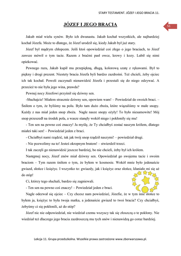 STARY TESTAMENT. JÓZEF I JEGO BRACIA 11. JÓZEF I JEGO BRACIA Jakub miał wielu synów. Było ich dwunastu. Jakub kochał wszystkich, ale najbardziej kochał Józefa. Może to dlatego, że Józef urodził się, kiedy Jakub był już stary. Józef był mądrym chłopcem. Jeśli ktoś opowiedział coś złego o jego braciach, to Józef zawsze mówił o tym tacie. Razem z braćmi pasł owce, krowy i kozy. Lubił się nimi opiekować. Pewnego razu, Jakub kupił mu przepiękną, długą, kolorową szatę z rękawami. Był to piękny i drogi prezent. Niestety bracia Józefa byli bardzo zazdrośni. Też chcieli, żeby ojciec ich tak kochał. Powoli zaczynali nienawidzić Józefa i przestali się do niego odzywać. A przecież to nie była jego wina, prawda? Pewnej nocy Józefowi przyśnił się dziwny sen. -Słuchajcie! Miałem strasznie dziwny sen, opowiem wam! – Powiedział do swoich braci. – Śniłem o tym, że byliśmy na polu. Było tam dużo zboża, które wiązaliśmy w małe snopy. Każdy z nas miał jeden snop zboża. Nagle nasze snopy ożyły! To było niesamowite! Mój snop przeszedł na środek pola, a wasze stanęły wokół niego i pokłoniły się mu! - Ten sen na pewno coś znaczy! Ja myślę, że Ty chciałbyś zostać naszym królem, dlatego miałeś taki sen! – Powiedział jeden z braci. - Chciałbyś nami rządzić, tak jak twój snop rządził naszymi! – powiedział drugi. - Nie pozwolimy na to! Jesteś okropnym bratem! – stwierdził trzeci. I tak zaczęli go nienawidzić jeszcze bardziej, bo nie chcieli, żeby był ich królem. Następnej nocy, Józef znów miał dziwny sen. Opowiedział go swojemu tacie i swoim braciom – Tym razem śniłem o tym, że byłem w kosmosie. Wokół mnie było jedenaście gwiazd, słońce i księżyc. I wszystko to: gwiazdy, jak i księżyc oraz słońce, kłaniało mi się aż do stóp! Ci, którzy tego słuchali, bardzo się zagniewali. - Ten sen na pewno coś znaczy! – Powiedział jeden z braci. Nagle odezwał się ojciec – Czy chcesz nam powiedzieć, Józefie, że w tym śnie słońce to byłem ja, księżyc to była twoja matka, a jedenaście gwiazd to twoi bracia? Czy chciałbyś, żebyśmy ci się pokłonili, aż do stóp? Józef nic nie odpowiedział, nie wiedział czemu wszyscy tak się złoszczą o te pokłony. Nie wiedział też dlaczego jego bracia zazdroszczą mu tych snów i nienawidzą go coraz bardziej. Lekcja 11. Grupa przedszkolna. Wszelkie prawa zastrzeżone www.zborwarszawa.pl. 51 STARY TESTAMENT. JÓZEF I JEGO BRACIA 11. Pewnego dnia, bracia Józefa poszli do miasta Sychem, żeby tam paść swoje owce. Ojciec nakazał Józefowi, żeby do nich dołączył. - Józefie, proszę, idź do braci, zobacz jak się mają i czy wszystko u nich dobrze, a potem tu wróć i opowiedz mi o tym. – Powiedział do niego. Józef chętnie wybrał się w podróż. Niestety, kiedy dotarł na miejsce, nikogo nie znalazł. Szukał braci po polu, ale nikogo nie było. Na szczęście, spotkał człowieka, który powiedział mu, że bracia poszli paść do miasta Dotan. Kiedy Józef zbliżał się do Dotanu, bracia już z daleka go widzieli. Wcale się nie ucieszyli, że do nich idzie. - Oho! Idzie nasz brat! Widzicie? Ten mistrz od snów – drwili sobie z niego. - Bracia! Zabijmy go, jest taki denerwujący, nienawidzę go! – stwierdził jeden z braci. – Moglibyśmy go zabić, wrzucić do studni, żeby go nikt nie znalazł, a w domu powiedzielibyśmy, że pożarł go jakiś dziki zwierz! Wtedy nic by nie wyszło z jego głupich snów! Wielu braci zgodziło się na ten okrutny pomysł. Na szczęście jeden z nich – Ruben – zlitował się nad Józefem. Powiedział, że nie można zabijać. Zaproponował, żeby bracia wrzucili Józefa do studni, ale go nie zabijali. Chciał potem potajemnie wyciągnąć go z niej i zaprowadzić do ojca. Bracia zgodzili się na to. Gdy tylko Józef do nich przybył, schwytali go, zabrali mu piękną szatę, którą dostał od ojca i wrzucili go do wyschniętej studni na pustkowiu. Potem, jak gdyby nic się nie stało, zasiedli do stołu i zaczęli jeść obiad. Wtedy zobaczyli rząd podróżnych kupców, którzy jechali na wielbłądach. Wpadł im do głowy pewien pomysł. Postanowili, że sprzedadzą Józefa. Dzięki temu mogli zarobić dużo pieniędzy, więc uznali to za dobry pomysł i chętnie to zrobili. Wyciągnęli go ze studni i sprzedali za dwadzieścia srebrników. Kupcy pojechali z Józefem do Egiptu. Kiedy Ruben wrócił do studni, żeby uratować brata, już go tam nie było. Ruben bardzo się zasmucił. Nie wiedział co ma zrobić. Co powiedzieć ojcu? Jego bracia zabili koziołka i jego krwią pomoczyli szatę Józefa. Potem pokazali tę szatę ojcu i powiedzieli, że ją znaleźli, że na pewno jakiś dziki zwierz zabił Józefa. Skłamali. Ich ojciec – Jakub – uwierzył synom i bardzo się zasmucił. Była to dla niego tragedia! Na znak tego, jak bardzo cierpi po stracie ukochanego syna, założył wór na siebie i bardzo długo płakał. Nikt nie był w stanie go pocieszyć, a wielu ludzi próbowało to zrobić, jednak nic nie wskórali. Jakub był tak smutny, że sam również chciał umrzeć. Wyobraźcie sobie jak wielki to był smutek. Lekcja 11. Grupa przedszkolna. Wszelkie prawa zastrzeżone www.zborwarszawa.pl. 52 STARY TESTAMENT. JÓZEF I JEGO BRACIA 11. ZADANIE 1 Józef miał sen o gwiazdach, które mu się kłaniały. Pokoloruj gwiazdy, słońce i księżyc według wzoru. Kolorowa gwiazda na środku to gwiazda Józefa. Lekcja 11. Grupa przedszkolna. Wszelkie prawa zastrzeżone www.zborwarszawa.pl. 53 STARY TESTAMENT. JÓZEF I JEGO BRACIA 11. ZADANIE 2 W drugim śnie Józef widział snopy ze zboża, które mu się kłaniały. Wytnij dwa trójkąty z żółtego papieru kolorowego i złóż je w snop jak na obrazku. Następnie dorysuj kłosy i doklej sznur, który przewiązuje snop. Snopy to równo ułożone i związane zboże. Układanie zbóż w snopy ułatwiało