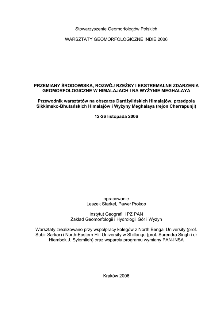 Stowarzyszenie Geomorfologów Polskich WARSZTATY GEOMORFOLOGICZNE INDIE 2006 PRZEMIANY ŚRODOWISKA, ROZWÓJ RZEŹBY I EKSTREMALNE ZDARZENIA GEOMORFOLOGICZNE W HIMALAJACH I NA WYŻYNIE MEGHALAYA Przewodnik warsztatów na obszarze Dardżylińskich Himalajów, przedpola Sikkimsko-Bhutańskich Himalajów i Wyżyny Meghalaya (rejon Cherrapunji) 12-26 listopada 2006 opracowanie Leszek Starkel, Paweł Prokop Instytut Geografii i PZ PAN Zakład Geomorfologii i Hydrologii Gór i Wyżyn Warsztaty zrealizowano przy współpracy kolegów z North Bengal University (prof. Subir Sarkar) i North-Eastern Hill University w Shillongu (prof. Surendra Singh i dr Hiambok J. Syiemlieh) oraz wsparciu programu wymiany PAN-INSA Kraków 2006 Program warsztatów 12.11. Warszawa – Monachium – Delhi Przylot do Delhi 7.45, przejazd do INSA Guest House, po południu zwiedzanie Delhi. Nocleg w INSA Guest House. 13.11. Delhi – Bagdogra – North Bengal University (NBU) w Siliguri Godz. 8.00 wyjazd na lotnisko, przelot Delhi 10.25 - Bagdogra 12.15, przejazd do North Bengal University (NBU) w Siliguri, godz. 15.00-17.30 seminarium “Geomorphology of Mountain Areas”. Nocleg w NBU Guest House. 14.11. NBU – Tindharia – Kurseong – Ambootia – Sonada – Dardżyling Przejazd autami z NBU do Darjdżylingu, rzeźba brzegu młodych gór, osuwiska, w tym osuwisko Ambootia, zwiedzanie plantacji herbaty. Nocleg w Tourist Lodge w Dardżylingu. 15.11. Dardżyling – Ging i okolice Osuwiska i stacja badawcza w Ging, zwiedzanie Himalaya Mountaneering Institute, ośrodka tybetańskiego Tibetian Refuge Centre i in.). Nocleg w Tourist Lodge w Dardżylingu 16.11. Dardżyling – Tista Bazar – Kalimpong – Kalijhora Przejazd Darjeeling – Pashok – Tista Bazar – dolina Tisty (terasy, koryta). Nocleg w Kalijhora Guest House. 17.11. Kalijhora – Gish – Gorbathan – Jaldhapara Przejazd wzdłuż Himalajów od wylotu doliny Tisty do doliny Torsy. Koryta rzek roztokowych, agradacja, młoda tektonika. Nocleg w Jaldhapara Tourist Lodge. 18.11. Jaldhapara – Kaljani – Phountsholing – Jalpaiguri – NBU Osuwiska i agradacja u brzegu Bhutańskich Himalajów, w dorzeczu Pagli i Gabur Basra, powrót do NBU. Nocleg w NBU Guest House. 19.11. NBU – Balasan – Bagdogra – Gauhati – Shillong Wylot rzeki Balasan z gór, przelot Bagdogra 12.50 – Gauhati 13.40, punkt widokowy na Brahmaputrę w Gauhati, przejazd do Shillongu. Nocleg w NEHU Guest House. 20.11. Shillong Seminarium w North Eastern Hill University (NEHU) „Environmental Changes and Geomorphologic Hazards”. Nocleg w NEHU Guest House. 21.11. Shillong – Mylliem – Cherrapunji – Laitkynsew Granitowy batolit okolic Mylliem, kaniony rzek na południowym skłonie wyżyny, odkrywkowe kopalnie węgla, profile gleb, wodospad Nohkalikai, zlewnia eksperymentalna Maw-ki Syiem w Cherrapunji. Nocleg w Laitkynsew Holiday Resort. 22.11. Latiktynsew – Cherrapunji – Shillong Punkt widokowy na Bangladesz, zwiedzanie jaskini i wodospadów w Mawsmai, przejazd przez Cherrapunji, megality. Nocleg w NEHU Guest House w Shillongu. 2 23.11. Shillong – Gauhati – Delhi Wyjazd w godzinach porannych z Shillongu, przelot Gauhati 15.40 – Delhi 18.25. Nocleg w INSA Guest House 24.11. Delhi Zwiedzanie Delhi, czas wolny. Nocleg w INSA Guest House 25.11. Delhi – Agra – Delhi Wyjazd w godzinach porannych do Agry, zwiedzanie Taj Mahal, powrót w godzinach nocnych. Nocleg w INSA Guest House 26.11. Delhi – Monachium – Warszawa Przelot Delhi 9.55 – Monachium 14.00 Monachium 14.45 – Warszawa 16.20 3 Historia badań zespołu polskiego we wschodnich Indiach i współpracy z ośrodkami indyjskimi W okresie XI.1968-III.1969 w ramach programu wymiany PAN-CSIR pierwsze badania prowadził L.Starkel, który opublikował skutki ekstremalnego opadu z października 1968 r. w Dardżylińskich Himalajach oraz scharakteryzował typ i natężenie erozji gleb w różnych regionach klimatu monsunowego Indii m.in. wizytując rejon Cherrapunji (publikacja w Geographia Polonica 1972). W 1984 r. w ramach wymiany PAN-INSA L.Starkel i W.Froehlich rozpoczęli regularne badania półstacjonarne procesów geomorfologicznych oraz skutków ekstremalnych zjawisk koncentrując się m.in. na analizie opadów, obiegu wody, w glebie, tempie erozji i sedymentacji, a szczególnym obiektem obserwacji stało się osuwisko Ambootia. W badaniach czynny udział brali E.Gil, R.Soja, jak również w mniejszym zakresie I.Kasza, P.Prokop, T.Kalicki i in. Badania były realizowane przy dużej pomocy Darjeeling Planters Association i menedżerów plantacji, jak też współpracy z prof. S.B.Basu i dr. S.Sarkarem z North Bengal University, prowadzącymi równoległe badania innych osuwisk. Plonem naszych badań jak i współpracy jest ok. 20 publikacji i wydana przez INSA w roku 2000 monografia „Rains, landslides and floods in the Darjeeling Himalaya”. U schyłku 1990-tych badania zostały rozszerzone na obszar przedpola Himalajów na wschód od doliny Tisty na zagadnienia skutków ekstremalnych powodzi (artykuł L.Starkla, S.Sarkara Studia Geom. Carp-Balc. 2002). W 1996 r. W.Froehlich, R.Soja i L.Starkel wizytowali rejon Cherrapunji i od 1998 r. rozpoczęła się bilateralna współpraca nad tematem: „Runoff and soil rosion in the globally extreme humid area in the Cherrapunji region (Meghalaya Plateau, India)” w ramach porozumienia KBN-Department of Science and Technology. Plonem pierwszego etapu badań jest monografia z 2004 r. „Rainfall, runoff and soil erosion in the globally extreme humid area, Cherrapunji region, India”. Prace są obecnie kontynuowane m.in. poprzez granty indywidualne, prowadzona jest rejestracja automatyczna opadów atmosferycznych (R.Soja), zastosowano analizę zdjęć satelitarnych (P.Prokop), określono tempo denudacji stoków metodą 137Cs (W.Froehlich), a ostatnio została ukończona rozprawa doktorska P.Prokopa pt. „Degradacja środowiska przyrodniczego południowego skłonu w