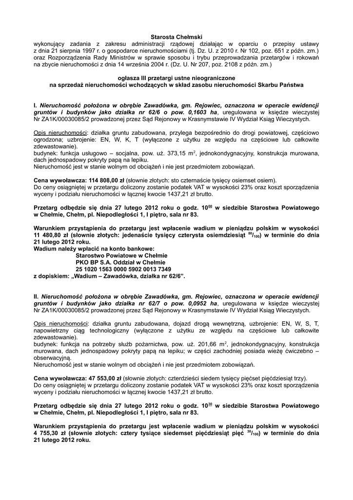 Starosta Chełmski wykonujący zadania z zakresu administracji rządowej działając w oparciu o przepisy ustawy z dnia 21 sierpnia 1997 r. o gospodarce nieruchomościami (tj. Dz. U. z 2010 r. Nr 102, poz. 651 z późn. zm.) oraz Rozporządzenia Rady Ministrów w sprawie sposobu i trybu przeprowadzania przetargów i rokowań na zbycie nieruchomości z dnia 14 września 2004 r. (Dz. U. Nr 207, poz. 2108 z późn. zm.) ogłasza III przetargi ustne nieograniczone na sprzedaż nieruchomości wchodzących w skład zasobu nieruchomości Skarbu Państwa I. Nieruchomość położona w obrębie Zawadówka, gm. Rejowiec, oznaczona w operacie ewidencji gruntów i budynków jako działka nr 62/6 o pow. 0,1603 ha, uregulowana w księdze wieczystej Nr ZA1K/00030085/2 prowadzonej przez Sąd Rejonowy w Krasnymstawie IV Wydział Ksiąg Wieczystych. Opis nieruchomości: działka gruntu zabudowana, przylega bezpośrednio do drogi powiatowej, częściowo ogrodzona; uzbrojenie: EN, W, K, T (wyłączone z użytku ze względu na częściowe lub całkowite zdewastowanie). budynek: funkcja usługowo – socjalna, pow. uż. 373,15 m 2, jednokondygnacyjny, konstrukcja murowana, dach jednospadowy pokryty papą na lepiku. Nieruchomość jest w stanie wolnym od obciążeń i nie jest przedmiotem zobowiązań. Cena wywoławcza: 114 808,00 zł (słownie złotych: sto czternaście tysięcy osiemset osiem). Do ceny osiągniętej w przetargu doliczony zostanie podatek VAT w wysokości 23% oraz koszt sporządzenia wyceny i podziału nieruchomości w łącznej kwocie 1437,21 zł brutto. Przetarg odbędzie się dnia 27 lutego 2012 roku o godz. 10 00 w siedzibie Starostwa Powiatowego w Chełmie, Chełm, pl. Niepodległości 1, I piętro, sala nr 83. Warunkiem przystąpienia do przetargu jest wpłacenie wadium w pieniądzu polskim w wysokości 11 480,80 zł (słownie złotych: jedenaście tysięcy czterysta osiemdziesiąt 80/100) w terminie do dnia 21 lutego 2012 roku. Wadium należy wpłacić na konto bankowe: Starostwo Powiatowe w Chełmie PKO BP S.A. Oddział w Chełmie 25 1020 1563 0000 5902 0013 7349 z dopiskiem: „Wadium – Zawadówka, działka nr 62/6”. II. Nieruchomość położona w obrębie Zawadówka, gm. Rejowiec, oznaczona w operacie ewidencji gruntów i budynków jako działka nr 62/7 o pow. 0,0952 ha, uregulowana w księdze wieczystej Nr ZA1K/00030085/2 prowadzonej przez Sąd Rejonowy w Krasnymstawie IV Wydział Ksiąg Wieczystych. Opis nieruchomości: działka gruntu zabudowana, dojazd drogą wewnętrzną, uzbrojenie: EN, W, S, T, napowietrzny ciąg technologiczny (wyłączone z użytku ze względu na częściowe lub całkowite zdewastowanie). budynek: funkcja na potrzeby służb pożarnictwa, pow. uż. 201,66 m 2, jednokondygnacyjny, konstrukcja murowana, dach jednospadowy pokryty papą na lepiku; w części zachodniej posiada wieżę ćwiczebno – obserwacyjną. Nieruchomość jest w stanie wolnym od obciążeń i nie jest przedmiotem zobowiązań. Cena wywoławcza: 47 553,00 zł (słownie złotych: czterdzieści siedem tysięcy pięćset pięćdziesiąt trzy). Do ceny osiągniętej w przetargu doliczony zostanie podatek VAT w wysokości 23% oraz koszt sporządzenia wyceny i podziału nieruchomości w łącznej kwocie 1437,21 zł brutto. Przetarg odbędzie się dnia 27 lutego 2012 roku o godz. 10 30 w siedzibie Starostwa Powiatowego w Chełmie, Chełm, pl. Niepodległości 1, I piętro, sala nr 83. Warunkiem przystąpienia do przetargu jest wpłacenie wadium w pieniądzu polskim w wysokości 4 755,30 zł (słownie złotych: cztery tysiące siedemset pięćdziesiąt pięć 30/100) w terminie do dnia 21 lutego 2012 roku. Wadium należy wpłacić na konto bankowe: Starostwo Powiatowe w Chełmie PKO BP S.A. Oddział w Chełmie 25 1020 1563 0000 5902 0013 7349 z dopiskiem: „Wadium – Zawadówka, działka nr 62/7”. III. Nieruchomość położona w obrębie Zawadówka, gm. Rejowiec, oznaczona w operacie ewidencji gruntów i budynków jako działka nr 62/8 o pow. 0,2296 ha, uregulowana w księdze wieczystej Nr ZA1K/00030085/2 prowadzonej przez Sąd Rejonowy w Krasnymstawie IV Wydział Ksiąg Wieczystych. Opis nieruchomości: niezabudowana działka gruntu stanowiąca wewnętrzną o szer. ok. 4 m; przylega bezpośrednio do drogi powiatowej. Nieruchomość jest w stanie wolnym od obciążeń i nie jest przedmiotem zobowiązań. drogę dojazdową Cena wywoławcza: 18 920,00 zł (słownie złotych: osiemnaście tysięcy dziewięćset dwadzieścia). Do ceny osiągniętej w przetargu doliczony zostanie podatek VAT w wysokości 23% oraz koszt sporządzenia wyceny i podziału nieruchomości w łącznej kwocie 1437,21 zł brutto. Przetarg odbędzie się dnia 27 lutego 2012 roku o godz. 11 00 w siedzibie Starostwa Powiatowego w Chełmie, Chełm, pl. Niepodległości 1, I piętro, sala nr 83. Warunkiem przystąpienia do przetargu jest wpłacenie wadium w pieniądzu polskim w wysokości 1 892,00 zł (słownie złotych: jeden tysiąc osiemset dziewięćdziesiąt dwa) w terminie do dnia 21 lutego 2012 roku. Wadium należy wpłacić na konto bankowe: Starostwo Powiatowe w Chełmie PKO BP S.A. Oddział w Chełmie 25 1020 1563 0000 5902 0013 7349 z dopiskiem: „Wadium – Zawadówka, działka nr 62/8”. IV. Nieruchomość położona w obrębie Zawadówka, gm. Rejowiec, oznaczona w operacie ewidencji gruntów i budynków jako działka nr 62/9 o pow. 0,2755 ha, uregulowana w księdze wieczystej Nr ZA1K/00030085/2 prowadzonej przez Sąd Rejonowy w Krasnymstawie IV Wydział Ksiąg Wieczystych. Opis nieruchomości: działka gruntu zabudowana, posiada bezpośredni dostęp do drogi powiatowej, częściowo ogrodzona, uzbrojenie: EN, W, S, T, CO (wyłączone z użytku ze względu na częściowe lub całkowite zdewastowanie). budynek: funkcja biurowo - usługowa, pow. uż. 391 m2, dwukondygnacyjny, konstrukcja murowana, ściany zewnętrzne z drewna, obite deskami, dach dwuspadowy pokryty blachą trapezową; po obu stronach budynku z