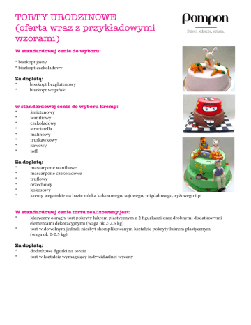 TORTY URODZINOWE (oferta wraz z przykładowymi wzorami) W standardowej cenie do wyboru: * biszkopt jasny * biszkopt czekoladowy Za dopłatą: * biszkopt bezglutenowy * biszkopt wegański w standardowej cenie do wyboru kremy: *śmietanowy *waniliowy *czekoladowy *straciatella *malinowy *truskawkowy *kawowy *toffi Za dopłatą: * mascarpone waniliowe * mascarpone czekoladowe *truflowy *orzechowy *kokosowy * kremy wegańskie na bazie mleka kokosowego, sojowego, migdałowego, ryżowego itp W standardowej cenie tortu realizowany jest: * klasyczny okrągły tort pokryty lukrem plastycznym z 2 figurkami oraz drobnymi dodatkowymi elementami dekoracyjnymi (waga ok 2-2,5 kg) * tort w dowolnym jednak niezbyt skomplikowanym kształcie pokryty lukrem plastycznym (waga ok 2-2,5 kg) Za dopłatą: * dodatkowe figurki na torcie * tort w kształcie wymagający indywidualnej wyceny PRZYKŁADOWE TORTY URODZINOWE
