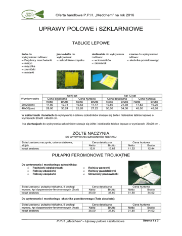 Oferta handlowa P.P.H. „Medchem” na rok 2016 UPRAWY POLOWE i SZKLARNIOWE TABLICE LEPOWE żółte do wykrywania i odłowu: • Połyśnicy marchwianki • mszyc • mączlika • ziemiórki • miniarki Wymiary tablic 20x20(cm) 40x30(cm) jasno-żółte do wykrywania: • szkodników rzepaku niebieskie do wykrywania i odłowu: • wciornastków • ziemiórek kpl 6 szt Cena detaliczna Cena hurtowa Netto Brutto Netto Brutto 11,80 12,74 10,62 11,47 28,00 30,24 25,20 27,22 czarne do wykrywania i odłowu: • skośnika pomidorowego kpl 12 szt Cena detaliczna Cena hurtowa Netto Brutto Netto Brutto 19,80 21,38 17,82 19,25 50,00 54,00 45,00 48,60 W szklarniach i tunelach do wykrywania i odłowu szkodników stosuje się żółte i niebieskie tablice lepowe o wymiarach 20x20 i 40x30 cm. Na plantacjach do wykrywania szkodników stosuje się żółte i niebieskie tablice lepowe o wymiarach 20x20 cm . ZÓŁTE NACZYNIA DO WYKRYWANIA SZKODNIKÓW RZEPAKU Skład zestawu:naczynie, osłona siatkowa, stojak koszt zestawu Cena detaliczna Netto Brutto 12,8 13,82 Cena hurtowa Netto Brutto 11,52 12,44 PUŁAPKI FEROMONOWE TRÓJKĄTNE Do wykrywania i monitoringu szkodników: • Pachówki strąkóweczki • Rolnicy zbożówki • Rolnicy czopówki Skład zestawu: pułapka trójkątna, 4 podłogi lepowe, kpl dyspenserów feromonowych (2szt) koszt zestawu • • • Rolnicy panewki Rolnicy gwoździówki Omacnicy prosowianki Cena detaliczna Netto Brutto 35,00 37,80 Cena hurtowa Netto Brutto 31,50 34,02 Do wykrywania i monitoringu skośnika pomidorowego (Tuta absoluta): Skład zestawu: pułapka trójkątna, 8 podłogi lepowe, kpl dyspenserów feromonowych (4szt) koszt zestawu Cena detaliczna Netto Brutto 35,00 37,80 P.P.H. „Medchem” – Uprawy polowe i szklarniowe Cena hurtowa Netto Brutto 31,50 34,02 Strona 1 z 3 Oferta handlowa P.P.H. „Medchem” na rok 2016 PUŁAPKI FEROMONOWE KOMINOWE Do monitoringu i odłowu szkodników: • Piętnówki kapustnicy Skład zestawu : pułapka kominowa komplet dyspenserów feromonowych (2szt) koszt zestawu Cena detaliczna Netto Brutto 50,50 54,54 Cena hurtowa Netto Brutto 45,45 49,09 Cena detaliczna Netto Brutto 45,00 48,60 Cena hurtowa Netto Brutto 40,50 43,74 Do monitoringu i odłowu szkodników: • Omacnicy prosowianki Skład zestawu : pułapka kominowa komplet dyspenserów feromonowych (2szt) koszt zestawu PUŁAPKI FEROMONOWE LEPOWE Do wykrywania i monitoringu szkodników: • Samców zachodniej stonki kukurydzianej Cena detaliczna Skład: 2 płachty lepowe 2 dyspensery feromonowe koszt zestawu Netto 31,00 Brutto 33,48 Cena hurtowa Netto 27,90 Brutto 30,13 Zestaw przezroczystych płacht lepowych z dyspenserami feromonowymi do monitorowania samców zachodniej stonki kukurydzianej. PUŁAPKI ZAPACHOWE LEPOWE Do wykrywania i monitoringu szkodników: • Samców oraz samic zachodniej stonki kukurydzianej Cena detaliczna Skład: 2 płachty lepowe 2 wabiki zapachowe koszt zestawu Netto 44,00 Brutto 47,52 Cena hurtowa Netto 39,60 Brutto 42,77 Zestaw żółtych płacht lepowych z wabikiemi zapachowymi do wykrywania i monitorowania populacji samców i samic zachodniej stonki kukurydzianej. PUŁAPKI ZAPACHOWA NA ŚMIETKĘ KAPUŚCIANĄ Do wykrywania: • śmietki kapuścianej Skład: pułapka, stojak, wabik (1szt) Koszt zestawu Cena detaliczna Netto Brutto 24,00 25,92 Cena hurtowa Netto Brutto 21,60 23,33 Zestaw zawiera jeden wabik który pozostaje aktywny przez 4-10 dni w zależności od warunków pogodowych. W celu monitorowania populacji szkodnika przez cały sezon wegetacyjny należy dokupić 5-7 wabików zapachowych (w przypadku wczesnych odmian) lub 13-14 wabików zapachowych (w przypadku późnych odmian). P.P.H. „Medchem” – Uprawy polowe i szklarniowe Strona 2 z 3 Oferta handlowa P.P.H. „Medchem” na rok 2016 ELEMENTY PUŁAPEK Zestawy dyspenserów (umożliwiający monitorowanie całego lotu motyla) Nazwa szkodnika Cena detaliczna Netto Brutto Omacnica prosowianka (2 szt.) 22,00 23,76 Pachówka strąkóweczka (2 szt.) 30,00 32,40 Piętnówka kapustnica (2 szt.) 40,00 43,20 Rolnica czopówka (2 szt.) 30,00 32,40 Rolnica gwoździówka (2 szt.) 30,00 32,40 Rolnica panewka (2 szt.) 30,00 32,40 Rolnica zbożówka (2 szt.) 30,00 32,40 Skośnik pomidorowy (1 szt.) 7,00 7,56 Zachodnia stonka kukurydziana (2 szt.) 24,00 25,92 Cena hurtowa Netto Brutto 19,80 21,38 27,00 29,16 36,00 38,88 27,00 29,16 27,00 29,16 27,00 29,16 27,00 29,16 6,30 6,80 21,60 23,33 Wabiki zapachowe Zachodnia stonka kukurydziana (2 szt) Śmietka kapuściana (1 szt) 24,00 7,00 25,92 7,56 21,60 6,30 23,33 6,80 Preparat owadobójczy zalecany do pułapek kominowych Pasek owadobójczy 1,50 1,62 1,35 1,46 Inne elementy Rodzaj: Pułapka trójkątna (1szt) Pułapka kominowa (1szt) Kominowa import (1szt) Płachta lepowa żółta 25x35 (2szt) Płachta lepowa przezroczysta 25x35 (2szt.) Wkłady lepowe (4szt) Wkłady lepowe (10szt) Klej owadolep (1l) Cena detaliczna Netto Brutto 5,50 6,77 23,00 28,29 33,00 40,59 13,00 14,04 12,00 12,96 8,00 8,64 17,00 18,36 40,00 49,20 Cena hurtowa Netto Brutto 4,95 6,09 20,70 25,46 29,70 36,53 11,70 12,64 10,80 11,66 7,20 7,78 15,30 16,52 36,00 44,28 Ceny liczone w złotych. Oferta ważna do wyczerpania zapasów Informujemy ,że istnieje możliwość składania zamówień na pułapki oraz dyspensery feromonowe nie wymienione w powyższej ofercie. Czas realizacji takiego zamówienia jest dłuższy i może wynieść ok. miesiąca. Zamówienia prosimy składać e-mailem, faksem, listownie lub przez sklep internetowy: tel: (22) 750-72-36 faks: (22) 398-77-07 email: [email protected] sklep internetowy: http://sklep.medchem.pl adres firmy: P.P.H „MEDCHEM” ul. Słoneczna 90 Stara Iwiczna 05-500 Piaseczno Druk zamówienia w formie pliku xls jest dostępny na naszej stronie internetowej. tel. kom.: 501-25-25-00; 504-12-77-13; e-mail: [email protected] WWW: http://www.medchem.pl Opublikowane powyżej informacje nie są ofertą w rozumieniu przepisów kodeksu cywilnego. P.P.H. „Medc