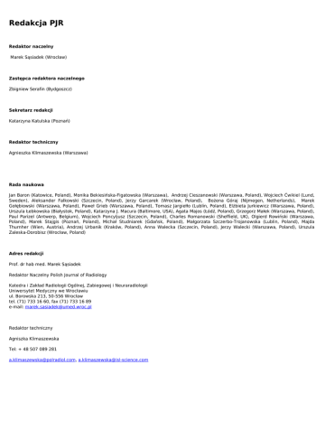 Redakcja PJR Redaktor naczelny Marek Sąsiadek (Wrocław) Zastępca redaktora naczelnego Zbigniew Serafin (Bydgoszcz) Sekretarz redakcji Katarzyna Katulska (Poznań) Redaktor techniczny Agnieszka Klimaszewska (Warszawa) Rada naukowa Jan Baron (Katowice, Poland), Monika Bekiesińska-Figatowska (Warszawa), Andrzej Cieszanowski (Warszawa, Poland), Wojciech Ćwikiel (Lund, Sweden), Aleksander Falkowski (Szczecin, Poland), Jerzy Garcarek (Wrocław, Poland), Bożena Góraj (Nijmegen, Netherlands), Marek Gołębiowski (Warszawa, Poland), Paweł Grieb (Warszawa, Poland), Tomasz Jargiełło (Lublin, Poland), Elżbieta Jurkiewicz (Warszawa, Poland), Urszula Łebkowska (Białystok, Poland), Katarzyna J. Macura (Baltimore, USA), Agata Majos (Łódź, Poland), Grzegorz Małek (Warszawa, Poland), Paul Parizel (Antwerp, Belgium), Wojciech Poncyljusz (Szczecin, Poland), Charles Romanowski (Sheffield, UK), Olgierd Rowiński (Warszawa, Poland), Marek Stajgis (Poznań, Poland), Michał Studniarek (Gdańsk, Poland), Małgorzata Szczerbo-Trojanowska (Lublin, Poland), Majda Thurnher (Wien, Austria), Andrzej Urbanik (Kraków, Poland), Anna Walecka (Szczecin, Poland), Jerzy Walecki (Warszawa, Poland), Urszula Zaleska-Dorobisz (Wrocław, Poland) Adres redakcji Prof. dr hab med. Marek Sąsiadek Redaktor Naczelny Polish Journal of Radiology Katedra i Zakład Radiologii Ogólnej, Zabiegowej i Neuraradiologii Uniwersytet Medyczny we Wrocławiu ul. Borowska 213, 50-556 Wrocław tel. (71) 733 16 60, fax (71) 733 16 89 e-mail: [email protected] Redaktor techniczny Agniszka Klimaszewska Tel: + 48 507 089 281 [email protected], [email protected] Wydawca International Scientific Literature, Inc., 361 Forest Line., Smithtown, NY 11787 U.S.A. p: +1 (516) 874 4341 f: +1 (646) 291 2185 [email protected] Uprzejmie informujemy, że PLTR, w porozumieniu z redakcją Polish Journal of Radiology, zawarł umowę z Wyższą Szkołą Ekonomiczną w Białymstoku na odpłatne udzielanie licencji na recenzowane artykuły opublikowane w Polish Journal of Radiology, w ramach projektu "Organizacja i wdrożenie ogólnopolskiego elektronicznego systemu komercjalizacji recenzowanych prac naukowych przy Wyższej Szkole Ekonomicznej w Białymstoku" nr POIG.02.03.02-00-038/09 w ramach Priorytetu 2., Działania 2.3. Programu Operacyjnego Innowacyjna Gospodarka. Dzięki umowie PLTR otrzymuje środki finansowe z projektu za licencje na artykuły w kolejnych numerach PJR, a równocześnie artykuły z PJR umieszczane są w specjalnej elektronicznej bibliotece, co daje szanse na dotarcie treści tych artykułów do szerszego grona czytelników. Powered by TCPDF (www.tcpdf.org)