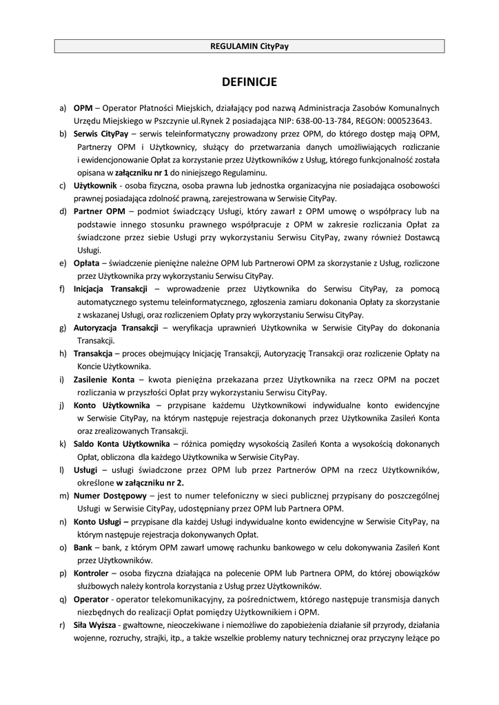 REGULAMIN CityPay DEFINICJE a) OPM – Operator Płatności Miejskich, działający pod nazwą Administracja Zasobów Komunalnych Urzędu Miejskiego w Pszczynie ul.Rynek 2 posiadająca NIP: 638‐00‐13‐784, REGON: 000523643. b) Serwis CityPay – serwis teleinformatyczny prowadzony przez OPM, do którego dostęp mają OPM, Partnerzy OPM i Użytkownicy, służący do przetwarzania danych umożliwiających rozliczanie i ewidencjonowanie Opłat za korzystanie przez Użytkowników z Usług, którego funkcjonalność została opisana w załączniku nr 1 do niniejszego Regulaminu. c) Użytkownik ‐ osoba fizyczna, osoba prawna lub jednostka organizacyjna nie posiadająca osobowości prawnej posiadająca zdolność prawną, zarejestrowana w Serwisie CityPay. d) Partner OPM – podmiot świadczący Usługi, który zawarł z OPM umowę o współpracy lub na podstawie innego stosunku prawnego współpracuje z OPM w zakresie rozliczania Opłat za świadczone przez siebie Usługi przy wykorzystaniu Serwisu CityPay, zwany również Dostawcą Usługi. e) Opłata – świadczenie pieniężne należne OPM lub Partnerowi OPM za skorzystanie z Usług, rozliczone przez Użytkownika przy wykorzystaniu Serwisu CityPay. f) Inicjacja Transakcji – wprowadzenie przez Użytkownika do Serwisu CityPay, za pomocą automatycznego systemu teleinformatycznego, zgłoszenia zamiaru dokonania Opłaty za skorzystanie z wskazanej Usługi, oraz rozliczeniem Opłaty przy wykorzystaniu Serwisu CityPay. g) Autoryzacja Transakcji – weryfikacja uprawnień Użytkownika w Serwisie CityPay do dokonania Transakcji. h) Transakcja – proces obejmujący Inicjację Transakcji, Autoryzację Transakcji oraz rozliczenie Opłaty na Koncie Użytkownika. i) Zasilenie Konta – kwota pieniężna przekazana przez Użytkownika na rzecz OPM na poczet rozliczania w przyszłości Opłat przy wykorzystaniu Serwisu CityPay. j) Konto Użytkownika – przypisane każdemu Użytkownikowi indywidualne konto ewidencyjne w Serwisie CityPay, na którym następuje rejestracja dokonanych przez Użytkownika Zasileń Konta oraz zrealizowanych Transakcji. k) Saldo Konta Użytkownika – różnica pomiędzy wysokością Zasileń Konta a wysokością dokonanych Opłat, obliczona dla każdego Użytkownika w Serwisie CityPay. l) Usługi – usługi świadczone przez OPM lub przez Partnerów OPM na rzecz Użytkowników, określone w załączniku nr 2. m) Numer Dostępowy – jest to numer telefoniczny w sieci publicznej przypisany do poszczególnej Usługi w Serwisie CityPay, udostępniany przez OPM lub Partnera OPM. n) Konto Usługi – przypisane dla każdej Usługi indywidualne konto ewidencyjne w Serwisie CityPay, na którym następuje rejestracja dokonywanych Opłat. o) Bank – bank, z którym OPM zawarł umowę rachunku bankowego w celu dokonywania Zasileń Kont przez Użytkowników. p) Kontroler – osoba fizyczna działająca na polecenie OPM lub Partnera OPM, do której obowiązków służbowych należy kontrola korzystania z Usług przez Użytkowników. q) Operator ‐ operator telekomunikacyjny, za pośrednictwem, którego następuje transmisja danych niezbędnych do realizacji Opłat pomiędzy Użytkownikiem i OPM. r) Siła Wyższa ‐ gwałtowne, nieoczekiwane i niemożliwe do zapobieżenia działanie sił przyrody, działania wojenne, rozruchy, strajki, itp., a także wszelkie problemy natury technicznej oraz przyczyny leżące po Regulamin dla Użytkownika CityPay stronie OPM, Partnera OPM lub Operatora, niezależne od OPM lub Użytkownika, uniemożliwiające spełnienie świadczenia. s) Raport – informacja dotycząca Opłat dokonanych przez Użytkownika, udostępniana Użytkownikowi za pomocą Serwisu CityPay poprzez stronę internetową. t) Regulamin – niniejszy regulamin. u) Umowa – umowa między Użytkownikiem i OPM zawarta na podstawie niniejszego Regulaminu. §1 POSTANOWIENIA OGÓLNE 1. Niniejszy Regulamin określa zasady świadczenia usług, w tym usług świadczonych drogą elektroniczną, przez OPM. 2. OPM jest związana postanowieniami ustawy z dnia 16 listopada 2000 r. o przeciwdziałaniu wprowadzaniu do obrotu finansowego wartości majątkowych pochodzących z nielegalnych lub nieujawnionych źródeł oraz o przeciwdziałaniu finansowaniu terroryzmu. §2 RODZAJE I ZAKRES USŁUG 1. OPM świadczy następujące usługi o charakterze elektronicznym: 1.1 rejestracja w Serwisie CityPay, 1.2 przyjmowanie Opłat, 1.3 udostępnianie Raportów, 1.4 przyjmowanie zgłoszeń, o których mowa w § 11 pkt 1, 1.5 udostępnienie i prowadzenie Serwisu CityPay, 1.6 zakładanie i prowadzenie Kont Użytkowników w Serwisie CityPay, 1.7 udostępnienie Użytkownikowi wglądu do Raportów w Serwisie CityPay, 1.8 udostępnianie za pomocą Serwisu CityPay informacji dotyczących Usług OPM ora Partnerów OPM, 1.9 udostępnienie niniejszego Regulaminu. 2. Korzystanie z usług świadczonych przez OPM i Partnerów OPM jest możliwe jedynie pod warunkiem akceptacji niniejszego Regulaminu. 3. Odstąpienie lub wypowiedzenie Umowy jest równoznaczne z utratą możliwości korzystania z Serwisu CityPay. 4. OPM świadczy usługi określone w pkt 1 na podstawie niniejszego Regulaminu. 5. Jeżeli możliwość korzystania z Usług świadczonych przez OPM lub Partnera OPM lub możliwość dokonania Opłat za te Usługi jest uzależniona od spełnienia przez Użytkownika dodatkowych wymagań określonych przez OPM lub Partnera OPM, Użytkownik jest zobowiązany spełnić takie wymagania. §3 UŻYTKOWNICY 1. Korzystanie przez Użytkowników z usług określonych w § 2 pkt 1. wymaga rejestracji w Serwisie CityPay. Strona 2 z 9 Regulamin dla Użytkownika CityPay 2. Korzystanie przez Użytkowników z Serwisu CityPay jest możliwe dla telefonów posiadających identyfikacja numeru Użytkownika (MSISDN). 3. Rejestracja Użytkowników następuje poprzez stronę internetową Serwisu CityPay. 4. W celu rejestracji konieczne jest złożenie przez Użytkownika oświadczenia 