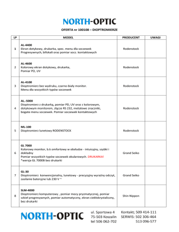 OFERTA nr 100108 – DIOPTROMIERZE LP MODEL PRODUCENT 1 AL-4400 Ekran dotykowy, drukarka, spec. menu dla soczewek Progresywnych, bifokali oraz pomiar socz. kontaktowych Rodenstock 2 AL-4600 Kolorowy ekran dotykowy, drukarka, Pomiar PD, UV Rodenstock 3 AL-4100 Dioptromierz bez wydruku, czarno-biały monitor. Menu dla wszystkich typów soczewek Rodenstock 4 5 AL.-5000 Dioptromierz z drukarką, pomiar PD, UV oraz z kolorowym, dotykowym monitorem, złącze RS 232, metalowe znaczniki, bogate menu soczewek. Pomiar soczewek kontaktowych ML-100 Dioptromierz lunetowy RODENSTOCK Rodenstock Rodenstock 6 GL 7000 Kolorowy monitor, b.k omfortowy w obsłudze - intuicyjny, szybki i dokładny Pomiar wszystkich typów soczewek okularowych. DRUKARKA! *wersja GL 7000B bez drukarki Grand Seiko 7 GL-30 Dioptromierz konwencjonalny, lunetowy - precyzyjny wyraźny odczyt, zasilanie bateryjne lub 230 V ~ Grand Seiko 8 SLM-4000 Dioptromierz komputerowy , pomiar mocy pryzmatycznej, pomiar szkieł progresywnych, pomiar automatyczny, ekran ciekłokrystaliczny, bez drukarki Shin-Nippon UWAGI 9 SLM-5000 Dioptromierz komputerowy, pomiar mocy pryzmatycznej, pomiar szkieł progresywnych, pomiar automatyczny, ekran ciekłokrystaliczny Shin-Nippon 10 SLM-6000 Dioptromierz komputerowy , pomiar mocy pryzmatycznej, pomiar szkieł progresywnych, pomiar automatyczny, ekran ciekłokrystaliczny uchylny, pomiar PD, pomiar UV Shin-Nippon 11 LM-25 Dioptromierz lunetowy z odczytem wewnętrznym, obraz krzyża z koroną Shin-Nippon 12 LM-15 Dioptromierz lunetowy, bateryjny z odczytem wewnętrznym, oświetlenie LED o trwałości 300 lat, obraz krzyża z korona Shin-Nippon 13 LM-15C Dioptromierz lunetowy, bateryjny z odczytem zewnętrznym, oświetlenie LED o trwałości 300 lat, obraz korona Shin-Nippon