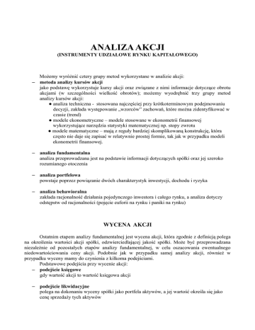 ANALIZA AKCJI (INSTRUMENTY UDZIAŁOWE RYNKU KAPITAŁOWEGO) Możemy wyróżnić cztery grupy metod wykorzystane w analizie akcji: – metoda analizy kursów akcji jako podstawę wykorzystuje kursy akcji oraz związane z nimi informacje dotyczące obrotu akcjami (w szczególności wielkość obrotów); możemy wyodrębnić trzy grupy metod analizy kursów akcji: ● analiza techniczna - stosowana najczęściej przy krótkoterminowym podejmowaniu decyzji, zakłada występowanie „wzorców” zachowań, które można zidentyfikować w czasie (trend) ● modele ekonometryczne – modele stosowane w ekonometrii finansowej wykorzystujące narzędzia statystyki matematycznej np. stopy zwrotu ● modele matematyczne – mają z reguły bardziej skomplikowaną konstrukcję, która często nie daje się zapisać w relatywnie prostej formie, tak jak w przypadku modeli ekonometrii finansowej. – analiza fundamentalna analiza przeprowadzana jest na podstawie informacji dotyczących spółki oraz jej szeroko rozumianego otoczenia – analiza portfelowa powstaje poprzez powiązanie dwóch charakterystyk inwestycji, dochodu i ryzyka – analiza behawioralna zakłada racjonalność działania pojedynczego inwestora i całego rynku, a analiza dotyczy odstępstw od racjonalności (pojęcie euforii na rynku i paniki na rynku) WYCENA AKCJI Ostatnim etapem analizy fundamentalnej jest wycena akcji, która zgodnie z definicją polega na określenia wartości akcji spółki, odzwierciedlającej jakość spółki. Może być przeprowadzana niezależnie od pozostałych etapów analizy fundamentalnej, w celu oszacowania ewentualnego niedowartościowania ceny akcji. Podobnie jak w przypadku samej analizy akcji, również w przypadku wyceny mamy do czynienia z kilkoma podejściami. Podstawowe podejścia przy wycenie akcji: – podejście księgowe gdy wartość akcji to wartość księgowa akcji – podejście likwidacyjne polega na dokonaniu wyceny spółki jako portfela aktywów, a jej wartość określa się jako cenę sprzedaży tych aktywów – podejście opcyjne w tym przypadku wykorzystuje się pojęcie opcji (instrumentu pochodnego służącego m. in. Do zabezpieczenia się przed ryzykiem), wówczas kapitał własny może być traktowany jako pozycja długa w opcji call, dług – jako suma pozycji długiej w instrumencie dłużnym wolnym od ryzyka i opcji krótkiej w opcji put wystawionej na wartość aktywów spółki – podejście mnożnikowe jest to metoda wyceny względnej, wycena akcji danej spółki powstaje na podstawie akcji innych spółek, które uznawane są za spółki podobne dodanej – podejście dochodowe jest najczęściej stosowaną metodą wyceny opartą o metodę zdyskontowanych przepływów pieniężnych, którą wykorzystywaliśmy przy wycenie obligacji. ∞ Ct P=∑ t t =1 1r gdzie r – wymagana stopa zwrotu (inaczej dochodu) inwestora Trudność wyceny to pojawiająca się we wzorze nieskończoność, czyli bezterminowość akcji, dlatego n Ct RV n P=∑ t 1r n t =1 1r gdzie RV n - wartość rezydualna po n okresach Kolejnym kluczowym problemem jest określenie, co rozumiemy przez pojęcie przepływu pieniężnego z tytułu posiadania akcji. Są co najmniej trzy możliwości: • model zdyskontowanych dywidend • model zdyskontowanych wolnych przepływów pieniężnych • model zysku rezydualnego MODEL ZDYSKONTOWANYCH DYWIDEND W tym modelu przepływ pieniężny z tytułu posiadania akcji utożsamia się z dywidendami, a zatem otrzymujemy zależność: ∞ Dt P=∑ t t =1 1r gdzie Dt - dywidenda na 1 akcję otrzymana w okresie t ● MODEL STAŁEGO TEMPA WZROSTU DYWIDENDY (MODEL GORDONA) jest to najprostszy i najczęściej stosowany wariant modelu zdyskontowanych dywidend. Zakłada się w nim, że stopa zwrotu dywidendy jest i pozostanie stała na zawsze ze stałą stopą wzrostu D1 D 1g P= = 0 r− g r− g gdzie P - wartość akcji, g - stopa wzrostu dywidendy, D1 - dywidenda wypłacona w następnym roku, D 0 - ostatnio wypłacona dywidenda, r - wymagana stopa zwrotu dodatkowo g =EOF∗ f gdzie EOF - stopa zwrotu z kapitału własnego, jako iloraz zysku zatrzymania i zysku netto f - wskaźnik zatrzymania, określony ● WARIANT DWUETAPOWY MODELU GORDONA przez M lat zakłada się wzrost dywidendy w stałym tempie tempie g g 0 , a następnie już tylko w ● MODEL H - WARIANT MODELU GORDONA przez początkowy okres stopa spada liniowo od g 0 do g ,a następnie rośnie w stałym g D 1g D0 H g 0 −g P= 0 r− g gdzie H jest połową lat okresu liniowego spadku