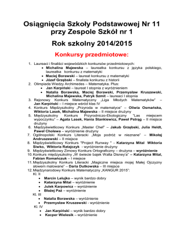 Osiągnięcia Szkoły Podstawowej Nr 11 przy Zespole Szkół nr 1 Rok szkolny 2014/2015 Konkursy przedmiotowe: 1. Laureaci i finaliści wojewódzkich konkursów przedmiotowych: Michalina Majewska – laureatka konkursu z języka polskiego, laureatka konkursu z matematyki Maciej Borawski – laureat konkursu z matematyki Józef Grzębski – finalista konkursu z historii 2. Olimpiada Wiedzy Archimedes – Matematyka. Plus: Jan Karpiński – laureat I stopnia z wyróżnieniem Natalia Borawska, Maciej Borawski, Przemysław Kruszewski, Michalina Majewska, Patryk Szmit – laureaci I stopnia 3. Rejonowy Konkurs Matematyczny „Liga Młodych Matematyków” – Jan Karpiński – I miejsce wśród klas IV 4. Konkurs Międzyszkolny „Przyroda w matematyce” – Oliwia Osmańska, Wiktoria Lasek, Michalina Majewska – II miejsce drużyny 5. Międzyszkolny Konkurs Przyrodniczo-Ekologiczny ”Las miejscem wypoczynku” – Agata Lasek, Hania Stankiewicz, Paweł Pstrąg – II miejsce drużyny 6. Międzyświetlicowy Konkurs „Master Chef” – Jakub Grzębski, Julia Heldt, Paweł Cholewa – wyróżnienie drużyny 7. Ogólnopolski Konkurs Literacki „Moja podróż w nieznane” – Mikołaj Andruszewski – II miejsce 8. Międzyświetlicowy Konkurs "Project Runway " - Katarzyna Mital Wiktoria Siwko, Wiktoria Ratajczyk - wyróżnienie drużyny 9. Międzyświetlicowy Zimowy Konkurs Ortograficzny – drużyna – wyróżnienie 10. Konkurs międzyszkolny „W świecie bajek Walta Disney’a” – Katarzyna Mital, Fabian Romańczuk – I miejsce 11. Międzyszkolny Konkurs Literacki „Magiczne miejsca mojej Małej Ojczyzny słowem malowane” – Daria Dutkowska – III miejsce 12. Międzynarodowy Konkurs Matematyczny „KANGUR 2015”: Kl. II Marcin Lelujko – wynik bardzo dobry Katarzyna Mital – wyróżnienie Julek Karpowicz – wyróżnienie Błażej Paź – wyróżnienie Kl. III Natalia Borawska – wyróżnienie Przemysław Kruszewski - wyróżnienie Kl. IV Jan Karpiński – wynik bardzo dobry Kacper Wielesik – wyróżnienie Kl. V Emilia Bobrowicz – wyróżnienie Natalia Gałczyk – wyróżnienie Kl. VI Michalina Majewska – wynik bardzo dobry Maciej Borawski – wyróżnienie 13. XIX edycja Konkursu na selektywną zbiórkę odpadów w placówkach oświatowych – III miejsce; wyróżnienie od Fundacji Recal za zbiórkę puszek aluminiowych 14. Konkurs międzyszkolny „Mistrz Łamigłówek Matematycznych” – drużyna w składzie: Jan Karpiński, Emilia Bobrowicz, Michalina Majewska – III miejsce 15. Ogólnopolskie Dyktando Szkolne: Hania Stankiewicz – tytuł laureata – III miejsce w Polsce Magda Jarocka – tytuł laureata – VI miejsce w Polsce Natalka Borawska – tytuł laureata – VII miejsce w Polsce Emilka Cackowska – wyróżnienie 16. Ogólnopolski konkurs wiedzy matematycznej „Synapsik” – Patrycja Sowa – VI miejsce w Polsce Maciej Batko – VI miejsce w Polsce Laura van Ieperen – VII miejsce w Polsce Julia Piechowiak – VIII miejsce w Polsce Wiktor Szczech – IX miejsce w Polsce Lidia Prus – X miejsce w Polsce Konkursy artystyczne: 1. II Międzyszkolny Konkurs Kolęd i Pastorałek dla szkół podstawowych – Michalina Majewska, Maja Sitkowska, Katarzyna Mital, Aleksandra Mikłosz, Karina Czurak i Wiktoria Nowicka– I miejsce w kategorii zespoły wokalne Amelia Kęska – I miejsce w kategorii soliści 2. Międzyszkolny konkurs plastyczny „Najwyższa wieża po prawej stronie Wisły”: Amelia Częścik – nagroda Julek Karpowicz, Emilia Bobrowicz – wyróżnienie 3. Międzyszkolny Konkurs Plastyczny „Razem się bawimy, razem się uczymy” – Amelia Siwielec – nagroda główna 4. Ogólnopolski Turniej Tańca Sportowego „Pomosty” – Wiktoria Szymańska – I miejsce 5. Powiatowy Konkurs Piosenki Patriotycznej „Wyśpiewajmy naszą historię” – zespół „Świetliki z 11-stki” – Michalina Majewska, Kornelia Sowa, Wiktoria Literska, Zuzanna Miciak – I miejsce 6. Międzyszkolny Konkurs Plastyczny „Czyste wody – zdrowe ryby” – Piotr Sarapuk – III miejsce 7. Międzyszkolny Festiwal Tańca – zespół Mażoretki – nagroda główna w kategorii „Choreografia tańca” 8. Międzyszkolny konkurs recytatorski „Zdrowie w poezji dziecięcej” – Maja Czurak – I miejsce 9. Otwarte Mistrzostwa Mażoretek Polski Północnej – zespół Mażoretek – I miejsce w kategorii BATON 10. Międzyszkolny Konkurs Fotograficzny „Magiczne miejsca mojej Małej Ojczyzny” – Kinga Wiczyńska – II miejsce 11. Ogólnopolski konkurs plastyczny „Skrzydlaty eksperyment Ziemi” – Piotr Sarapuk – II miejsce 12. Międzyszkolny konkurs piosenki żołnierskiej „Artystyczne manewry” – Aleksandra Mikłosz – I miejsce; Zespół „Świetliki z 11-stki” – I miejsce 13. Międzyszkolny konkurs plastyczny „Zielona energia na Żuławach”: Paweł Cholewa – I miejsce Kasia Mital – II miejsce 14. Miejski konkurs plastyczny „Miasto w formie” – Klaudia Korkuć - wyróżnienie Zawody sportowe: 1. XXIX MIMS w indywidualnych jesiennych biegach przełajowych: Katarzyna Mital - III miejsce Agata Kamińska – IV miejsce Filip Ościłowski – III miejsce Dawid Klemens – III miejsce Wiktor Kiełczewski – III miejsce Bartek Mikołajczyk – IV miejsce Drużyna dziewcząt - III miejsce, drużyna chłopców - I miejsce 2. V Tomita Cup. Mikołajkowe Zawody w Judo - Szymon Częczek – II miejsce 3. Ogólnopolskie Jubileuszowe Jesienne Zawody Pływackie: Julia Borczak – II miejsce na dystansie 50 m stylem dowolnym, II miejsce na dystansie 50 m stylem grzbietowym Jan Stosik –I miejsce na dystansie 50 m stylem dowolnym, II miejsce na dystansie 50 m stylem grzbietowym 4. XXIX MIMS w short tracku: Oliwier Kurnicki – I miejsce na dystansie 444 m, I miejsce na dystansie 222 m, I miejsce w sztafecie na dystansie 1000 m Piotr Wierzbowski – III miejsce na dystansie 444 m, III miejsce na dystansie 222 m, I miejsce w szt