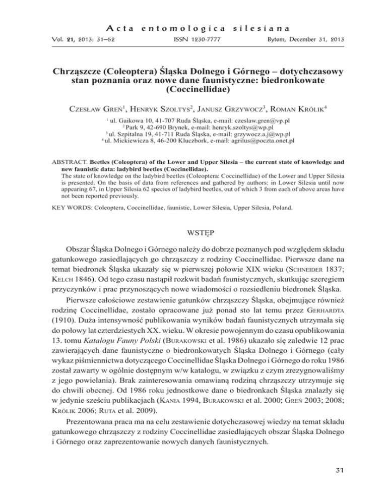 Acta entomologica silesiana Vol. 21, 2013: 31–52 ISSN 1230-7777 Bytom, December 31, 2013 Chrząszcze (Coleoptera) Śląska Dolnego i Górnego – dotychczasowy stan poznania oraz nowe dane faunistyczne: biedronkowate (Coccinellidae) Czesław Greń1, Henryk Szołtys2, Janusz Grzywocz3, Roman Królik4 ul. Gaikowa 10, 41-707 Ruda Śląska, e-mail: [email protected] 2 Park 9, 42-690 Brynek, e-mail: [email protected] 3 ul. Szpitalna 19, 41-711 Ruda Śląska, e-mail: [email protected] 4 ul. Mickiewicza 8, 46-200 Kluczbork, e-mail: [email protected] 1 ABSTRACT. Beetles (Coleoptera) of the Lower and Upper Silesia – the current state of knowledge and new faunistic data: ladybird beetles (Coccinellidae). The state of knowledge on the ladybird beetles (Coleoptera: Coccinellidae) of the Lower and Upper Silesia is presented. On the basis of data from references and gathered by authors: in Lower Silesia until now appearing 67, in Upper Silesia 62 species of ladybird beetles, out of which 3 from each of above areas have not been reported previously. KEY WORDS: Coleoptera, Coccinellidae, faunistic, Lower Silesia, Upper Silesia, Poland. WSTĘP Obszar Śląska Dolnego i Górnego należy do dobrze poznanych pod względem składu gatunkowego zasiedlających go chrząszczy z rodziny Coccinellidae. Pierwsze dane na temat biedronek Śląska ukazały się w pierwszej połowie XIX wieku (Schneider 1837; Kelch 1846). Od tego czasu nastąpił rozkwit badań faunistycznych, skutkując szeregiem przyczynków i prac przynoszących nowe wiadomości o rozsiedleniu biedronek Śląska. Pierwsze całościowe zestawienie gatunków chrząszczy Śląska, obejmujące również rodzinę Coccinellidae, zostało opracowane już ponad sto lat temu przez Gerhardta (1910). Duża intensywność publikowania wyników badań faunistycznych utrzymała się do połowy lat czterdziestych XX. wieku. W okresie powojennym do czasu opublikowania 13. tomu Katalogu Fauny Polski (Burakowski et al. 1986) ukazało się zaledwie 12 prac zawierających dane faunistyczne o biedronkowatych Śląska Dolnego i Górnego (cały wykaz piśmiennictwa dotyczącego Coccinellidae Śląska Dolnego i Górnego do roku 1986 został zawarty w ogólnie dostępnym w/w katalogu, w związku z czym zrezygnowaliśmy z jego powielania). Brak zainteresowania omawianą rodziną chrząszczy utrzymuje się do chwili obecnej. Od 1986 roku jednostkowe dane o biedronkach Śląska znalazły się w jedynie sześciu publikacjach (Kania 1994, Burakowski et al. 2000; Greń 2003; 2008; Królik 2006; Ruta et al. 2009). Prezentowana praca ma na celu zestawienie dotychczasowej wiedzy na temat składu gatunkowego chrząszczy z rodziny Coccinellidae zasiedlających obszar Śląska Dolnego i Górnego oraz zaprezentowanie nowych danych faunistycznych. 31 Acta ent. siles. 21, 2013 Bytom, December 31, 2013 MATERIAŁ I METODY W prezentowanej pracy wykorzystano oryginalne materiały własne autorów, jak również przekazane przez naszych kolegów: Artura Berezowskiego, Adama Bziuka, Andrzeja Mrowickiego, Grzegorza Chowańca, Krzysztofa Karwowskiego, Mirosława Brawera, M. Włodarczyka, Waldemara Żyłę, Tadeusza Bziuka, Tomasza Krasnopolskiego, Tomasza Wróbla, za co im w tym miejscu serdecznie dziękujemy. Oryginalne materiały zostały zebrane w latach od 1979 do 2012 przy użyciu czerpaka, odłowów na światło oraz, najczęściej, metodą „na upatrzonego”. Okazy dowodowe znajdują się w zbiorach autorów. Podano również wcześniejsze dane literaturowe. W Katalogu Fauny Polski (Burakowski et al. 1986) zestawiono całość piśmiennictwa, które ukazało się do momentu jego wydania, w związku z tym ograniczono się do cytowania katalogu, a nie poszczególnych prac z tego okresu. W opracowaniu przyjęto granice Śląska Dolnego i Górnego za Katalogiem Fauny Polski za wyjątkiem północnej granicy Śląska Dolnego. Na północy Bory Dolnośląskie dochodzą do Żagania, będąc jednocześnie granicą Śląska Dolnego, natomiast w KFP omawiana granica przebiega przez północną część Borów Dolnośląskich, włączając ich północny skrawek do Niziny Wielkopolsko-Kujawskiej, co jest ewidentnym błędem (jeszcze część kwadratu UTM WT21 obejmuje Bory Dolnośląskie). Ponieważ w niniejszej pracy wszystkie okazy z metryką „Żagań, Bory Dolnośląskie [WT21]” były odławiane w Borach Dolnośląskich (na południe od Żagania) przyporządkowano je do krainy Śląska Dolnego. Liczbę egzemplarzy z poszczególnych stanowisk i dat podawano tylko w przypadku, gdy w zbiorze znajduje się więcej niż jeden egzemplarz z tymi samymi danymi. Nomenklaturę i układ systematyczny przyjęto za Kovář (2007). Kolejność rodzajów w wykazie uszeregowano zgodnie z układem systematycznym, a podrodzaje i gatunki alfabetycznie. W wykazie użyto następujących symboli i skrótów: * – nowy dla krainy AB – Artur Berezowski, ABz – Adam Bziuk, AM – Andrzej Mrowicki, CG – Czesław Greń, GC – Grzegorz Chowaniec, HS – Henryk Szołtys, AG – Adam Grzywocz, JG – Janusz Grzywocz, NG – Nina Grzywocz, KK – Krzysztof Karwowski, MB – Mirosław Brawer, MW – M. Włodarczyk, RK – Roman Królik, WŻ – Waldemar Żyła, TB – Tadeusz Bziuk, TK – Tomasz Krasnopolski, TW – Tomasz Wróbel. Wyniki W trakcie prowadzonych badań na obszarze Śląska Dolnego i Górnego odłowiono 1560 chrząszczy reprezentujących 59 gatunków z rodziny Coccinellidae (Śląsk Dolny 40 gatunków, Śląsk Górny 56). Dla każdej z krain wykazano po trzy nienotowane wcześniej z ich obszaru gatunki, dla Śląska Górnego: Ceratomegilla notata, C. undecimnotata, Coccinella hieroglyphica, dla Śląska Dolnego: Harmonia axyridis, Myzia oblongoguttata, Stethorus pusillus. Łącznie na terenie Śląska Dolnego stwierdzono dotąd występowanie 67. gatunków z rodziny Coccinellidae (89,3 % krajowej fauny), a na terenie Śląska Górnego 62 gatunki (82,7 % krajowej fauny). 32 Acta ent. siles. 21, 20