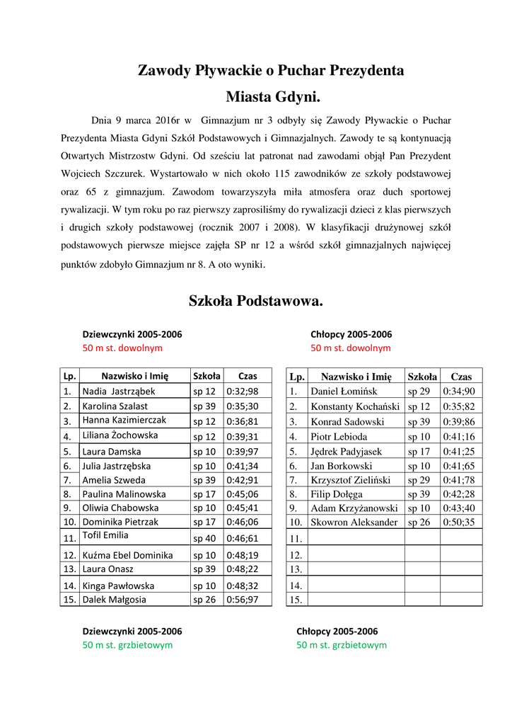 Zawody Pływackie o Puchar Prezydenta Miasta Gdyni. Dnia 9 marca 2016r w Gimnazjum nr 3 odbyły się Zawody Pływackie o Puchar Prezydenta Miasta Gdyni Szkół Podstawowych i Gimnazjalnych. Zawody te są kontynuacją Otwartych Mistrzostw Gdyni. Od sześciu lat patronat nad zawodami objął Pan Prezydent Wojciech Szczurek. Wystartowało w nich około 115 zawodników ze szkoły podstawowej oraz 65 z gimnazjum. Zawodom towarzyszyła miła atmosfera oraz duch sportowej rywalizacji. W tym roku po raz pierwszy zaprosiliśmy do rywalizacji dzieci z klas pierwszych i drugich szkoły podstawowej (rocznik 2007 i 2008). W klasyfikacji drużynowej szkół podstawowych pierwsze miejsce zajęła SP nr 12 a wśród szkół gimnazjalnych najwięcej punktów zdobyło Gimnazjum nr 8. A oto wyniki. Szkoła Podstawowa. Dziewczynki 2005-2006 50 m st. dowolnym Lp. 1. 2. 3. 4. 5. 6. 7. 8. 9. 10. Nazwisko i Imię Nadia Jastrząbek Karolina Szalast Hanna Kazimierczak Liliana Żochowska Chłopcy 2005-2006 50 m st. dowolnym Szkoła sp 12 sp 39 sp 12 sp 12 sp 10 sp 10 sp 39 sp 17 sp 10 sp 17 Czas 0:32;98 0:35;30 0:36;81 0:39;31 0:39;97 0:41;34 0:42;91 0:45;06 0:45;41 0:46;06 Lp. 1. 2. 3. 4. 5. 6. 7. 8. 9. 10. sp 40 0:46;61 11. 12. Kuźma Ebel Dominika 13. Laura Onasz sp 10 sp 39 0:48;19 0:48;22 12. 13. 14. Kinga Pawłowska 15. Dalek Małgosia sp 10 sp 26 0:48;32 0:56;97 14. 15. Laura Damska Julia Jastrzębska Amelia Szweda Paulina Malinowska Oliwia Chabowska Dominika Pietrzak 11. Tofil Emilia Dziewczynki 2005-2006 50 m st. grzbietowym Nazwisko i Imię Daniel Łomińsk Konstanty Kochański Konrad Sadowski Piotr Lebioda Jędrek Padyjasek Jan Borkowski Krzysztof Zieliński Filip Dołęga Adam Krzyżanowski Skowron Aleksander Chłopcy 2005-2006 50 m st. grzbietowym Szkoła sp 29 sp 12 sp 39 sp 10 sp 17 sp 10 sp 29 sp 39 sp 10 sp 26 Czas 0:34;90 0:35;82 0:39;86 0:41;16 0:41;25 0:41;65 0:41;78 0:42;28 0:43;40 0:50;35 Lp. 1. 2. 3. 4. 5. 6. 7. 8. 9. 10. Nazwisko i Imię Wiktoria Janczarska Tofil Emilia Liliana Żochowska Szkoła sp 12 sp 40 sp 12 sp 10 sp 17 sp 10 sp 17 sp 39 sp 10 sp 10 Czas 0:39;29 0:40;53 0:44;13 0:48;53 0:48;72 0:48;84 0:50;16 0:50;68 0:51;41 0:51;91 Lp. 1. 2. 3. 4. 5. 6. 7. 8. 9. 10. sp 39 0:52;42 11. 12. Kuźma Ebel Dominika sp 10 13. Dalek Małgosia sp 26 0:54;08 0:57;78 12. 13. Oliwia Chabowska Dominika Pietrzak Kinga Pawłowska Paulina Malinowska Laura Onasz Julia Jastrzębska Laura Damska 11. Amelia Szweda Dziewczynki 2003-2004 50 m st. dowolnym Lp. Nazwisko i Imię Nazwisko i Imię Konstanty Kochański Filip Dołęga Łomiński Daniel Adam Krzyżanowski Jędrek Padyjasek Zieliński Krzyś Piotr Lebioda Jan Borkowski Skowron Aleksander Szkoła sp 12 sp 39 sp 29 sp 10 sp 17 sp 29 sp 10 sp 10 sp 26 Czas 0:41;66 0:45;41 0:48;13 0:48;51 0:49;97 0:50;17 0:50;21 0:50;44 0:56;29 Chłopcy 2003-2004 50 m st. dowolnym Szkoła Czas Lp. Nazwisko i Imię Szkoła Czas 1. Natalia Szweda sp 39 0:34;72 1. Eryk Bąbel sp 17 0:30;49 2. Natalia Kamińska sp 31 0:35;41 2. Radkowski Kamik sp 39 0:33;12 3. MartynaWojciechowska sp 12 0:37;47 3. TymoteuszKwiatkowski sp 12 0:33;84 4. Zuzanna Kopicka sp 39 0:38;82 4. Mateusz Rybiński sp 39 0:34;55 5. Konstancja Frycz sp 17 0:40;00 5. Majewski Ksawery sp 26 0:34;66 6. Zuzanna Dobroń sp 17 0:40;69 6. sp 12 0:35;42 7. Biernacka Natalia sp 26 0:41;29 7. Marcin Czarniak Miler Kacper sp 40 0:36;03 8. Nikola Laskowska sp 10 0:41;80 8. Oskar Perużyński sp 10 0:38;05 9. Weronika Sztormowska sp 29 0:42;03 9. Mateusz Gałązka sp 12 0:38;31 10. Skarżyńska Natalia sp 26 0:43;60 10. Szczepanowski Miłosz sp 12 0:39;22 12. Julia Gleiner sp 39 0:44;67 12. Alan Gendera sp 10 0:40;66 13. Kudlińska Oliwia sp 26 0:45;15 13. Jakub Sontowski sp 17 0:40;78 14. Cichosz Dominika sp 26 0:46;60 14. Piotr Dębicki sp 39 0:41;72 15. Huba Barbara sp 26 0:49;69 15. Witkiewicz Filip sp 26 0:43;28 16. 16. Hęcka Olivier sp 29 0:46;38 17. 18. 19. 20. 17. 18. 19. 20. sp 10 sp 26 sp 26 sp 26 0:46;50 0:53;97 0:54;47 0:56;77 Marceli Ledeman Jankowski Tymoteusz Sarniak Dominik Kraszewski Antoni Dziewczynki 2003-2004 50 m st. grzbietowym Nazwisko i Imię Konstancja Frycz Cichosz Dominika Skarżyńska Natalia Zuzanna Dobroń Nikola Laskowska Zuzanna Kopicka Huba Barbara Lulia Gleiner Kudlińska Oliwia Weronika Sztormowska Chłopcy 2003-2004 50 m st. grzbietowym Szkoła sp 17 sp 26 sp 26 sp 17 sp 10 sp 39 sp 26 sp 39 sp 26 sp 29 Czas 0:41;84 0:44;72 0:46;41 0:46;75 0:48;84 0:48;99 0:49;29 0:50;61 0:50;88 0:51;35 Lp. 1. 2. 3. 4. 5. 6. 7. 8. 9. 10. 12. Nazwisko i Imię Tymotuesz Kwiatkowski Ksawery Nierzwicki Piotr Dębicki Gierzyński Jan Miler Kacper Jakub Sontowski Szczepanowski Miłosz Alan Gendera Marceli Ledeman Jankowski Tymoteusz Kraszewski Antoni Dziewczynki 2007 25 m st. grzbietowym Lp. 1. 2. 3. 4. 5. 6. 7. 8. 9. 10. 12. 13. 14. 15. 16. Nazwisko i Imię Marcelina Siedlewska Kotlewska Zuzanna Każmierczak Anastazja Dudziak Oliwia Natalia Bilińska Bednarek Malwina Zuzanna Zawalska Michalina Kuszmar Amelia Łapiuk Milena Kozłowska Malwina Żłobecka Zofia Licau Weronika Gierczak Amelia Przybytniak Szkoła sp 12 sp 17 sp 39 sp 40 sp 40 sp 17 sp 12 sp 10 sp 10 sp 26 sp 26 Czas 0:36;41 0:41;57 0:43;44 0:43;94 0:45;11 0:46;06 0:46;22 0:48;96 0:49;40 0:53;86 1:01;79 Chłopcy 2007 25 m st. grzbietowym Szkoła sp 12 sp 40 sp 40 sp 40 sp 12 sp 40 sp 10 sp 10 sp 39 sp 39 sp 31 sp 39 sp 31 sp 31 Czas 0:21;87 0:21;94 0:22;99 0:24;10 0:25;09 0:25;69 0:26;91 0:27;63 0:29;05 0:30;07 0:30;09 0:30;97 0:32;85 0:33;47 Dziewczynki2008 25 m st. grzbiet. Lp. Nazwisko i Imię Szkoła Czas 1. Marika Rasmus sp 39 0:25;62 Lp. 1. 2. 3. 4. 5. 6. 7. 8. 9. 10. 12. 13. 14. 15. 16. Nazwisko i Imię Ignacy Ołownia Jakub Frączyk Oskar Kaczor Majcherowicz Mateusz Paweł Trojan Jończyk Patryk Kajetan Trzyński Tomasz Koczapski Buksiński Adam Szczepan Kochański Karol Rojek Sebastian Maćkiewicz Oktawian Siciński Tomasz Wittbrot Igor Braun-Raatze Szkoła sp 12 sp 12 sp 12 sp 40 sp 40 sp 40 sp 40 sp 40 sp 40 sp 12 sp 40 sp 39 sp 1