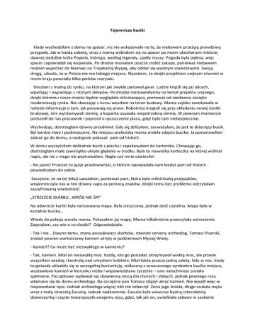 Tajemnicze buciki Kiedy wychodziłam z domu na spacer, nic nie wskazywało na to, że niebawem przeżyję prawdziwą przygodę. Jak w każdą sobotę, wraz z mamą wybrałam się na spacer po moim ukochanym mieście, dawnej siedzibie króla Popiela, którego, według legendy, zjadły myszy. Pogoda była piękna, więc spacer zapowiadał się wspaniale. Po drodze musiałam jeszcze zrobić zakupy, ponieważ niebawem miałam wyjechać do Niemiec na Tropikalną Wyspę, aby oddać się wodnym szaleństwom. Swoją drogą, szkoda, że w Polsce nie ma takiego miejsca. Słyszałam, że dzięki projektom unijnym również w moim kraju powstało kilka parków rozrywki. Doszłam z mamą do rynku, na którym jak zwykle panował gwar. Ludzie kręcili się po ulicach, wpadając i wypadając z różnych sklepów. Po drodze rozmawiałyśmy na temat projektu unijnego, dzięki któremu nasze miasto będzie wyglądało olśniewająco, ponieważ od niedawna zaczęto modernizację rynku. Nie zbaczając z kursu weszłam na teren budowy. Mama szybko zanotowała w notesie informacje o tym, jak posuwają się prace. Robotnicy krzątali się przy układaniu nowej kostki brukowej, inni wyrównywali ziemię, a koparka usuwała niepotrzebną ziemię. W pewnym momencie podszedł do nas pracownik i poprosił o opuszczenie placu, gdyż było tam niebezpiecznie. Wychodząc, dostrzegłam dziwny przedmiot. Gdy się zbliżyłam, zauważyłam, że jest to dziecięcy bucik. Był bardzo stary i podniszczony. Na miejscu znaleziska mama zrobiła zdjęcie bucika. Ja postanowiłam zabrać go do domu, a następnie pokazać pani od historii. W domu wyczyściłam delikatnie bucik z piachu i zapakowałam do kartonika. Chowając go, dostrzegłam małe zawiniątko ukryte głęboko w środku. Była to niewielka karteczka na której widniał napis, ale nic z niego nie pojmowałam. Nagle coś mnie oświeciło! - No jasne! Przecież to język prasłowiański, o którym opowiadała nam kiedyś pani od historii powiedziałam do siebie. Szczęście, że na tej lekcji uważałam, ponieważ pani, która była miłośniczką prajęzyków, wtajemniczyła nas w ten dziwny zapis za pomocą znaków, dzięki temu bez problemu odczytałam zaszyfrowaną wiadomość: „STRZEŻCIE SKARBU…WRÓG NIE ŚPI” Na odwrocie kartki była narysowana mapa. Była zniszczona, jednak dość czytelna. Mapa była w kształcie bucika… Wtedy do pokoju weszła mama. Pokazałam jej mapę. Mama kilkakrotnie przeczytała ostrzeżenie. Zapytałam, czy wie o co chodzi? Odpowiedziała: - Tak i nie… Dawno temu, znany poszukiwacz skarbów, również ceniony archeolog, Tomasz Pisarski, znalazł pewien wartościowy kamień ukryty w podziemiach Mysiej Wieży. - Kamień? Co może być niezwykłego w kamieniu? - Tak, kamień. Miał on niezwykłą moc. Każdy, kto go posiadał, otrzymywał wielką moc, ale przede wszystkim wiedzę i kontrolę nad umysłami ludzkimi. Miał także jeszcze jedną zaletę. Gdy w noc, kiedy to gwiazdy układały się w szczególną koniunkcję, widoczną z oznaczonego symbolem bucika miejsca, wystawiono kamień w kierunku nieba i wypowiedziano życzenie – ono natychmiast zostało spełnione. Początkowo wydawał się zbawienną mocą dla chorych i słabych, jednak pewnego razu włamano się do domu archeologa. Na szczęście pan Tomasz zdążył ukryć kamień. Nie wpadł więc w niepowołane ręce. Jednak archeologa więcej nikt nie zobaczył. Żona jego Aniela, długo szukała męża wraz z małą córeczką Ewunią. Jednak nadaremnie. Ewunia była wówczas bystrą czteroletnią dziewczynką i często towarzyszyła swojemu ojcu, gdyż, tak jak on, uwielbiała zabawy w szukanie skarbów. Gdy po piętnastu latach zmarła matka dziewczynki, Ewa wyjechała z Kruszwicy i więcej nie powróciła do rodzinnego domu. - Musimy go odnaleźć, mamo ! – wykrzyknęłam. - Dobrze, ale musimy być ostrożne… Wielu ludzi poszukuje go od lat, jednak dotąd nikomu nie udało się go odnaleźć. Dla niejednego muzeum ma on ogromną wartość. - Nam się uda mamo, zobaczysz! Mamo, a gdzie znajdowało się miejsce obserwacji nieba? - Wiesz, to chyba zbieg okoliczności, bo właśnie obecnie stoi w tym miejscu Astrobaza przy twojej szkole. Myślę, że to doskonałe położenie na obserwację nieba. Szczęście, że dzięki projektom unijnym oraz zaangażowaniu nauczycieli nasze miasto mogło pozyskać tak cenny obiekt. - To faktycznie dziwny zbieg okoliczności – odpowiedziałam. - Przypominam sobie, jak koleżanka opowiadała mi, że podczas budowy bazy natrafiono na dziwny znak wyryty na kamieniu wykopanym w tym miejscu – mama zamyśliła się. - Niech zgadnę. Był to bucik? – szybko wystrzeliłam. - Tak, kochanie. To był znak w kształcie bucika, a ta mapa wskazuje jego położenie – odpowiedziała mama, po czym poprosiła, żebym położyła się już do łóżka. Wczesnym rankiem usłyszałam pukanie do drzwi. Był to pan Piotr Zdzisławski, kustosz kruszwickiego muzeum. Wpadł do naszego mieszkania jak torpeda krzycząc, że okradziono muzeum przy Mysiej Wieży. Pospiesznie udałyśmy się wraz z mamą na miejsce zdarzenia, gdzie była już policja. Na miejscu dowiedziałyśmy się, że nic nie skradziono. Ta myśl nie dawała mi spokoju, no bo po co ktoś włamuje się do muzeum i nic nie wynosi? Pewnie nie znalazł tego, czego szukał – pomyślałam. Ponieważ już dawno nie oglądałam eksponatów, postanowiłam dokładniej przyjrzeć się gablotom. Gdy dotarłam do pomieszczenia oznaczonego literką X, w którym przygotowywano nowo wykopane eksponaty do wystawy, moim oczom ukazał się zaskakujący widok. Pomyślałam, że to niemożliwe. Przetarłam oczy i jeszcze raz spojrzałam w kierunku stolika, na którym leżał bucik podobny do tego, który poprzedniego dnia znalazłyśmy z mamą. Ponieważ pan Zdzisławski od lat pracował z moją mamą przy wykopaliskach i był dobrym przyjacielem rodziny, postanowiłyśmy wtajemniczyć go w całą 