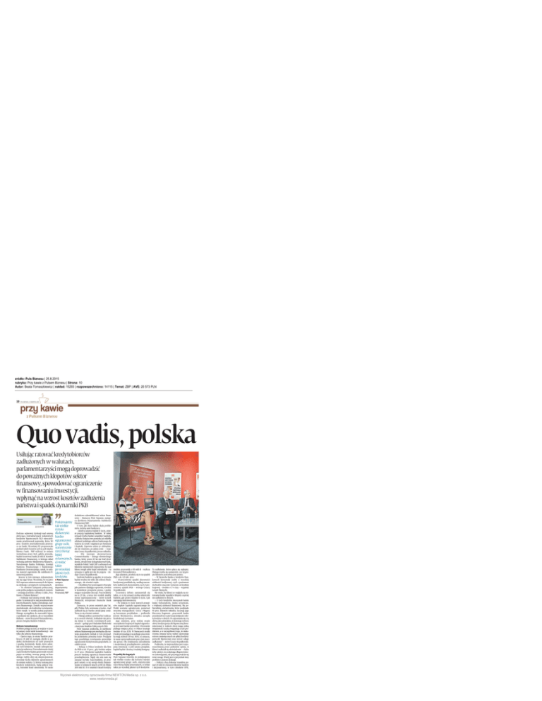 zródło: Puls Biznesu | 25.8.2015 rubryka: Przy kawie z Pulsem Biznesu | Strona: 10 Autor: Beata Tomaszkiewicz | nakład: 15293 | rozpowszechniono: 14115 | Temat: ZBP | AVE: 20 573 PLN 10 PULS BIZNESU, 25 SIERPNIA 2015 Quo vadis, polska Usiłując ratować kredytobiorców zadłużonych w walutach, parlamentarzyści mogą doprowadzić do poważnych kłopotów sektor finansowy, spowodować ograniczenie w finansowaniu inwestycji, wpłynąć na wzrost kosztów zadłużenia państwa i spadek dynamiki PKB Beata Tomaszkiewicz 22-333-97-51 Podczas sejmowej dyskusji nad ustawą dotyczącą restrukturyzacji walutowych kredytów hipotecznych SLD nieoczekiwanie przeforsował poprawkę, która 90 proc. kosztów przewalutowania przerzuca na banki. Wcześniej PO proponowała podział takich kosztów pół na pół między klienta i bank. NBP wyliczył, że zmiana wymyślona przez SLD, gdyby przeszła, będzie kosztować banki 21 mld zł. Komitet Stabilności Finansowej, w którego skład wchodzą szefowie Ministerstwa Finansów, Narodowego Banku Polskiego, Komisji Nadzoru Finansowego i Bankowego Funduszu Gwarancyjnego, uznał, że ustawa stanowi zagrożenie dla stabilności finansowej państwa. Jeszcze w tym miesiącu dokumentem ma się zająć Senat. Wcześniej, bo na jutro SLD zaprasza zainteresowanych do Sejmu na dyskusję o przyjętych rozwiązaniach. — To element kampanii politycznej, a nie próba podjęcia racjonalnych rozmów — uważają uczestnicy debaty z cyklu „Przy Kawie z Pulsem Biznesu”. — Dyskusje nad ustawą trwały kilka tygodni. Uczestniczyli w niej przedstawiciele resortu finansów, banku centralnego, nadzoru finansowego. Zostały wypracowane niedoskonałe, ale konkretne rozwiązania, które runęły w wyniku jednej poprawki. Dlatego wystąpiłem do marszałek Sejmu o spotkanie nie z jednym, ale ze wszystkimi klubami — mówi Krzysztof Pietraszkiewicz, prezes Związku Banków Polskich. Bolesne konsekwencje Problem polega na tym, że wejście w życie tej ustawy rodzi wiele konsekwencji — nie tylko dla sektora finansowego. — Oprócz tego, że strata banków przekroczy 21 mld zł, nastąpią ubytki w podatku dochodowym od osób prawnych i spadną dywidendy. Banki, które udzielały tych kredytów, musiały zabezpieczyć pozycję walutową. Przewalutowanie dużej części kredytów będzie generowało wysoki popyt na walutę, tworząc presję na kurs złotego. Gdyby złoty się zdeprecjonował, wzrośnie liczba klientów uprawnionych do zmiany waluty. Ci, którzy zostaną przy kredycie walutowym, będą spłacać więcej, wzrośnie koszt umorzenia. To może Podejmujemy tak wielkie ryzyko dla korzyści bardzo ograniczonej grupy osób, statystycznie rzecz biorąc lepiej sytuowanych, co widać także po wysokiej jakości tych kredytów. Piotr Szpunar zastępca dyrektora Departamentu Stabilności Finansowej NBP dodatkowo zdestabilizować sektor finansowy — tłumaczy Piotr Szpunar, zastępca dyrektora Departamentu Stabilności Finansowej NBP. O tym, jak duża będzie skala problemów, mówią sami bankowcy. — Jeżeli ta ustawa wejdzie w życie, zmieni pozycję kapitałową banków. W takiej sytuacji trzeba będzie uzupełnić kapitały, a debata i księżycowe pomysły już osłabiły zdolność polskiego sektora bankowego do wyjścia na rynek i sięgnięcia po fundusze i kapitały. Zapewne sektor je zdobędzie, ale nie wiadomo, po jakiej cenie — wyjaśnia Cezary Stypułkowski, prezes mBanku. — Dla naszego akcjonariusza Commerzbanku — dużego niemieckiego banku, który przez 20 lat nie brał dywidendy, dwukrotnie dokapitalizował bank, wysłał do Polski 7 mld CHF z zebranych od klientów niemieckich depozytów, by nasi klienci mogli sobie kupić mieszkania — ta sytuacja w ogóle jest nie do pojęcia — dodaje Cezary Stypułkowski. Szefowie banków są zgodni, że sytuacja będzie trudna nie tylko dla sektora finansowego, ale również rządu. — Chcieliśmy być postrzegani w Europie jako państwo działające sprawnie, również w kontekście przepisów prawa, i podejmujące racjonalne decyzje. Pracowaliśmy na to 25 lat, a teraz ten wysiłek miałby zostać zaprzepaszczony — mówi Leszek Niemycki, wiceprezes Deutsche Bank Polska. Zaznacza, że przez ostatnich pięć lat, gdy Polska była notowana wysoko, rząd zadłużał się po bardzo atrakcyjnej cenie. Teraz to się również zmieni. — Dlatego politycy powinni być rozliczani ze swoich obietnic, dokładnie tak jak to się dzieje w wysoko rozwiniętych państwach — apeluje prof. Radosław Markowski z Instytutu Studiów Politycznych PAN. Piotr Szpunar podkreśla, że stabilność sektora finansowego jest niezbędna dla rozwoju gospodarki. Jednak w tym przypadku poniesiemy poważny koszt. Przyjęcie tego poselskiego rozwiązania spowoduje ograniczenie kredytowania gospodarki, co osłabi wzrost. — Relacja w Polsce kredytów dla firm do PKB to ok. 15 proc., gdy średnia unijna to 37 proc. Obniżenie kapitałów banków jeszcze bardziej ograniczy finansowanie przedsiębiorstw. Nigdy nie uda nam się zasypać tej luki. Szacowaliśmy, że przyjęcie ustawy w tej wersji obniży finansowanie w kolejnych latach od 80 do blisko 200 mld zł. A w ostatnich latach kredyty średnio przyrastały o 50 mld zł — wylicza Krzysztof Pietraszkiewicz. Jego zdaniem, przełoży się to na spadek PKB o ok. 0,5 pkt. proc. — 10-procentowy spadek aktywności kredytowej przekłada się, według szacunków niektórych ekonomistów, na 0,3-procentowy spadek PKB — wtóruje Cezary Stypułkowski. Uczestnicy debaty zastanawiali się także, co w tej sytuacji zrobią właściciele banków, gdy prawo wejdzie w życie, i jak zareagują inni inwestorzy. — Po wejściu w życie nowych przepisów napływ kapitału zagranicznego do Polski zostanie ograniczony, ponieważ stracimy wiarygodność. Grecy i Węgrzy są koronnym przykładem — podkreśla Jeremi Mordasewicz, doradca zarządu Konfederacji Lewiatan. Jego zdaniem, przy niskiej 