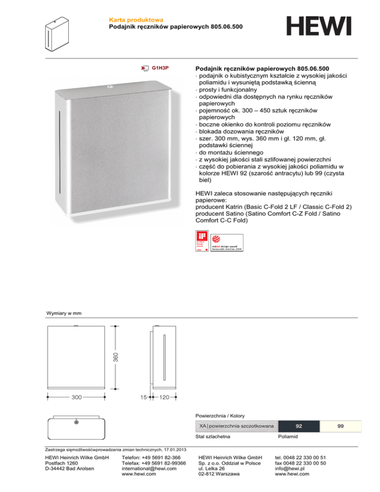 Karta produktowa Podajnik ręczników papierowych 805.06.500 G1H3P Podajnik ręczników papierowych 805.06.500 ⋅ podajnik o kubistycznym kształcie z wysokiej jakości poliamidu i wysuniętą podstawką ścienną ⋅ prosty i funkcjonalny ⋅ odpowiedni dla dostępnych na rynku ręczników papierowych ⋅ pojemność ok. 300 – 450 sztuk ręczników papierowych ⋅ boczne okienko do kontroli poziomu ręczników ⋅ blokada dozowania ręczników ⋅ szer. 300 mm, wys. 360 mm i gł. 120 mm, gł. podstawki ściennej ⋅ do montażu ściennego ⋅ z wysokiej jakości stali szlifowanej powierzchni ⋅ część do pobierania z wysokiej jakości poliamidu w kolorze HEWI 92 (szarość antracytu) lub 99 (czysta biel) HEWI zaleca stosowanie następujących ręczniki papierowe: producent Katrin (Basic C-Fold 2 LF / Classic C-Fold 2) producent Satino (Satino Comfort C-Z Fold / Satino Comfort C-C Fold) Wymiary w mm Powierzchnia / Kolory XA | powierzchnia szczotkowana Stal szlachetna 92 Poliamid Zastrzega sięmożliwośćwprowadzania zmian technicznych, 17.01.2013 HEWI Heinrich Wilke GmbH Postfach 1260 D-34442 Bad Arolsen Telefon: +49 5691 82-366 Telefax: +49 5691 82-99366 [email protected] www.hewi.com HEWI Heinrich Wilke GmbH Sp. z o.o. Oddział w Polsce ul. Lelka 26 02-812 Warszawa tel. 0048 22 330 00 51 fax 0048 22 330 00 50 [email protected] www.hewi.com 99